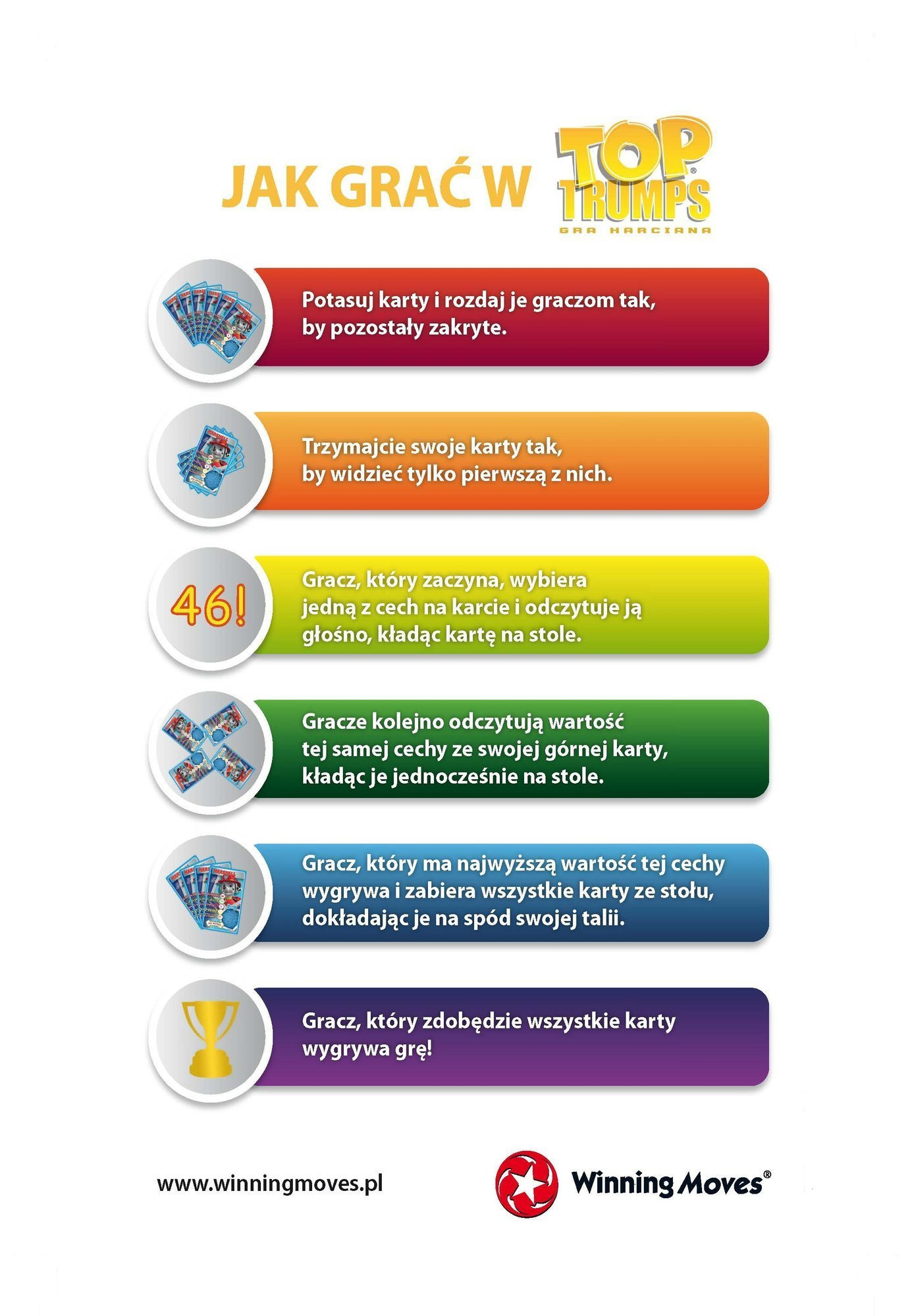 Top Trumps wurden vor mehr als einem halben Jahrhundert gegründet. Ein leichtes und lustiges Kartenspiel für die ganze Familie. Die Regeln sind sehr einfach. Wir brauchen mindestens zwei Spieler unter denen wir die gemischten Karten austeilen werden. Jedes von ihnen hat 5 verschiedene Merkmale, die durch einen numerischen Wert definiert sind. Wir sehen uns die erste Karte an und der Spieler wählt nach dem Geber aus, welches Merkmal wir vergleichen werden. Wer den höchsten Wert für ein bestimmtes Merkmal hat, sammelt alle Karten. Das Spiel geht weiter, bis alle Karten an einen Spieler gehen, der dann der Gewinner ist. Das Set besteht aus 33 Karten in einer praktischen Plastikverpackung, die es Ihnen ermöglicht, die Karten überallhin mitzunehmen.