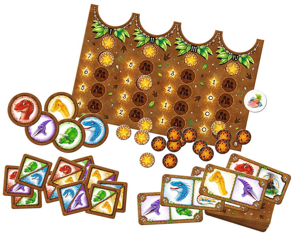 Die Dinosaurierkarten sind so angeordnet, dass die Gegner nicht die Oberhand gewinnen können, während sie versuchen, sie mit Lava und Leckereien zu vereiteln.