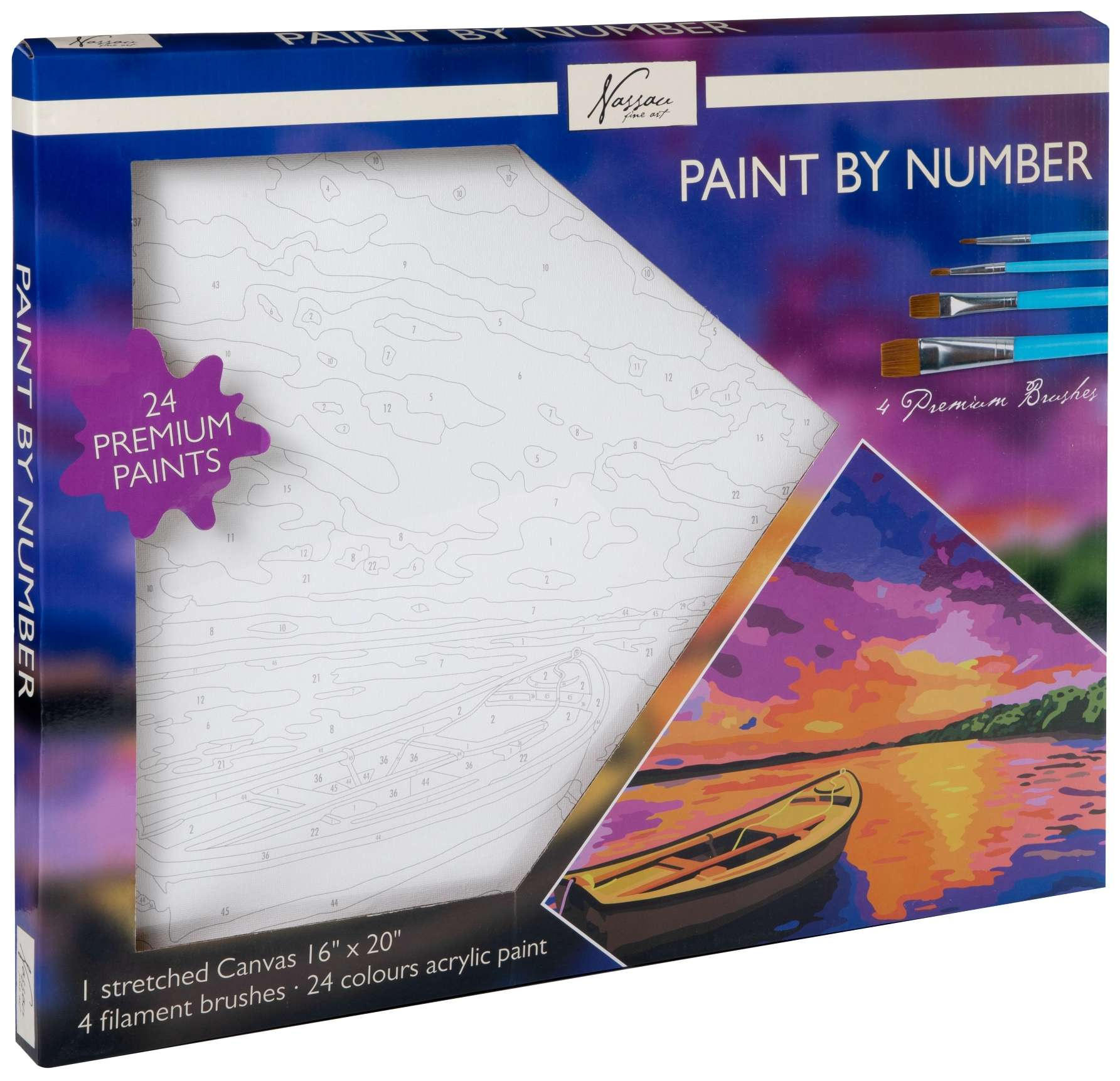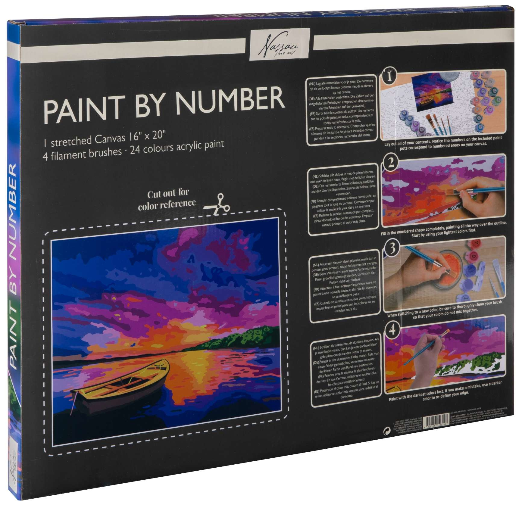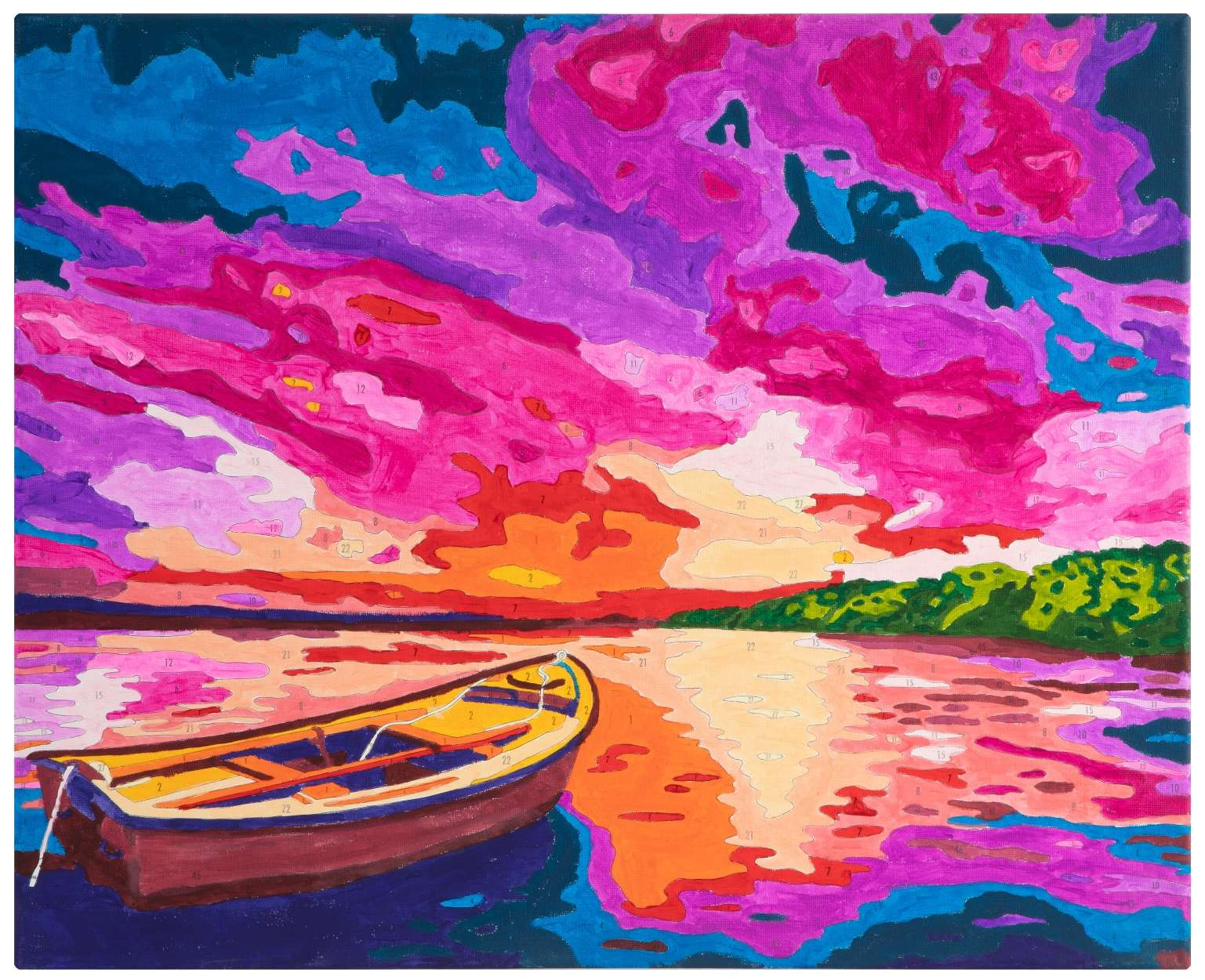 Malen nach Zahlen erinnert an die Malbücher, die wir alle aus unserer Kindheit kennen, und zeigt aufgespannt auf einen Holzrahmen leinwand mit unterteilten und nummerierten Sektoren wobei cjede Zahl entspricht einer bestimmten Farbe, die zur Einfärbung dieses Feldes verwendet werden muss. Wenn jeder Sektor umrissen ist, entsteht ein wunderschönes Bild, das an die Wand im Zimmer gehängt werden kann.