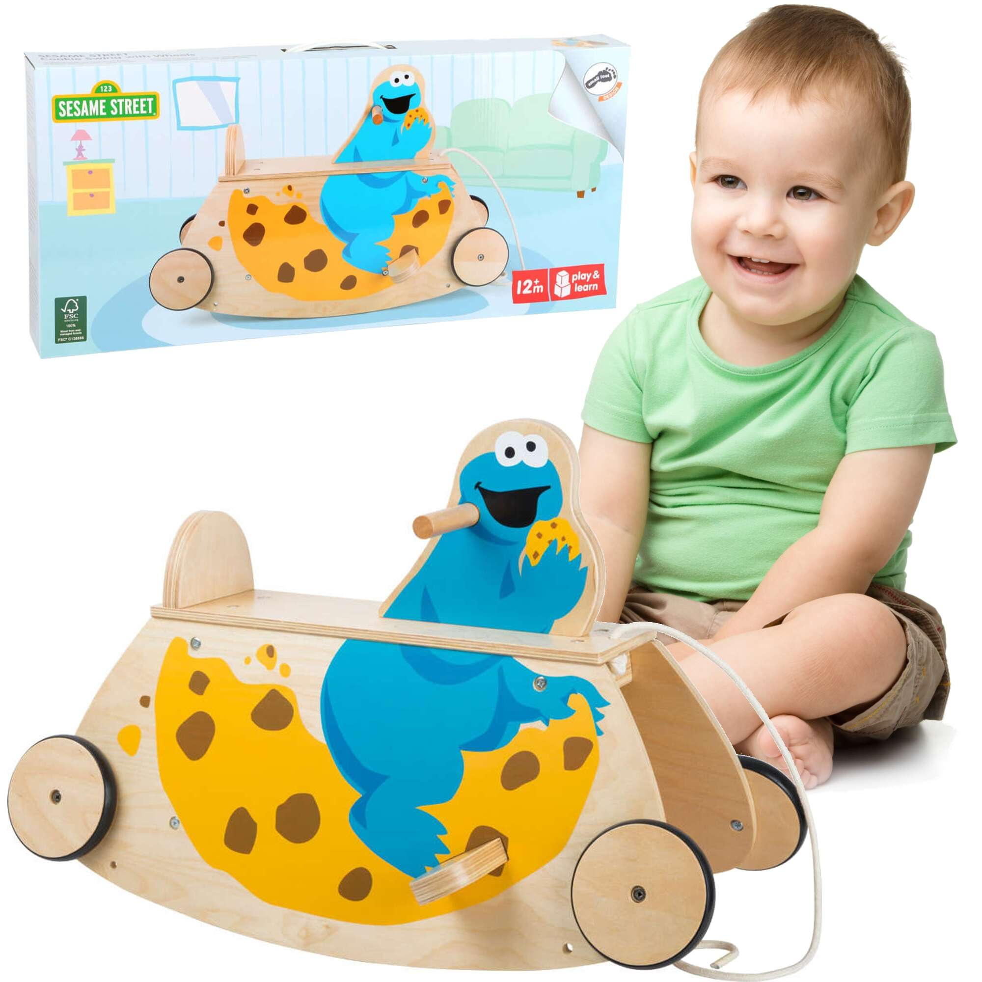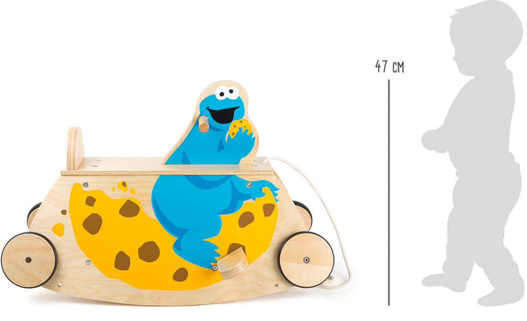 Der Schaukelstuhl ist aus Holz und stellt die bekannte Sesamstraßen-Figur Cookie Monster dar. Er hat einen Griff, an dem sich das Kind festhalten kann, und einen Platz zum Abstützen der Füße.