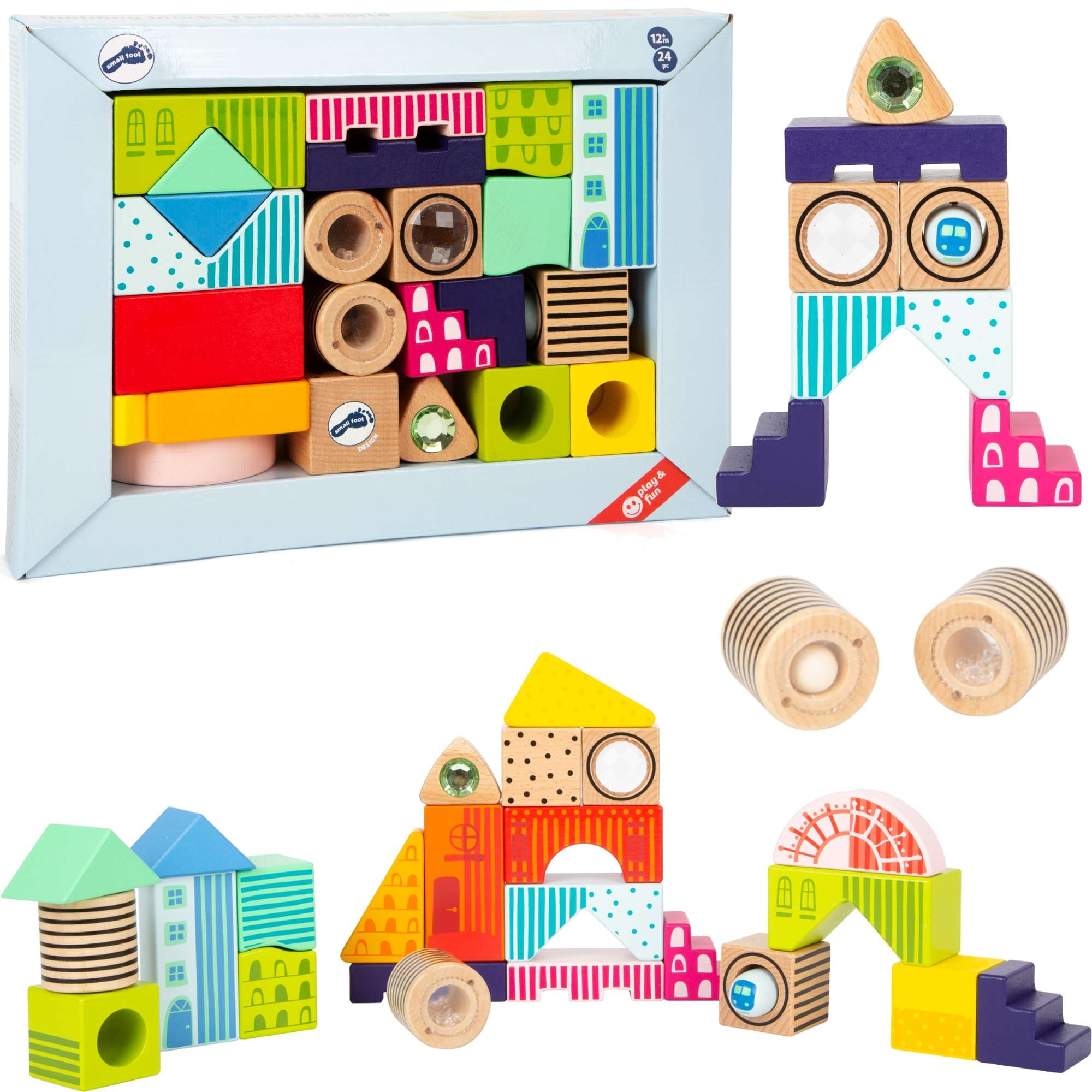 Das Set besteht aus 24 Holzteilen, leicht zu greifen und ideal für Kinderhände. Blöcke haben visuelle und taktile Effekte, Rasseln, Prismen, bunte Farben und Formen.