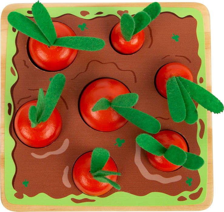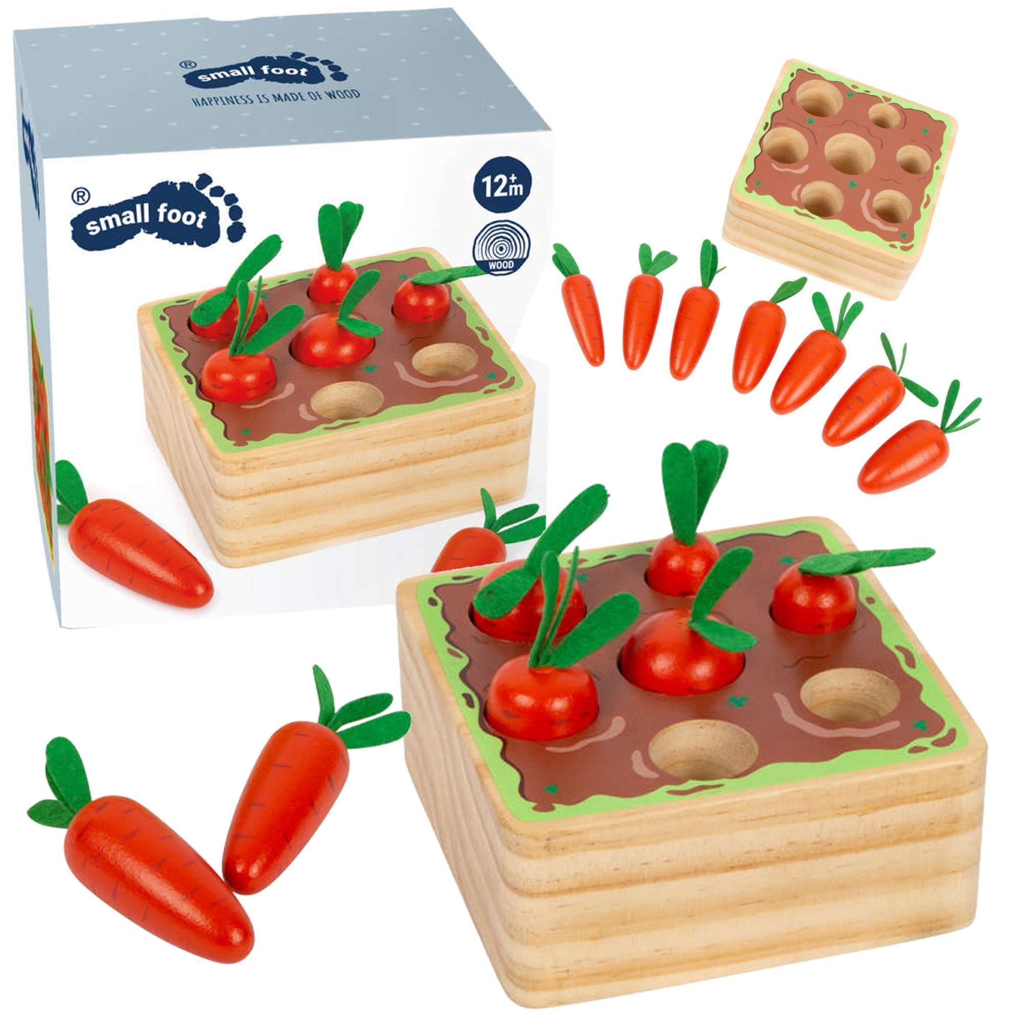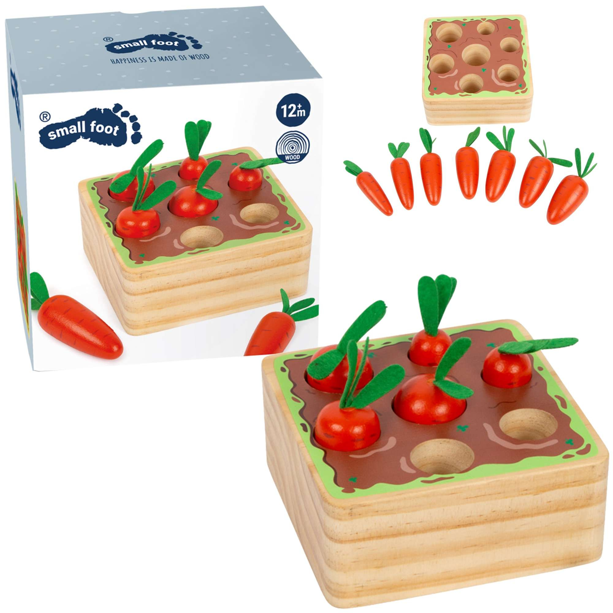 • Small Foot 12212 Möhrensortierer aus Holz Der Sortierer ist aus Holz gefertigt und hat die Form eines Gartenbeetes. Die Aufgabe des Kindes ist es, sieben unterschiedlich große Karotten durch die entsprechenden Löcher zu sortieren.