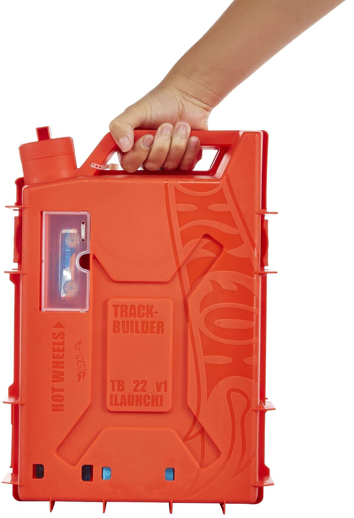 - Set enthält Hot Wheels Stunt Box und ein Spielzeugauto. Die Box hat die Form eines Kanisters und enthält die Schienenteile und das Zubehör für den Bau der Struktur.