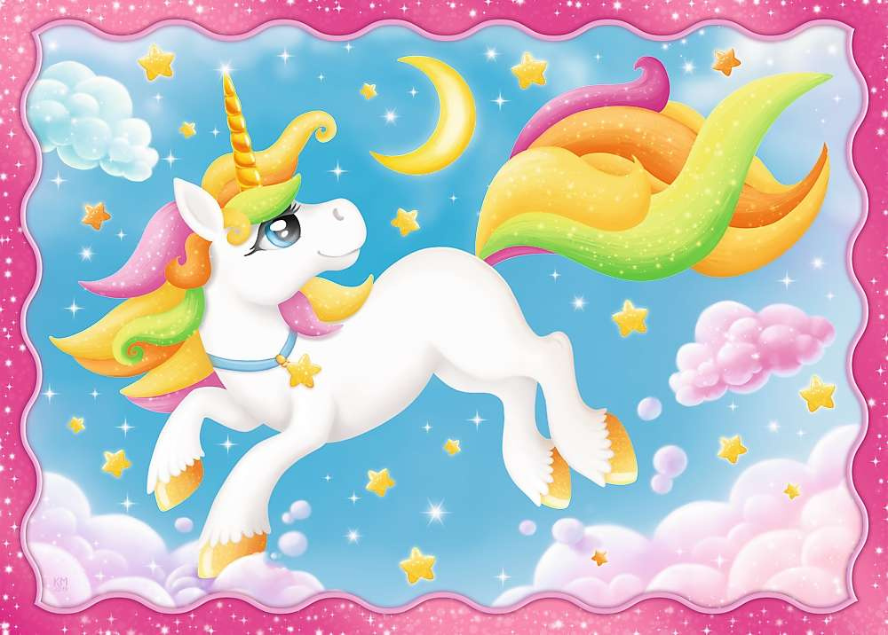 Einhörner und magische Puzzlespiele besteht aus 4 separaten Farbbildern mit unterschiedlicher Anzahl von Elementen. Sie zeigen liebenswerte Einhörner an verschiedenen Orten. Jedesjedes zusammengesetzte Bild misst 28,5 x 20,5 cm.