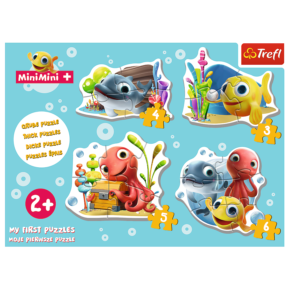 - Das Set besteht aus 4 Puzzles mit unterschiedlicher Anzahl von Teilen. Die Bilder zeigen einen MiniMini-Fisch und seine Freunde.