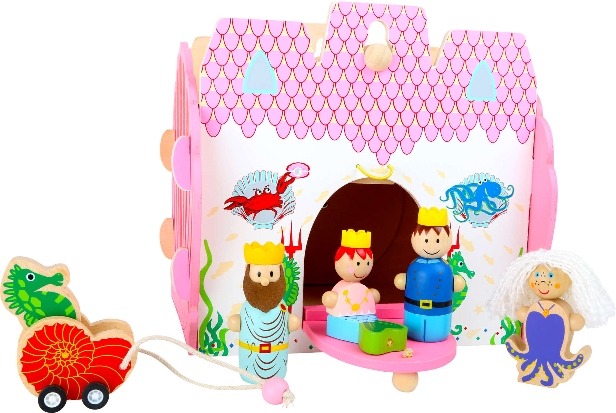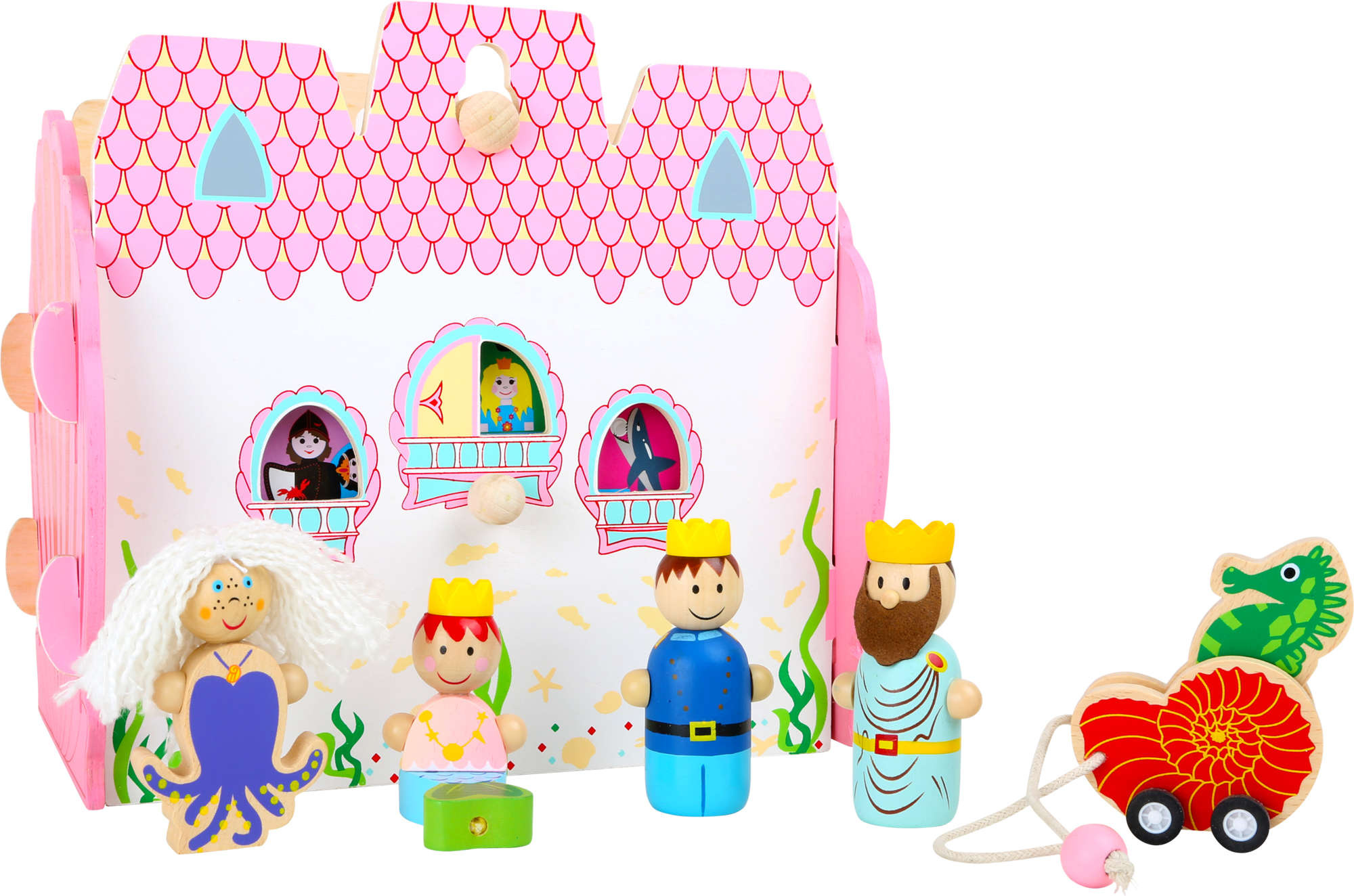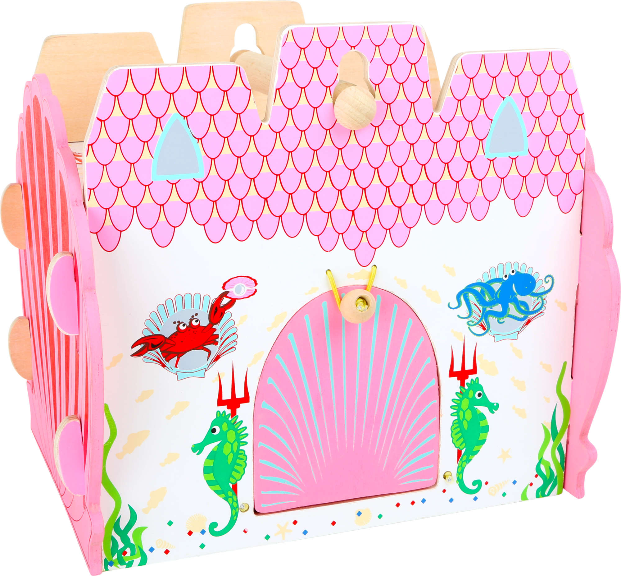 Dieses Spielhaus mit Meeresmotiven lässt sich leicht zusammenbauen und wird jedes Kind begeistern. Das Schloss hat eine zu öffnende Tür, die mit einem Gummiband und einer Holzperle geschlossen werden kann. Das Set enthält auch Holzfiguren