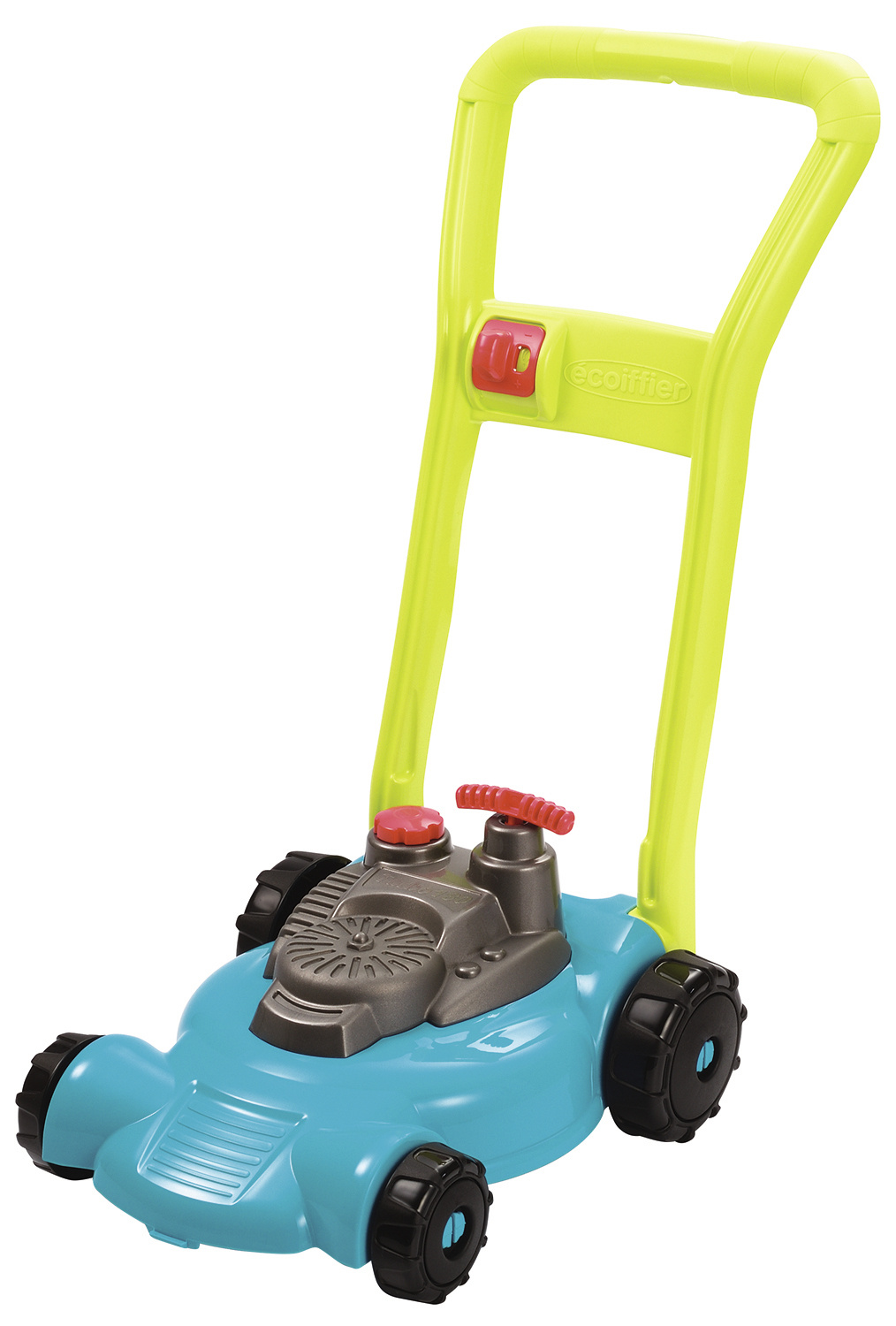 Der Mäher ist in Türkisgrün. Sie hat einen Griff, der etwa 47 cm lang ist, und vier schwarze Kreise. Die Räder sind beweglich, damit sich die Geräte auf verschiedenen Oberflächen bewegen können. Das Innere des Rasenmähers ist hohl, wodurch er ein geringes Gewicht hat, das für Kinder geeignet ist. Mäher ausgestattet mit nachahmung eines Betriebsartenschalters, wie auch rot ruck, der, wenn er in das entsprechende Loch gesteckt und gezogen wird, einen charakteristischen Ton abgibt.