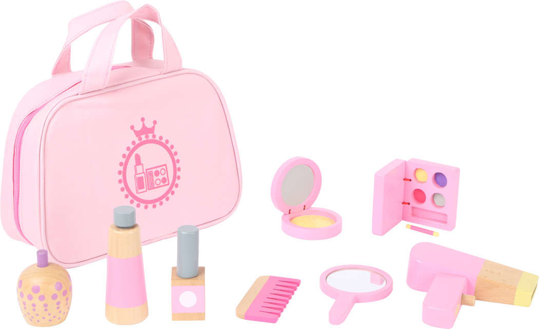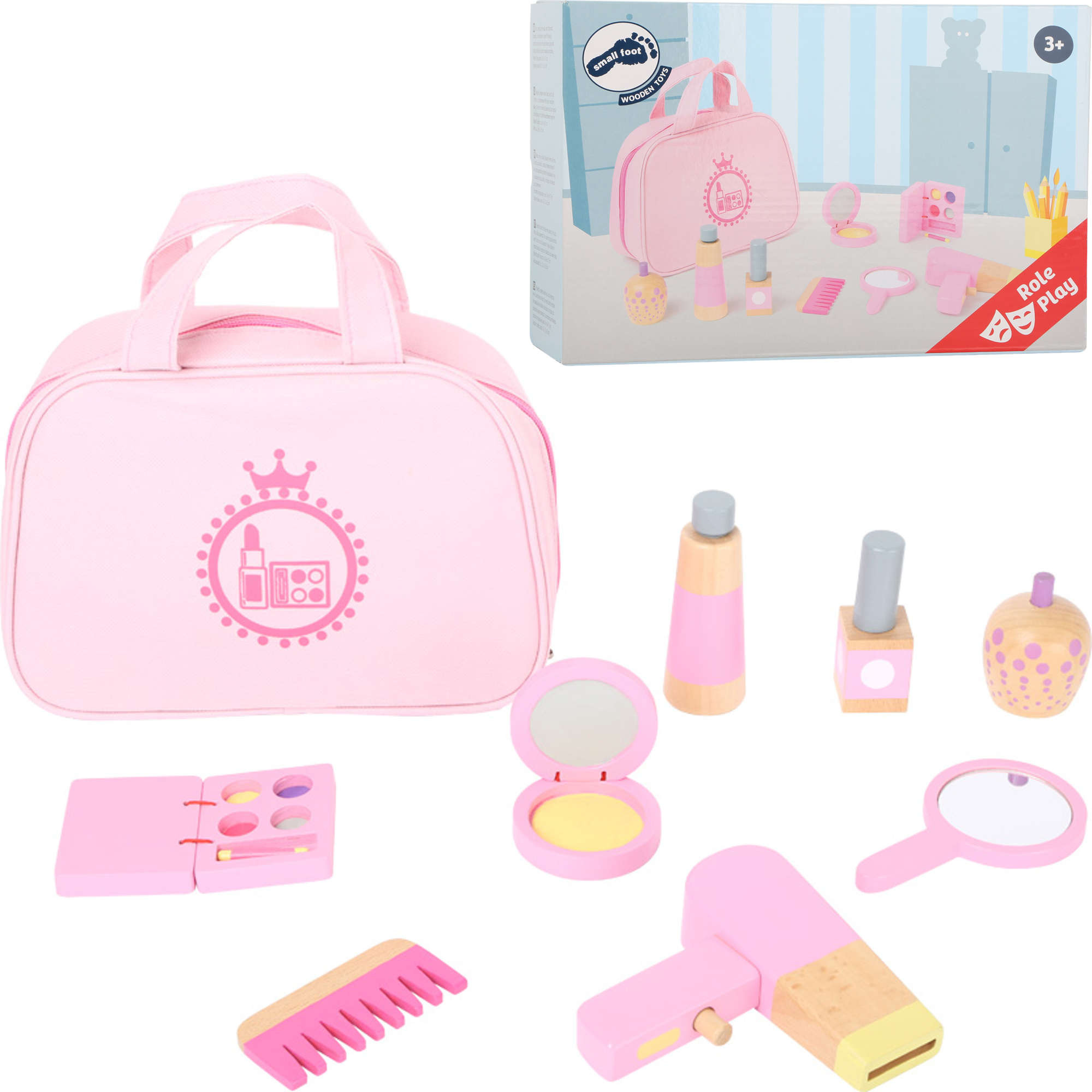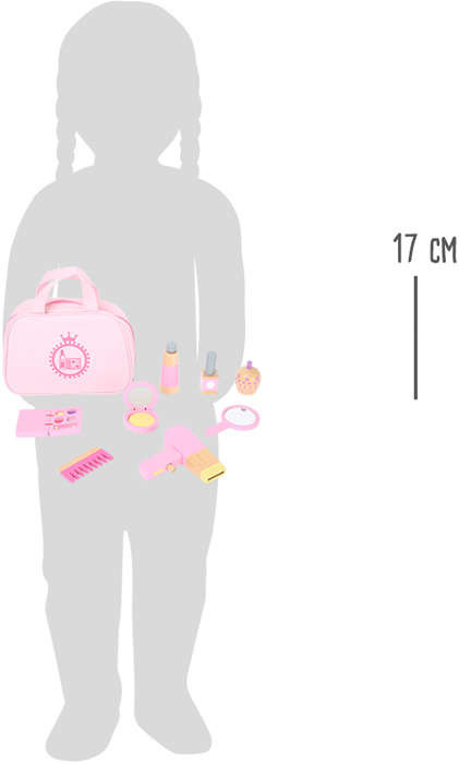 Das Set besteht aus einer rosafarbenen Schminktasche aus Stoff, die verschiedene Accessoires und Kosmetika aufnehmen kann.
