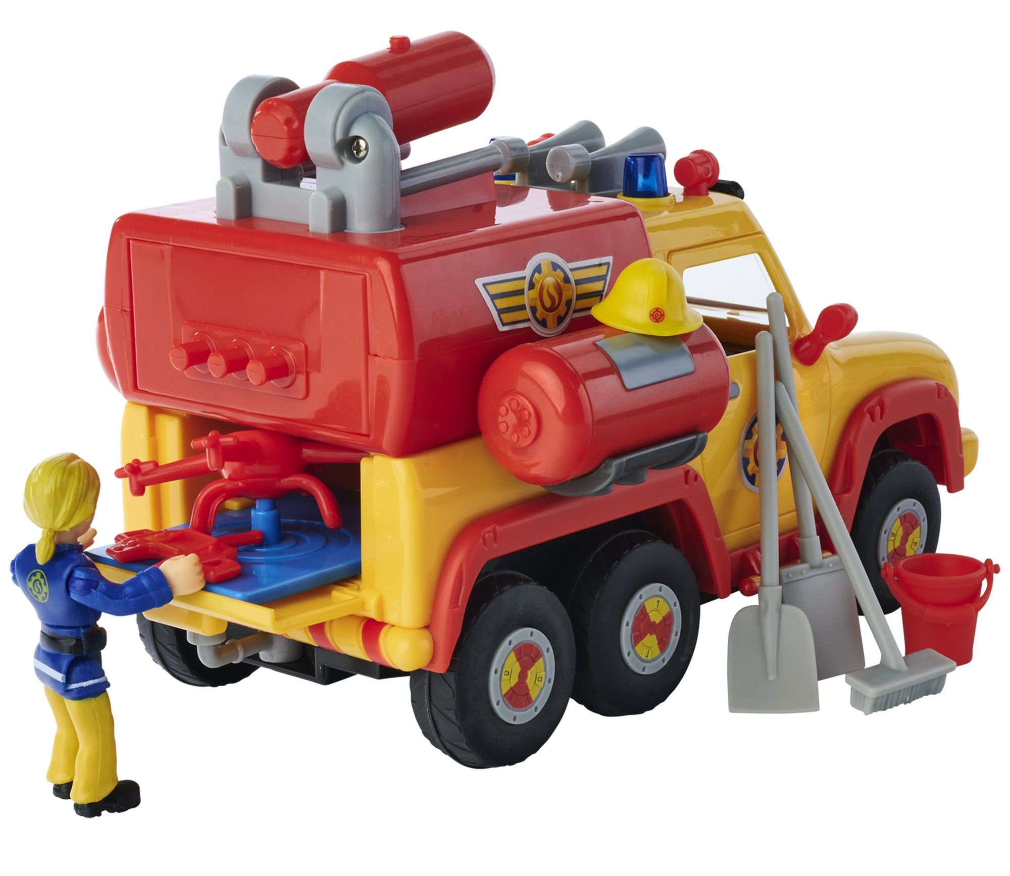 Das Venus-Feuerwehrauto wurde in den charakteristischen Farben von Feuerwehrmann Sam gestaltet - rot und gelb. Das Fahrzeug ist mit sechs Gummirädern ausgestattet, dank derer es sich nicht nur leicht, sondern auch stabil auf jeder ebenen Fläche bewegt. Das Auto hat eine zu öffnende Seitentür und einen zu öffnenden Anhänger, in dem allerlei Zubehör für Rettungseinsätze untergebracht werden kann.