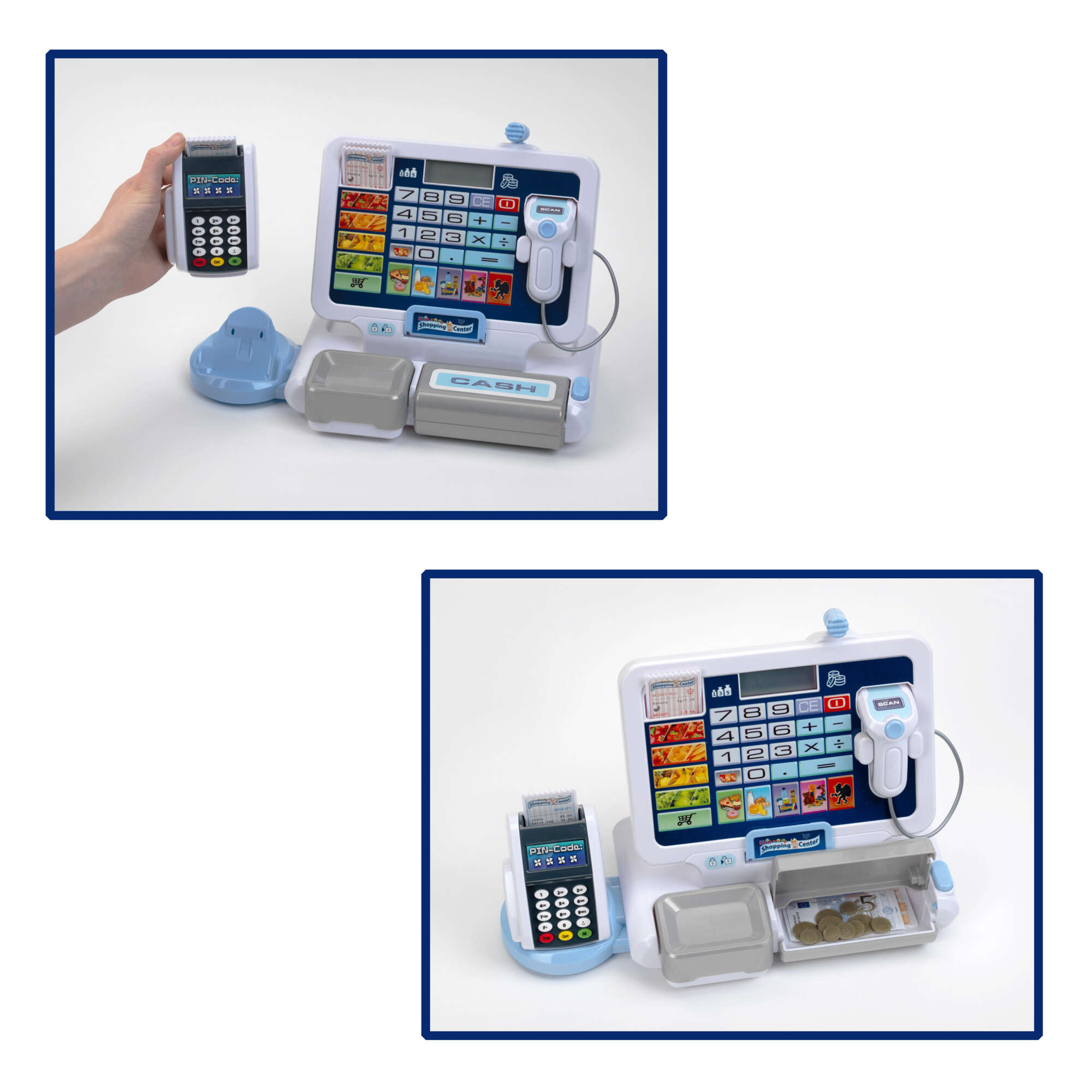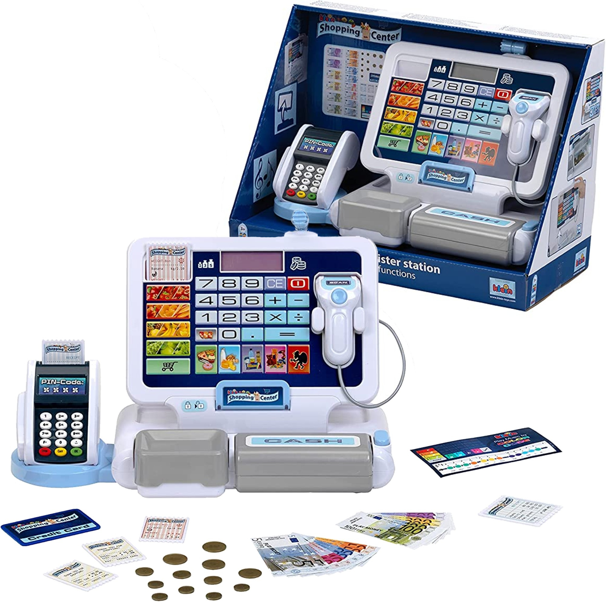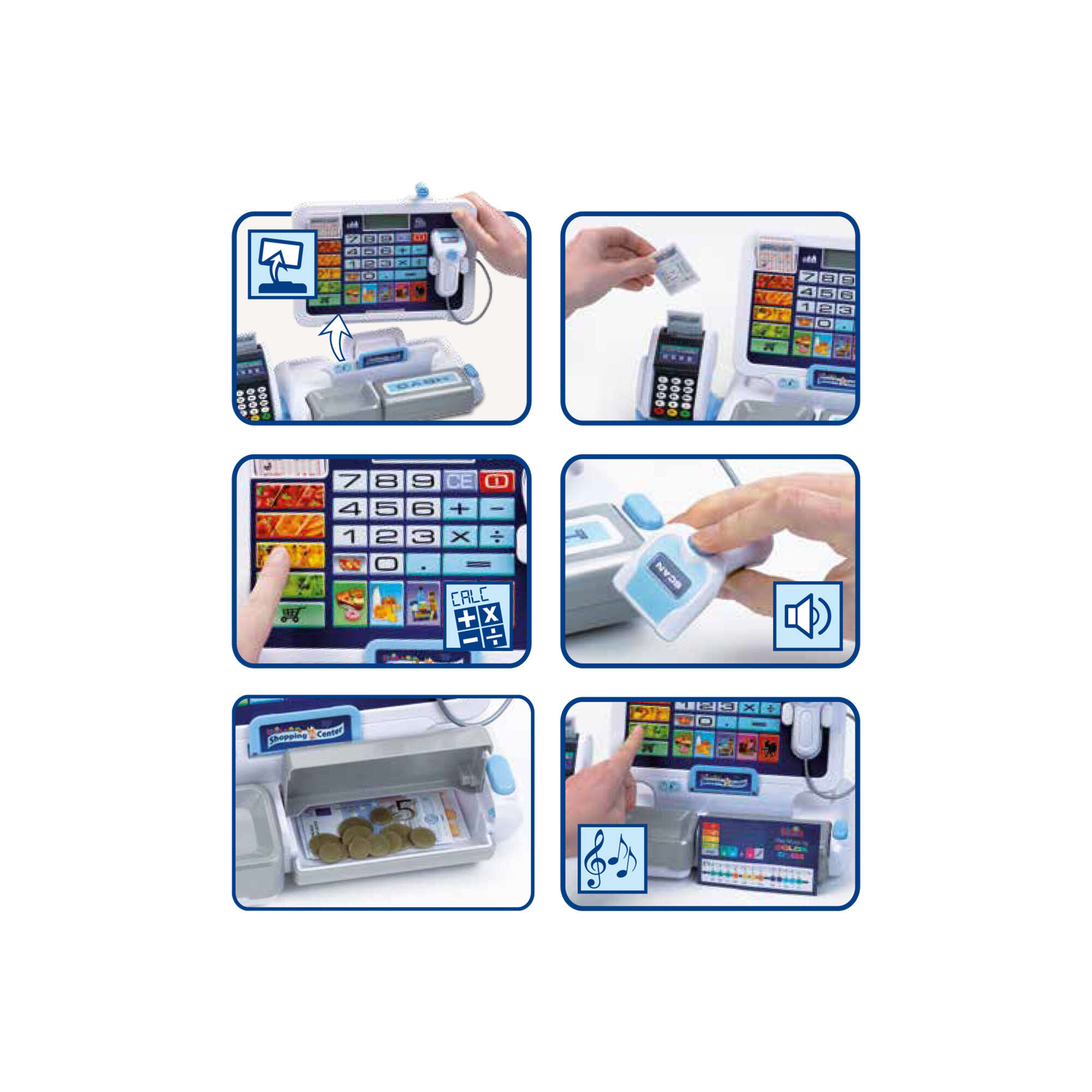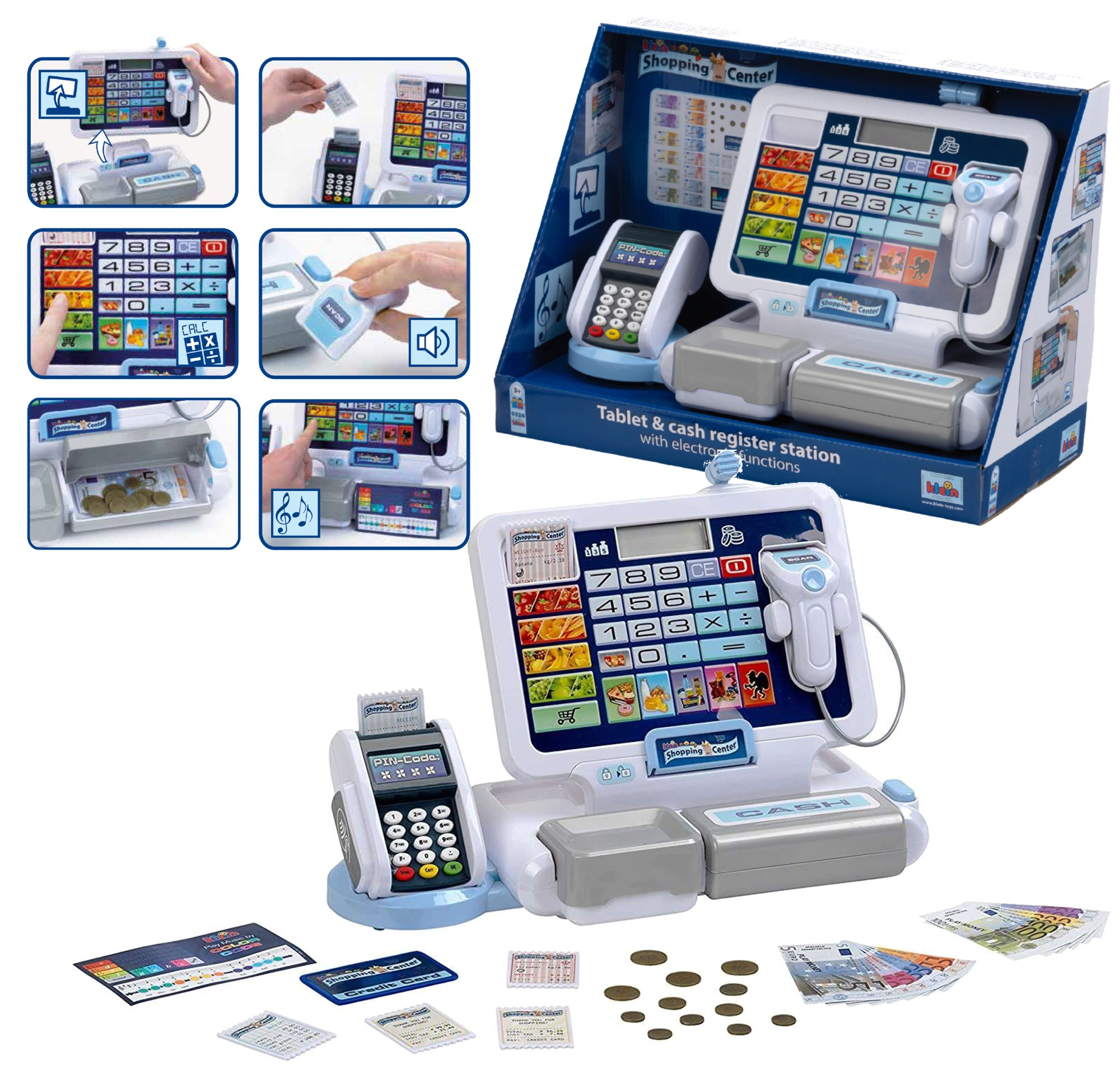 Die Spielzeugkasse hat alle wichtigen Elemente und Funktionen eines echten Geräts dieser Art: eine Waage, ein Kartenlesegerät und eine Kasse, die sich per Knopfdruck öffnen lässt. Im Inneren ist Platz für Münzen und Geldscheine. Die Kinder können ihre Waren einscannen, den Preis auf der elektronischen Displaytastatur eingeben und den Computer alles zusammenzählen lassen, um es an den Kunden auszugeben. Das Geldfach öffnet sich mit dem typischen Kassengeräusch und knackt mit Wechselgeld, aber man kann auch mit einer Karte bezahlen.