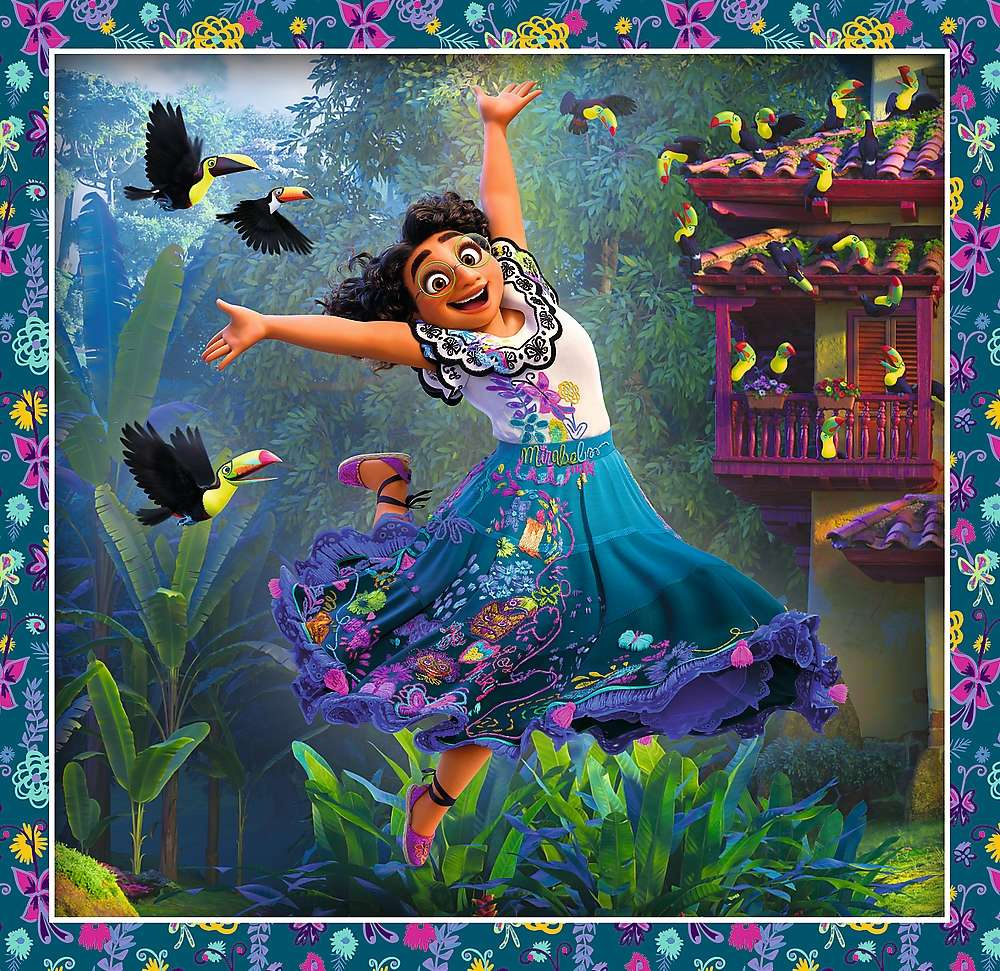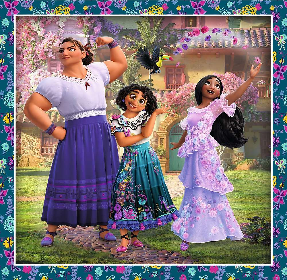 Magisches Encanto-Helden-Puzzleset besteht aus 3 separaten Farbbildern mit unterschiedlicher Anzahl von Elementen und macht es möglich, die Bilder von die Hauptfiguren des Animationsfilms "Encanto" - die Mirabel Madrigal, Isabela Madrigal, Antonio Madrigal und Luisa Madrigal . Jedeskachelbild hat abmessungen 20 x 19,5 cm.