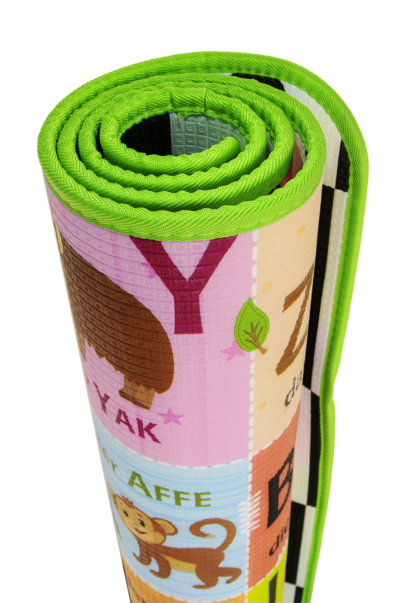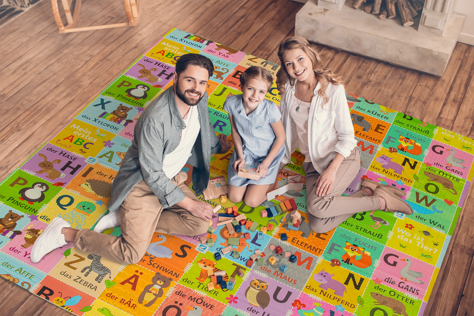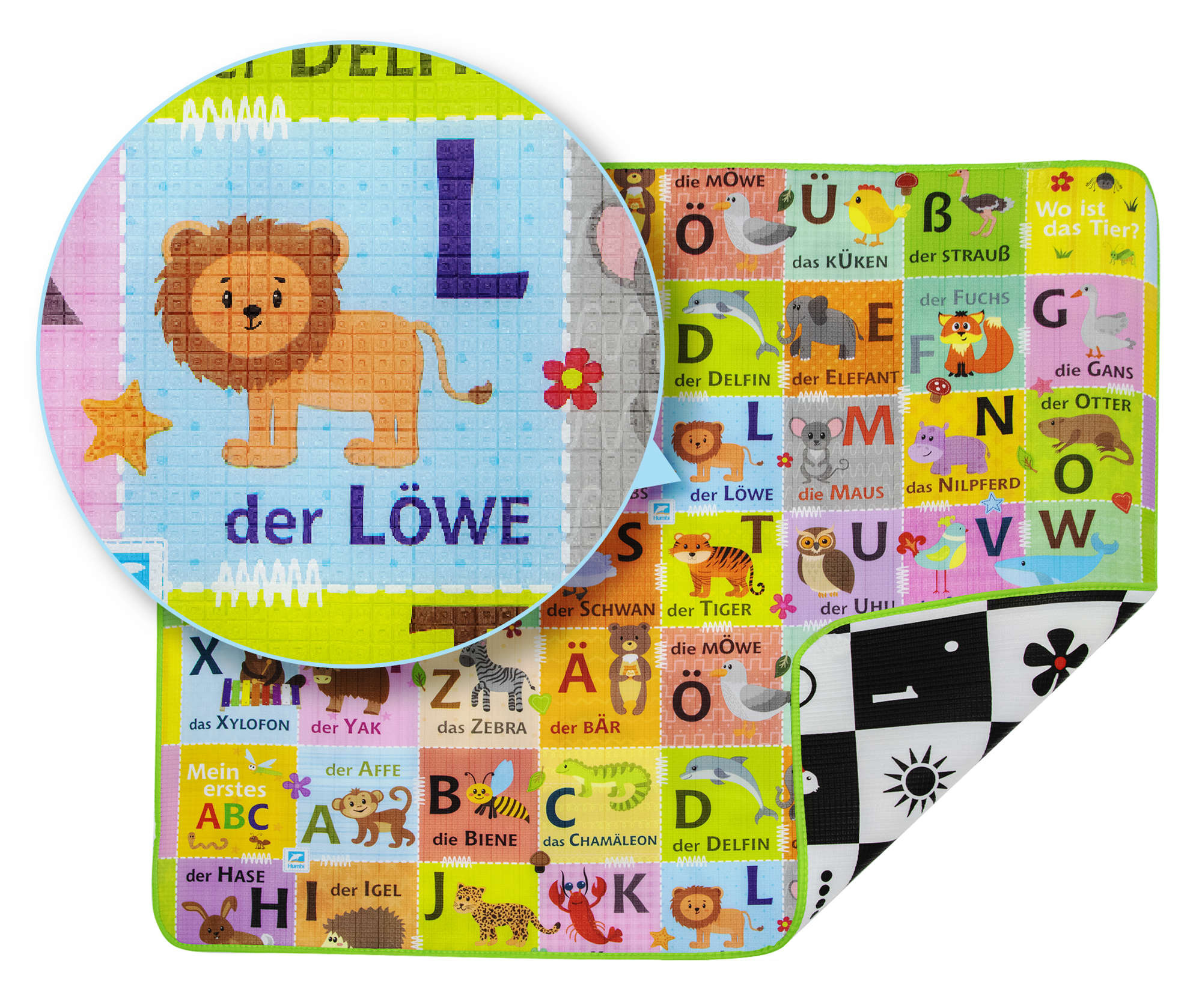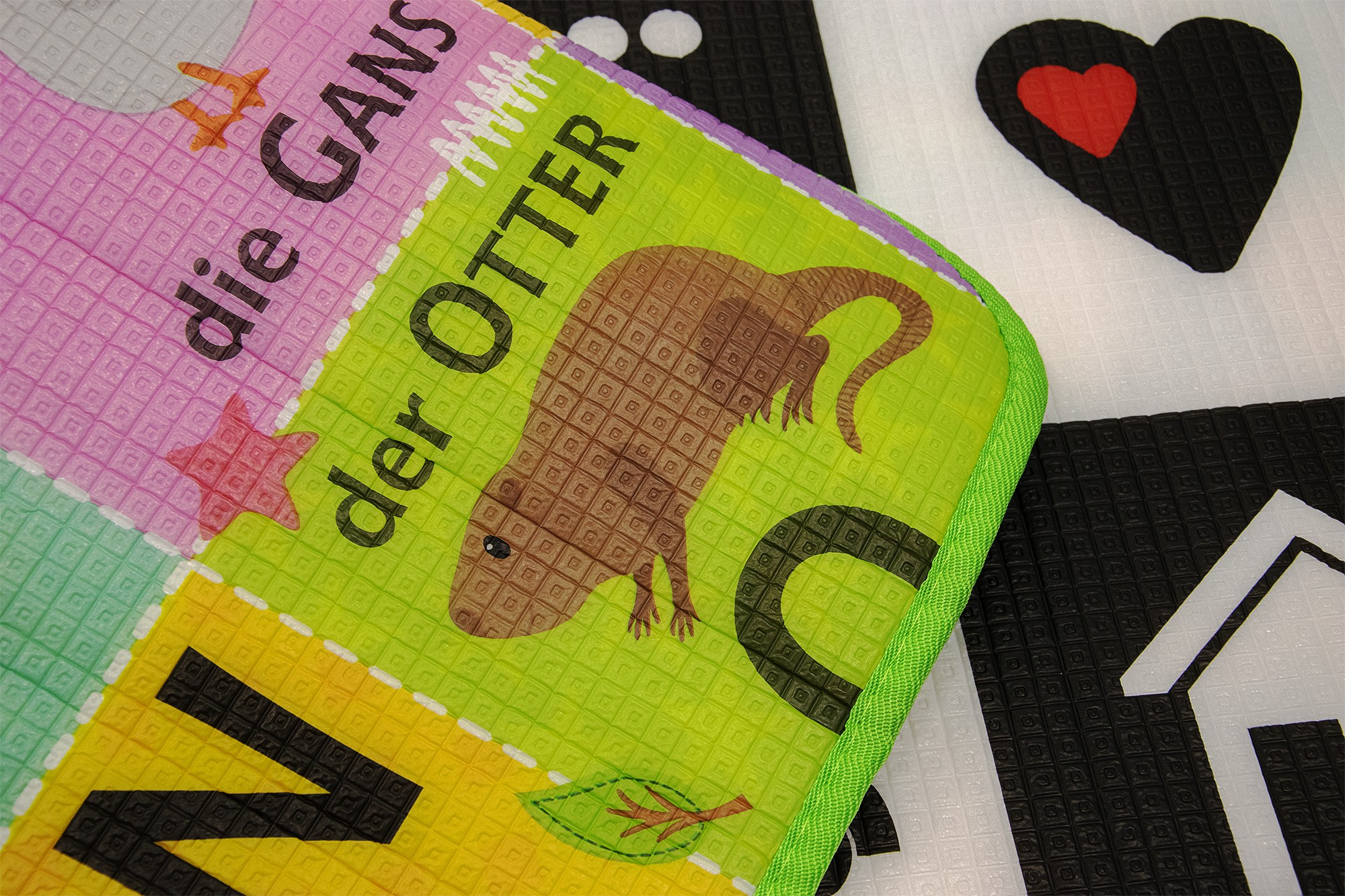 Die bunte Seite der Matte dient dazu, die Buchstaben des Alphabets anhand der Namen von freundlichen Tieren zu lernen. Das Alphabet umfasst alle deutschen Buchstaben, und Tiere aus aller Welt wecken die Neugier des Kindes und werden Teil des Lernspielplatzes.