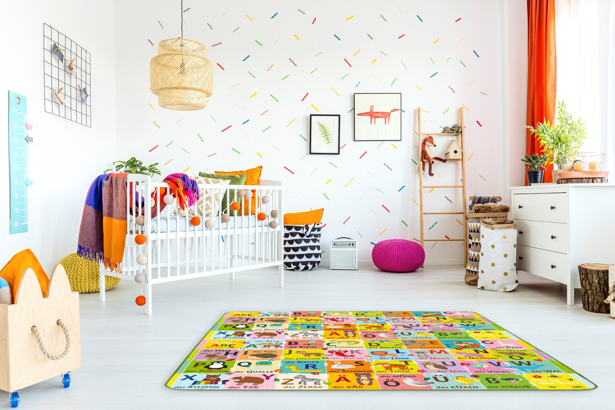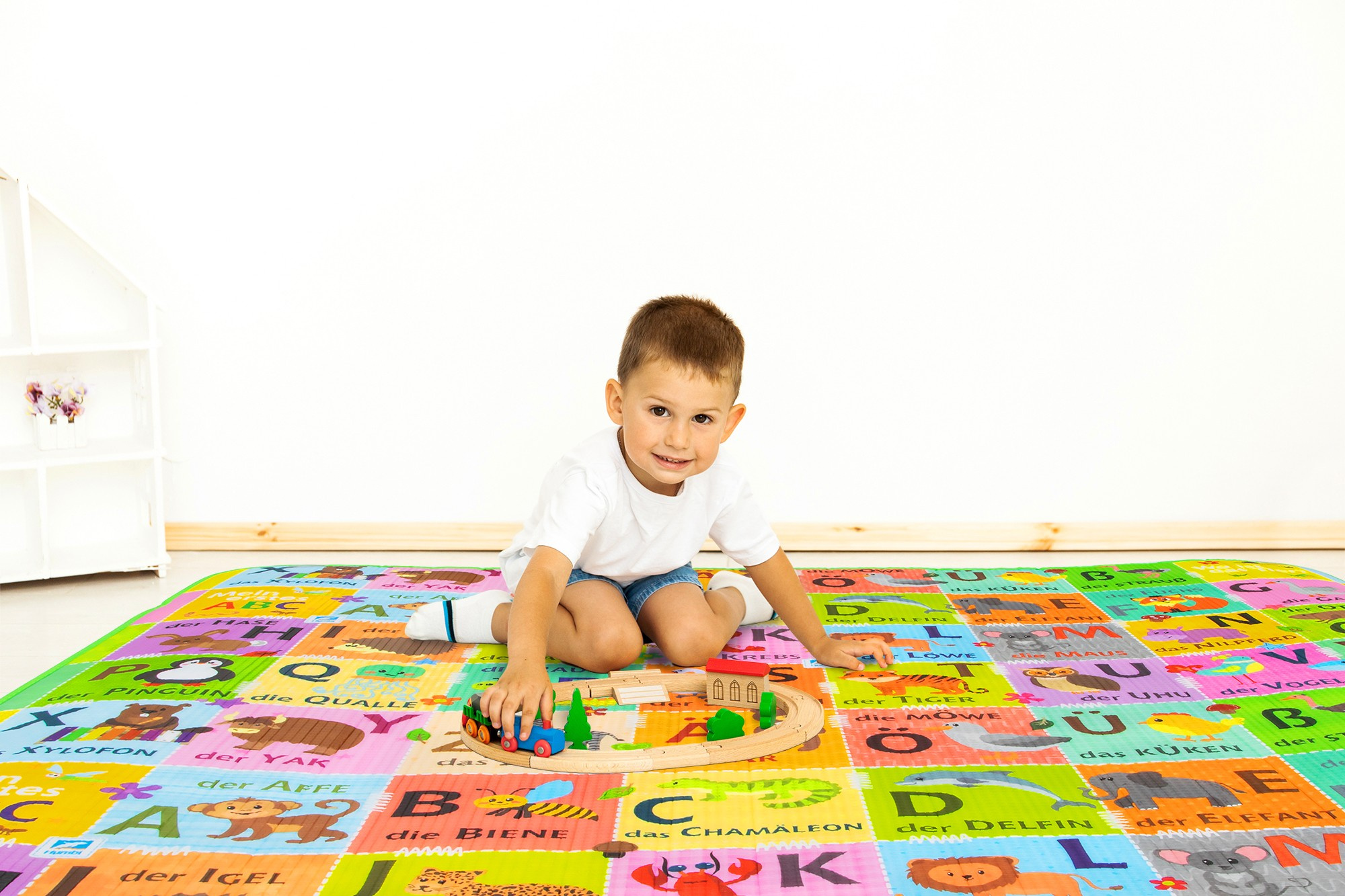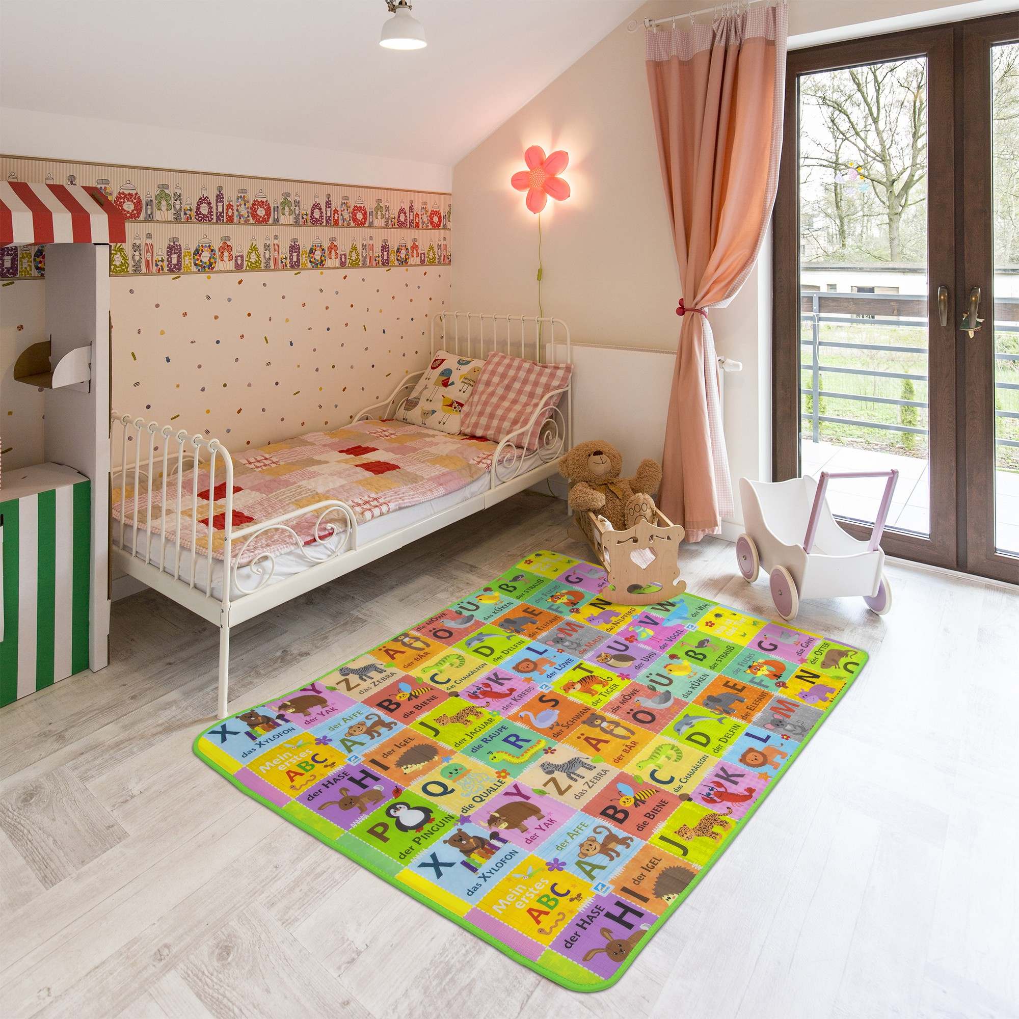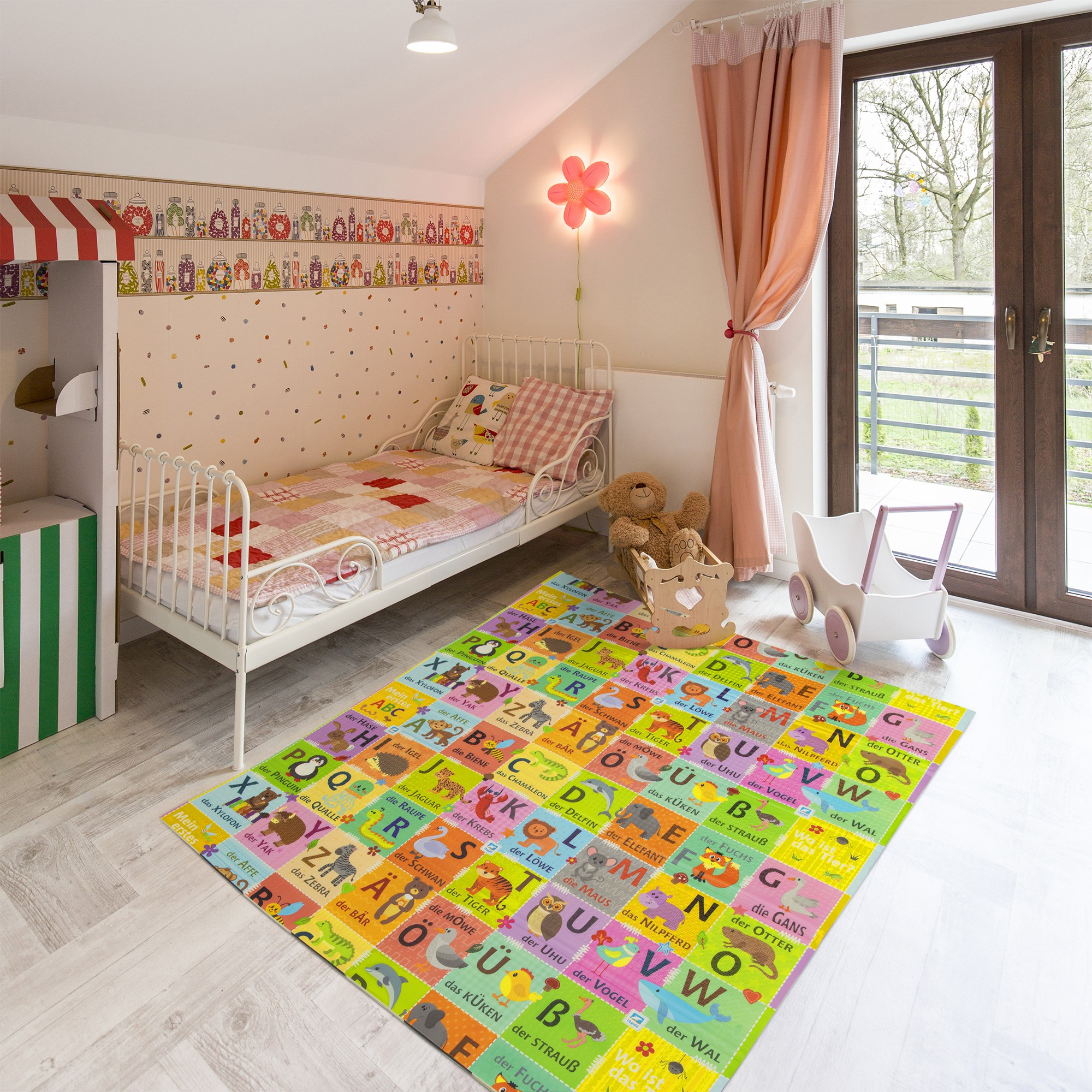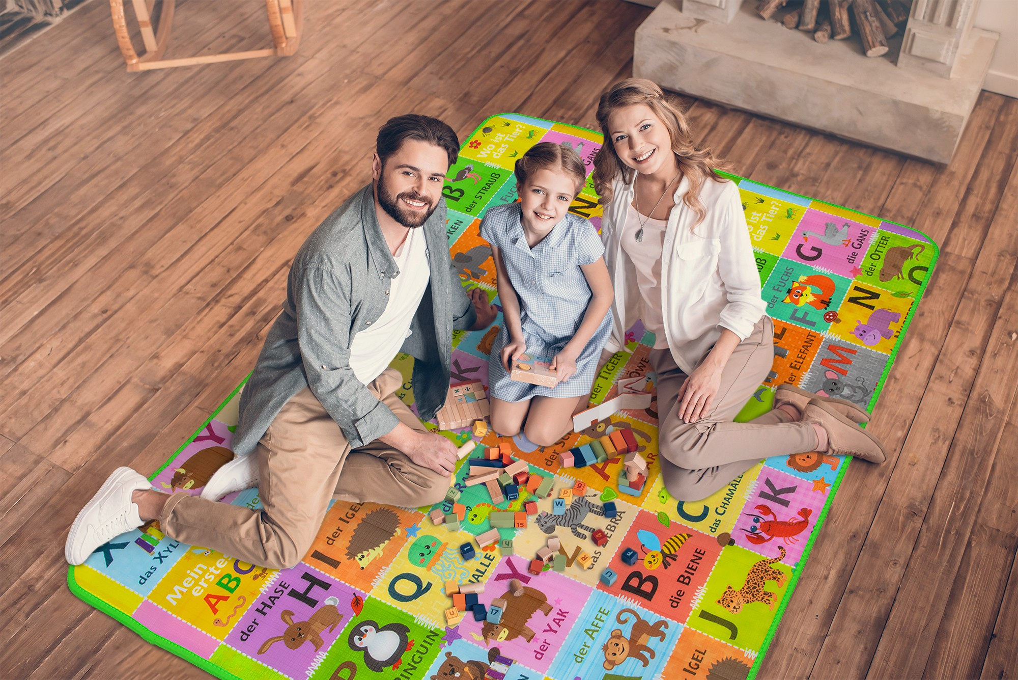 Die bunte Seite der Matte dient dazu, die Buchstaben des Alphabets anhand der Namen von freundlichen Tieren zu lernen. Das Alphabet umfasst alle deutschen Buchstaben, und Tiere aus aller Welt wecken die Neugier des Kindes und werden Teil des Lernspielplatzes.
