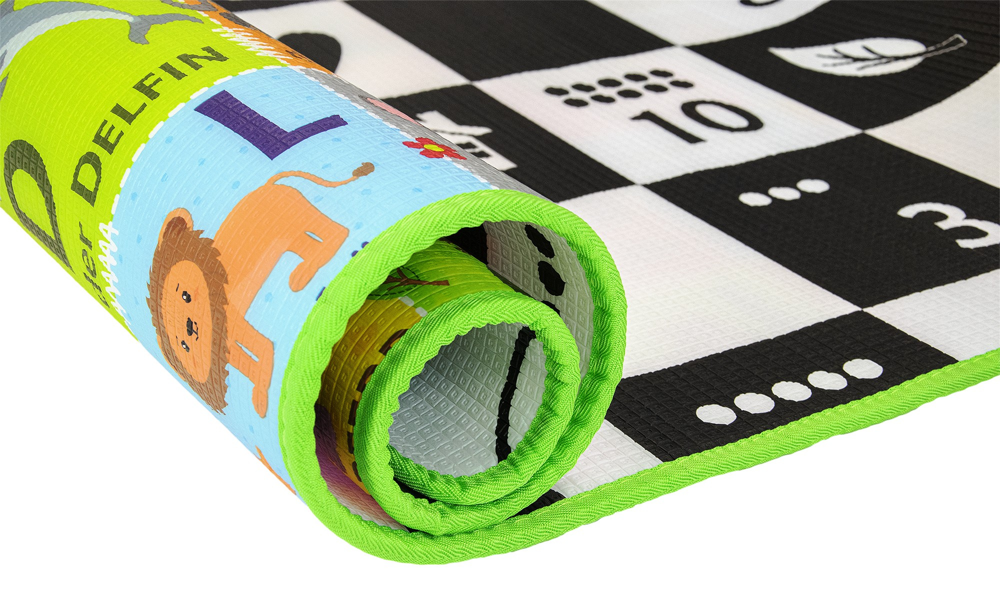- Die 3-in-1-Schaumstoff-Schachbrettmatte von Humbi ist eine ideale weiche Unterlage zum Spielen mit Ihrem Baby. Das große Format der Matte, 150 x 180 cm x 1 cm, macht sie zu einem bequemen und sicheren Platz zum Spielen.
