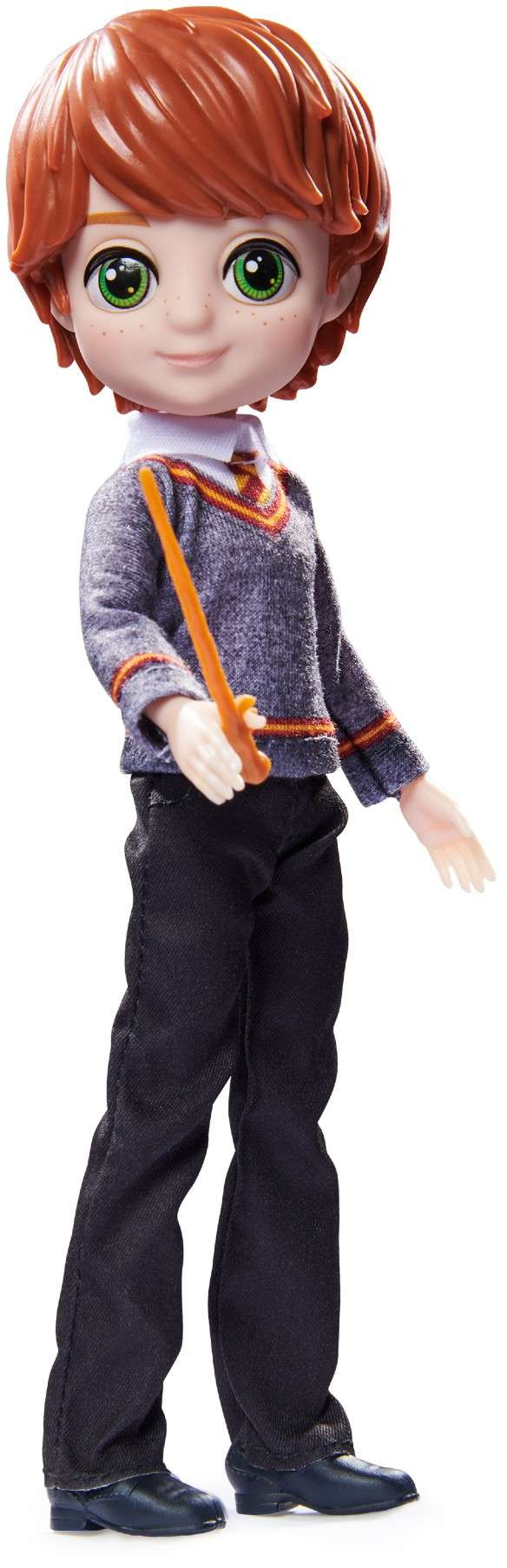 - Ron Weasley hat rote Plastikhaare und grüne Augen. Auf seiner Nase trägt er eine markante runde Brille. Er trägt eine Uniform Hogwartsu, mit den Farben von Gryfindor. In seiner Hand hält er einen Zauberstab. Die Puppe ist 20 cm lang.