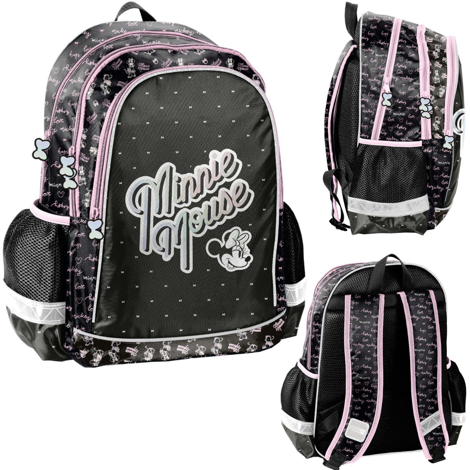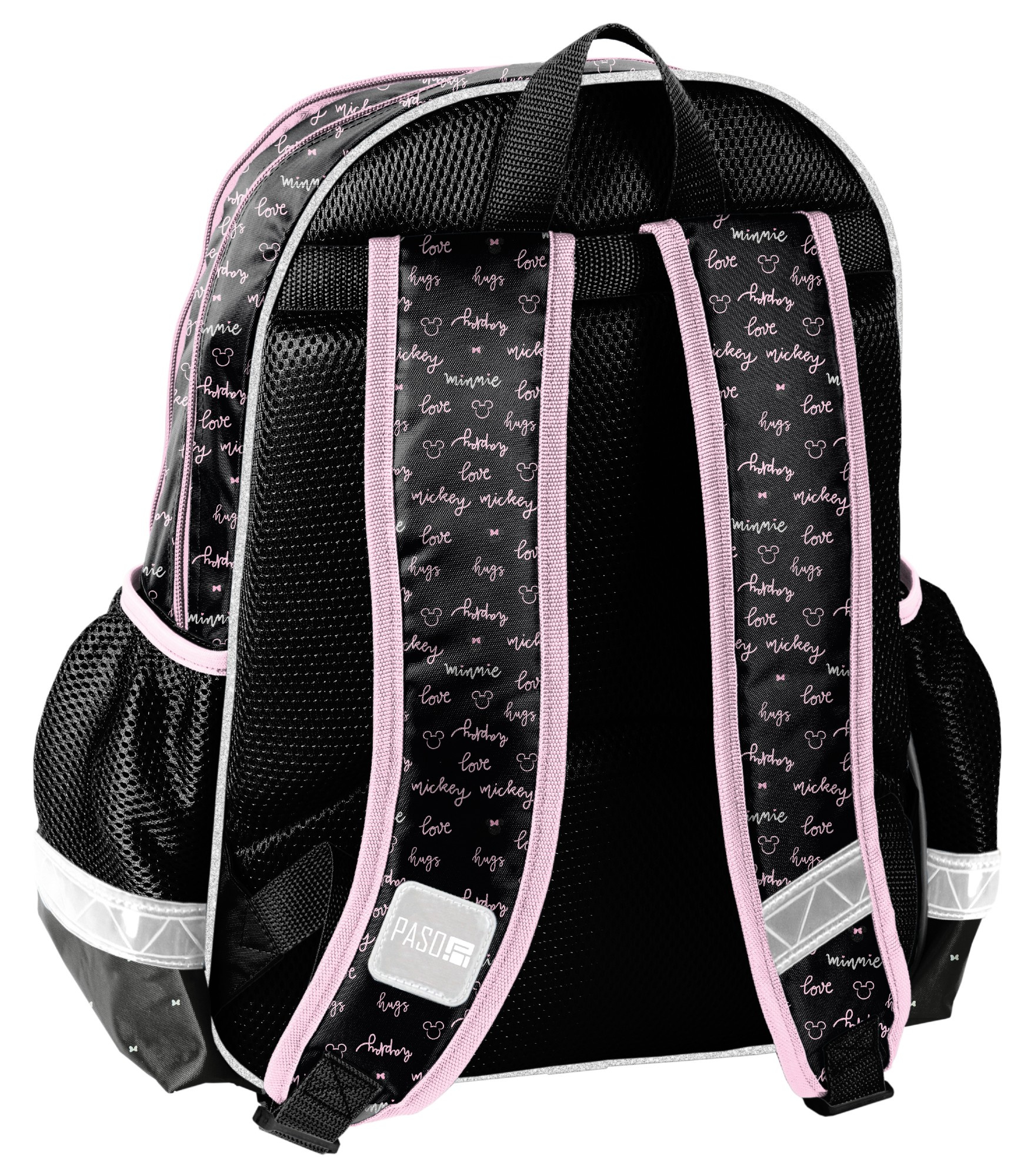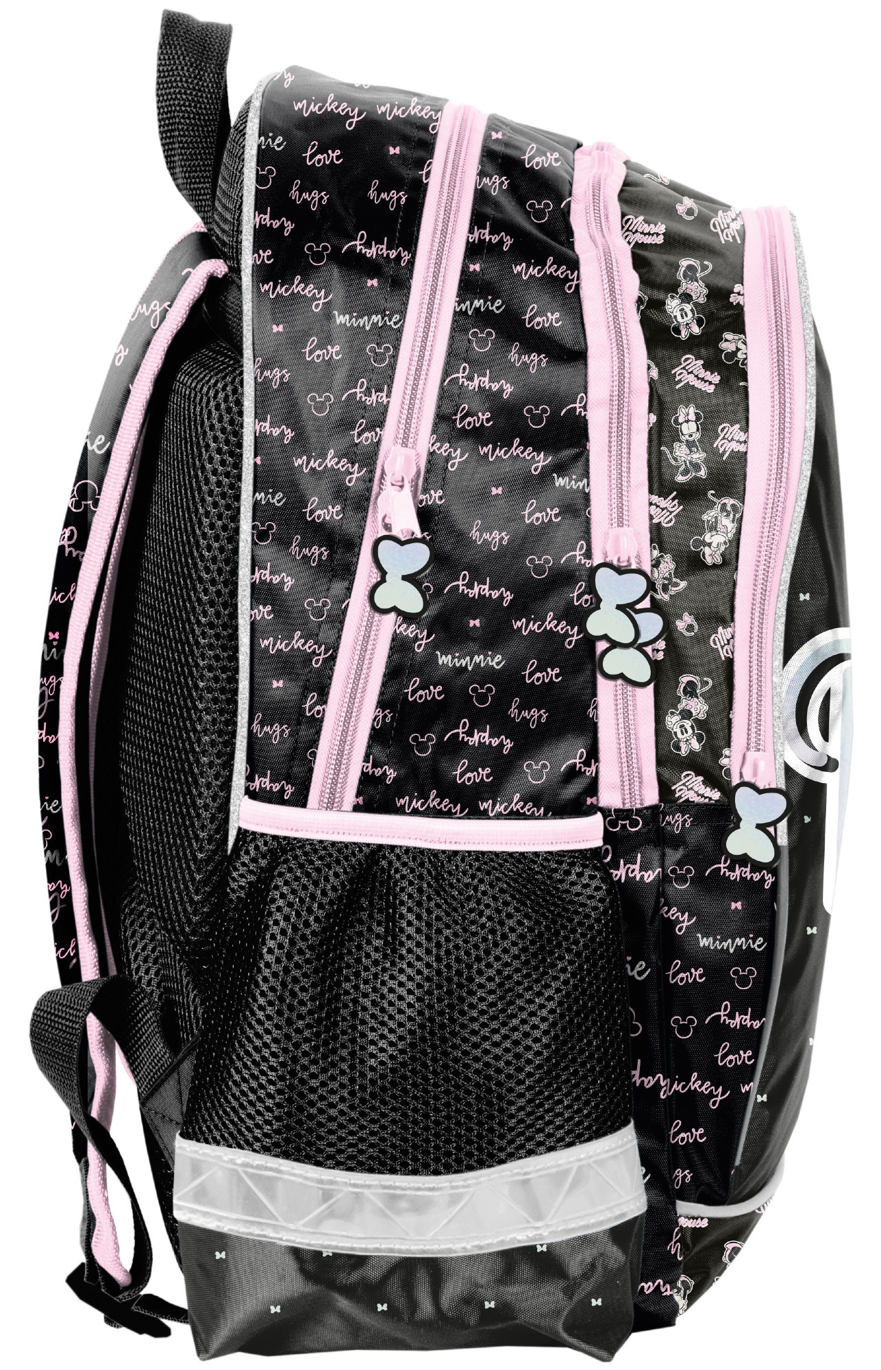 Der Rucksack ist in schwarz und rosa Farben, mit dekorativen Elementen mit Minnie Mouse.