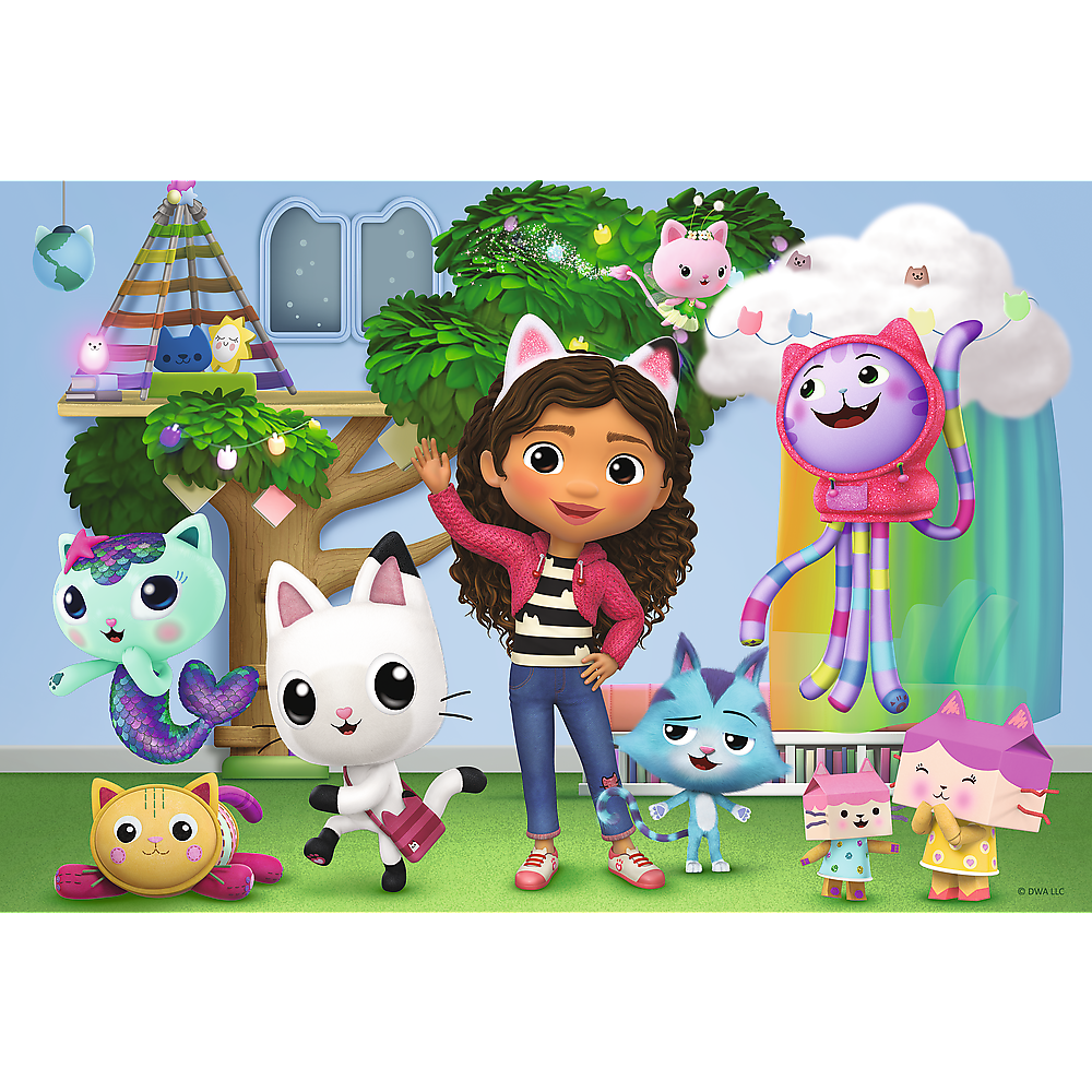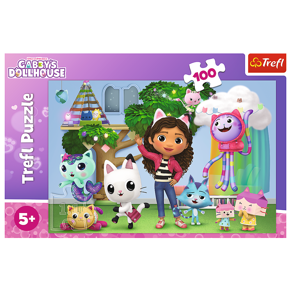 Gabis Katzenhaus-Puzzle bestehen aus 100 elemente mit Abmessungen 41 x 27,5 cm und ermöglichen es, sich ein Bild von Gabi im Haus zusammen mit Katzenfreunden wie: Kätzchen Panduś, DJ Catnip, Fee, Meerjungfrau, Najkotek, Softie und Tekturzątko.