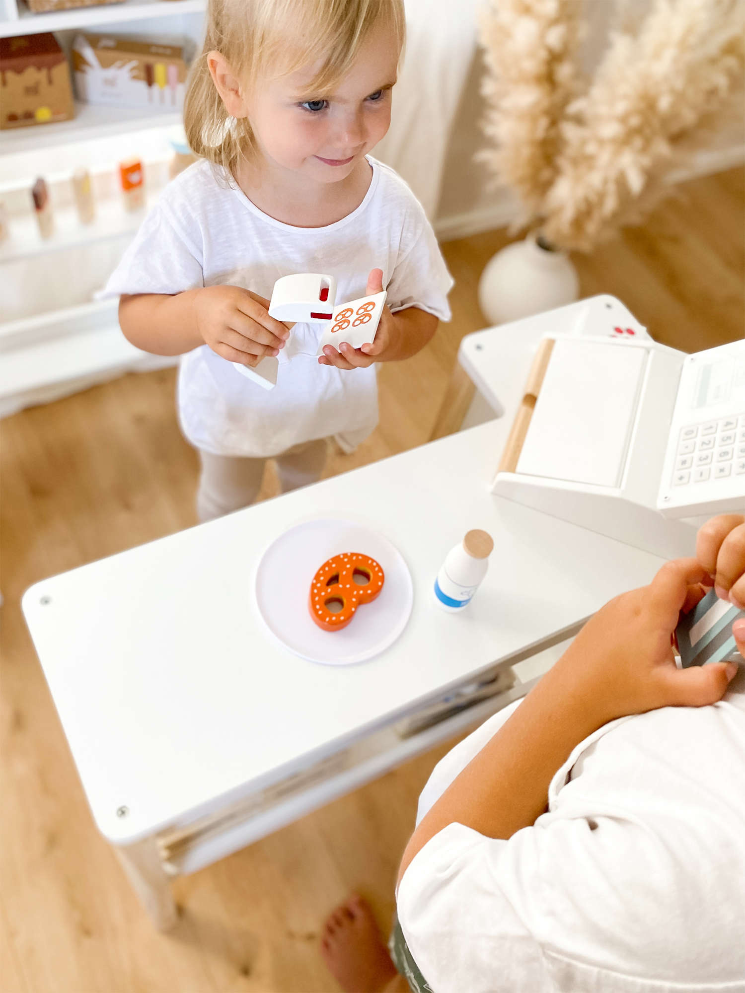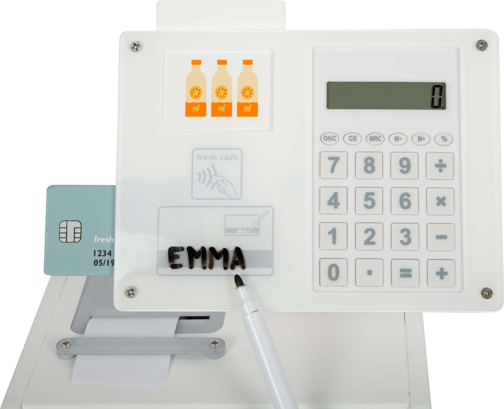 Mit der Registrierkasse lernt das Kind den Betrieb eines Ladens und einfache Transaktionen kennen. Einzelne Bestandteile des Bausatzes kann in die Kassenschublade gelegt werden.