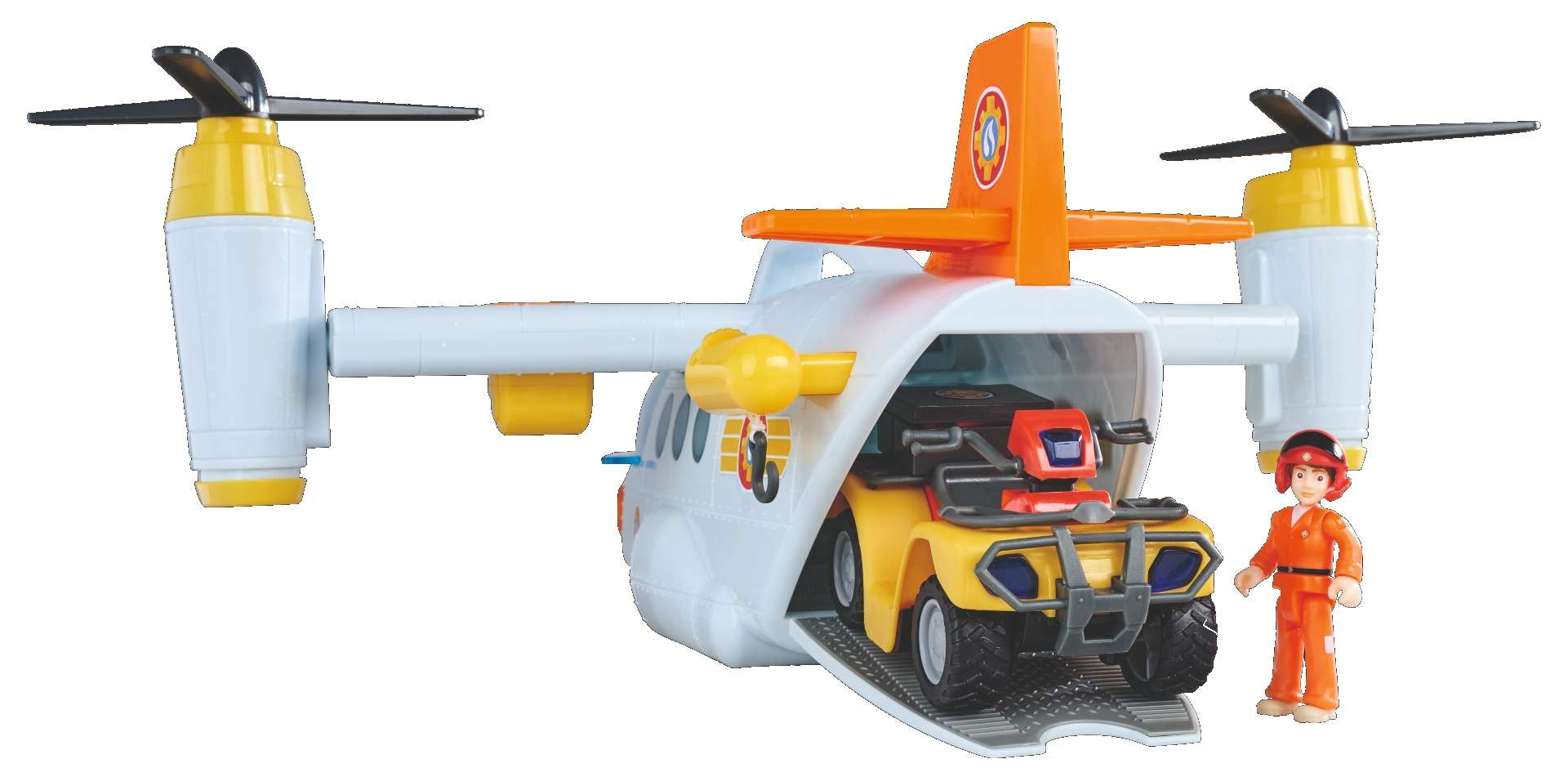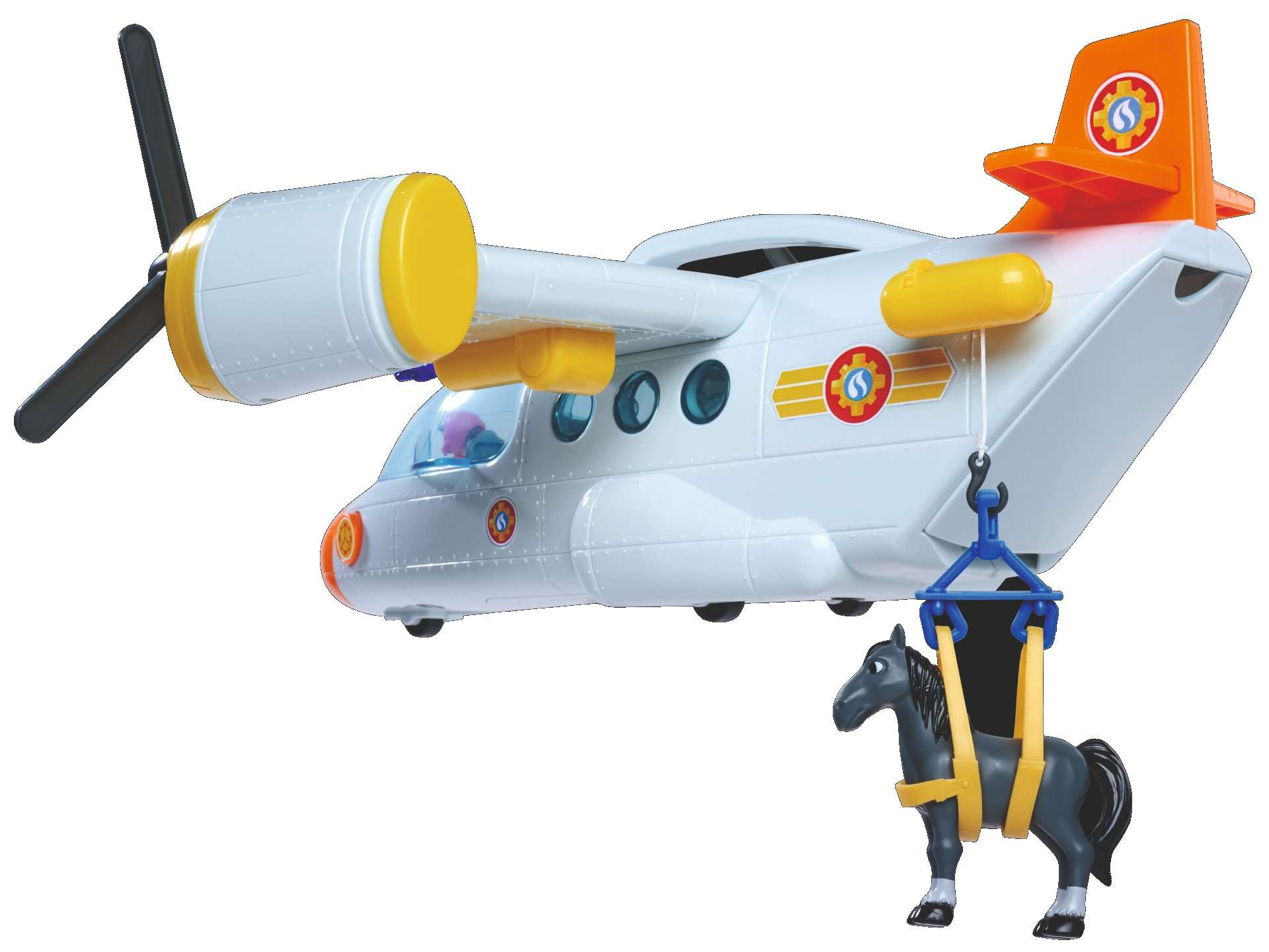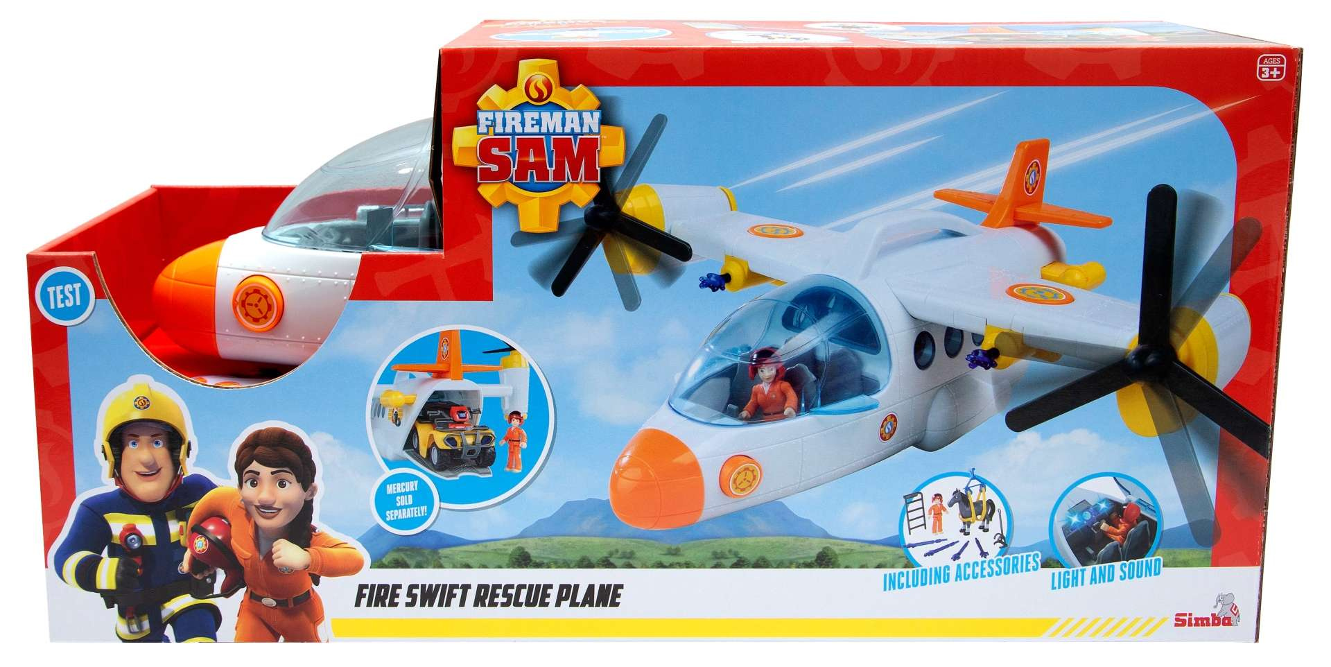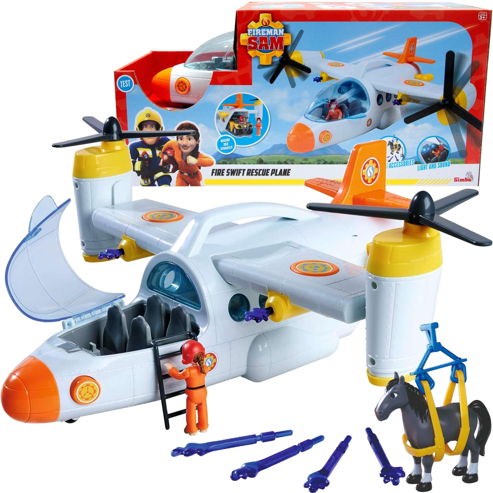 Das Set enthält ein tolles Flugzeug, das dem neuesten Fahrzeug aus der Serie nachempfunden ist, eine Figur, ein Pferd und Zubehör. Das Rettungsflugzeug von Feuerwehrmann Sam hat einen Tragegriff und Räder für eine perfekte Landung. Die beiden Rotoren an der Seite können gedreht werden. Außerdem verfügt es über eine Seilwinde. Mit Geräuschen, und das aufklappbare Cockpit bietet Platz für vier Personen. Der Einstieg wird durch eine schwarze Leiter erleichtert. Am Heck befindet sich ein zu öffnender Laderaum, in dem das Mercury Quad (nicht im Lieferumfang enthalten) untergebracht werden kann. An den Tragflächen sind zwei Wasserkanonen angebracht, die auf Knopfdruck Wassergeschosse abfeuern.
