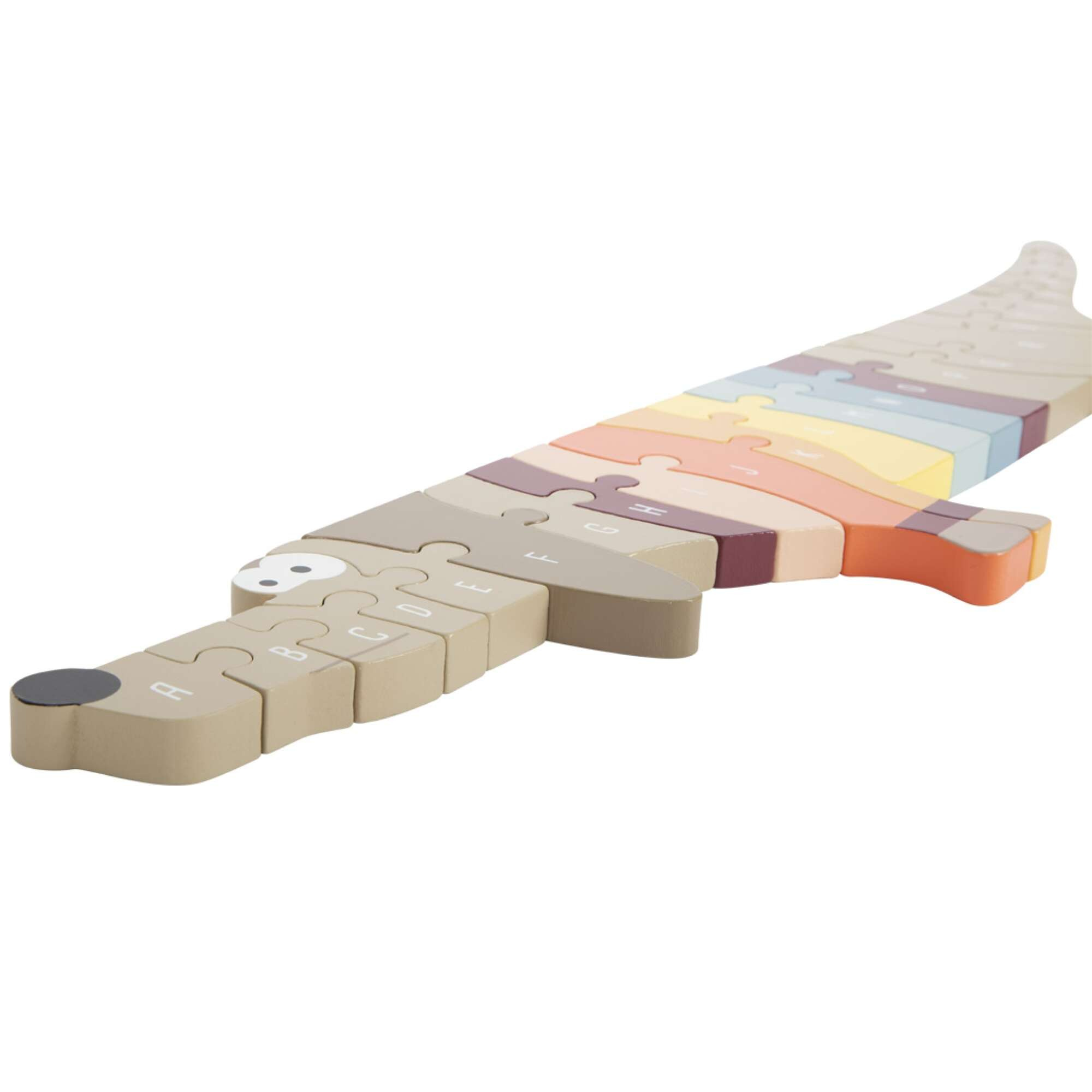 Das Holzpuzzle ist ein kleiner Satz von Blöcken in bunten Farben und Formen, die ineinander passen. Auf jedem ist ein anderer Buchstabe des englischen Alphabets abgebildet, damit die Kleinen schneller lernen und das Puzzle lösen können. Wenn man alle Puzzles zusammensetzt, erhält man einen niedlichen, 15 cm hohen Hund.