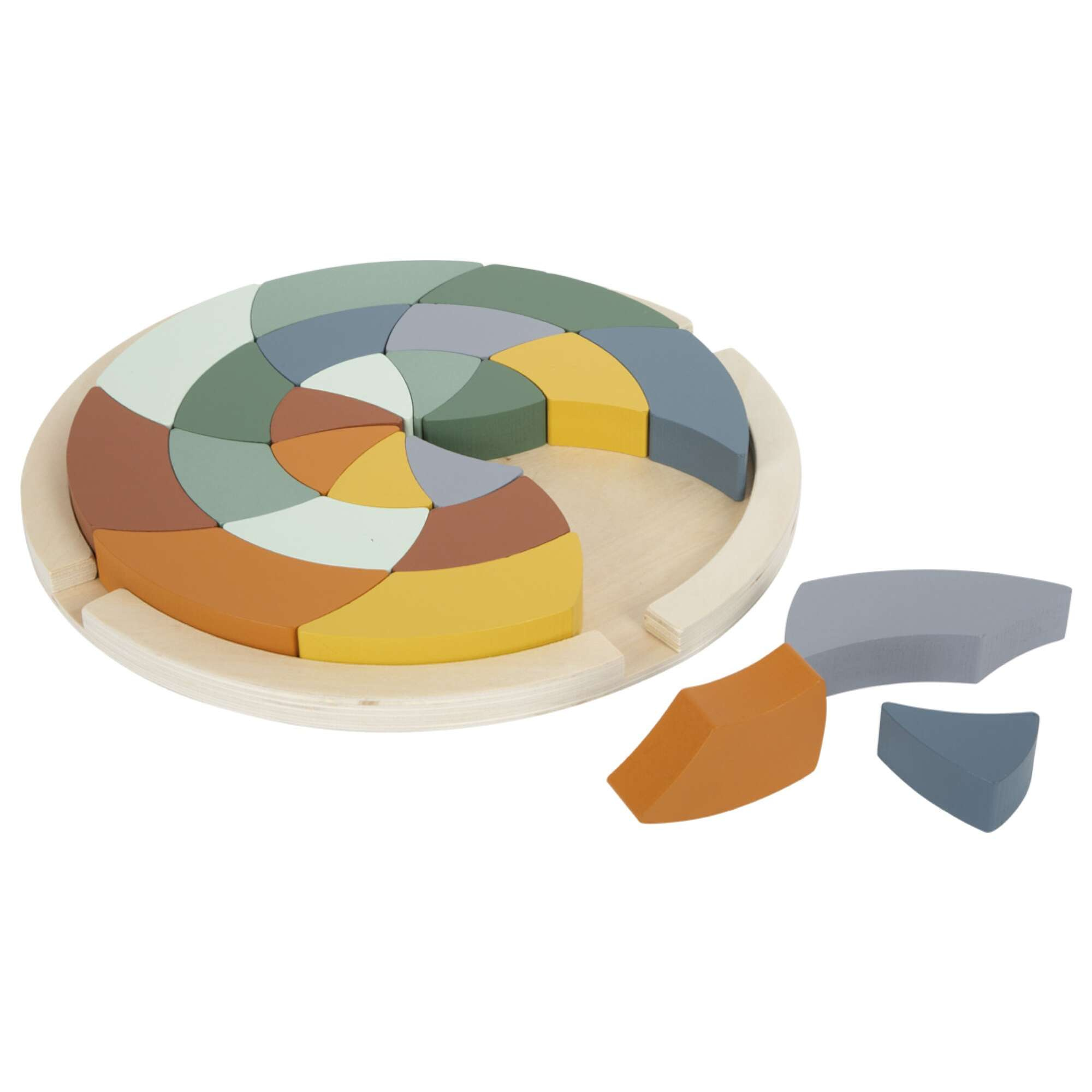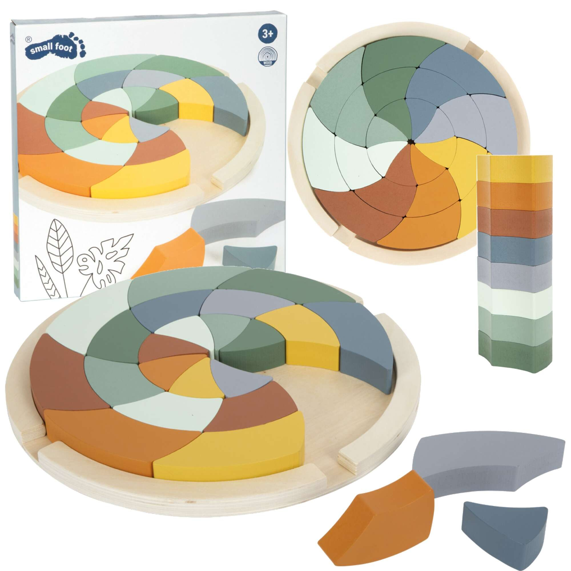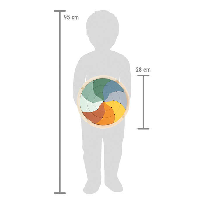 - Das Puzzle besteht aus 24 bunten Teilen, die sich zu einem größeren Kreis zusammensetzen lassen. Um das Zusammensetzen der einzelnen Teile zu erleichtern, wird ein Holzblock mitgeliefert. Das Spiel schult das logische Denken und eine bessere Farbuntersche