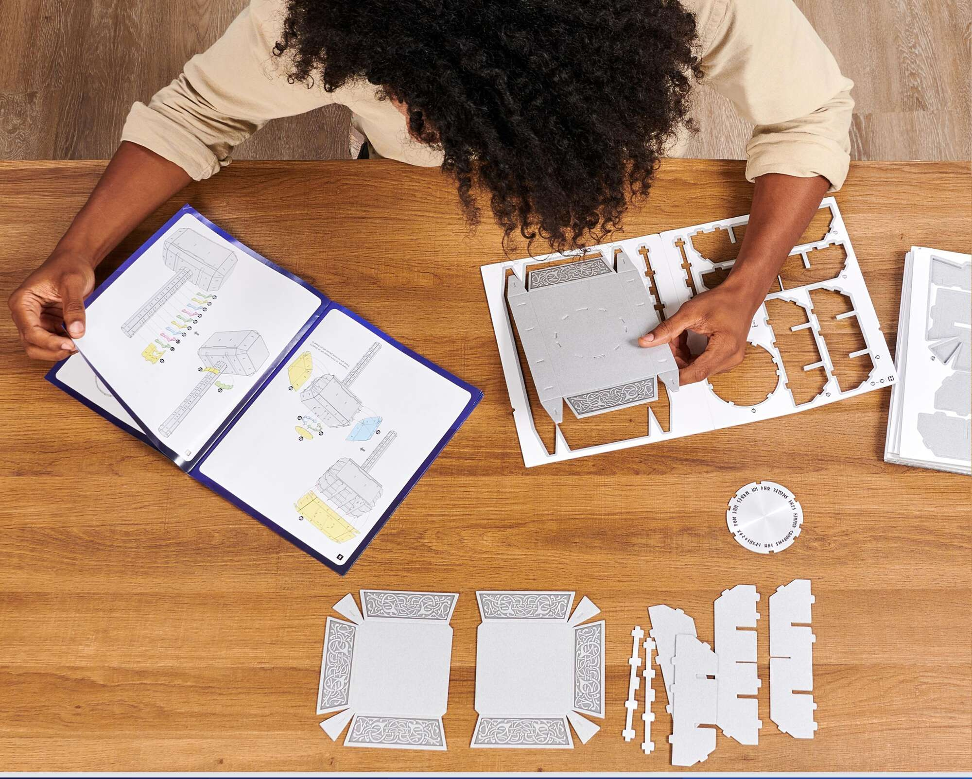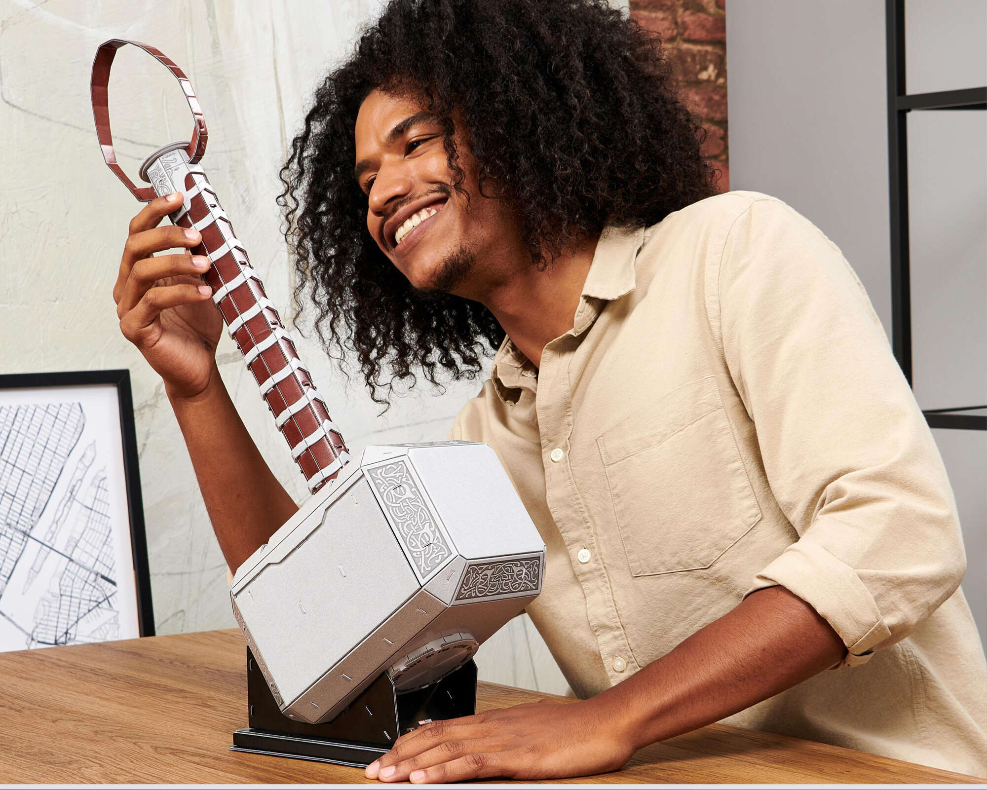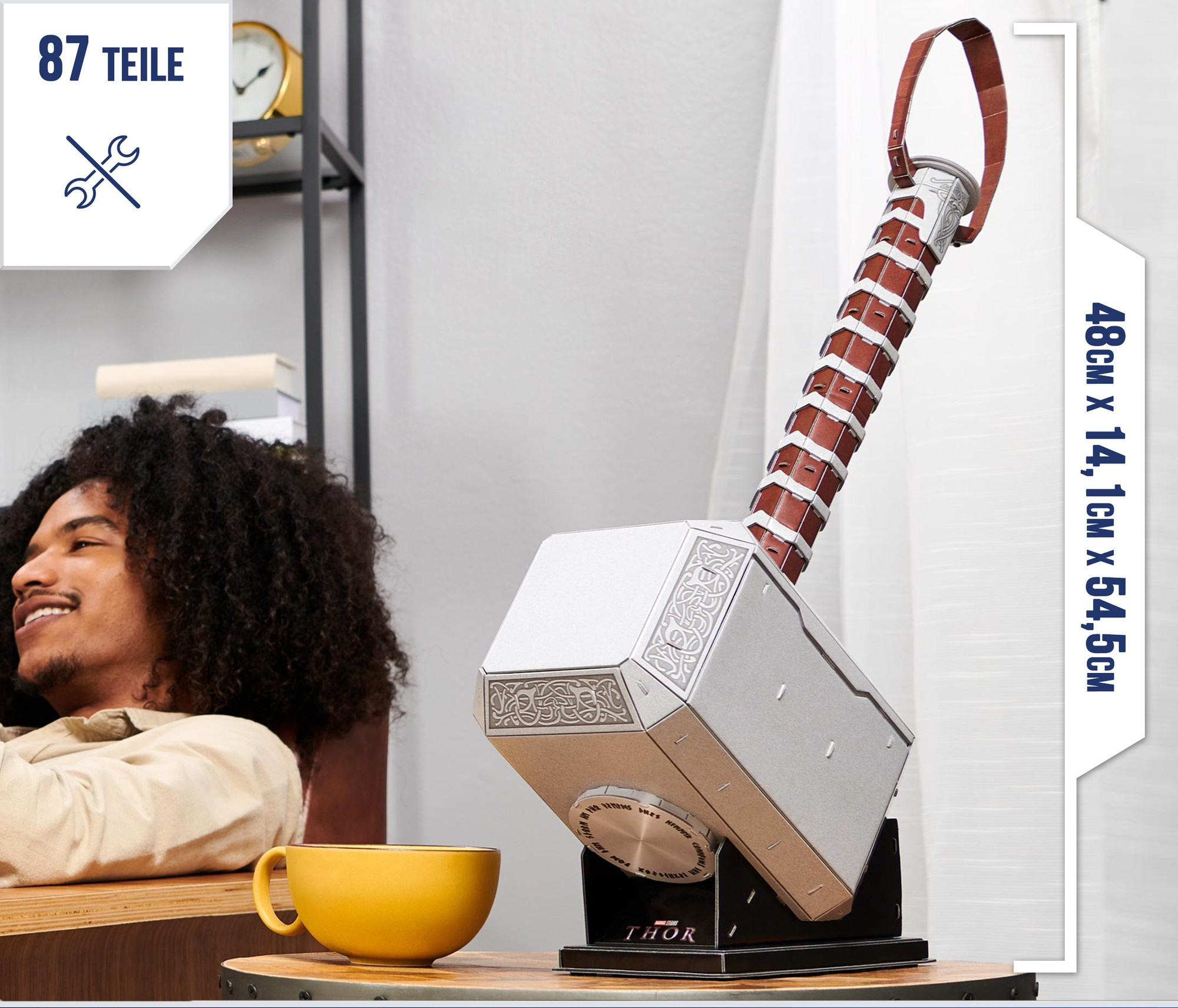 - Das Set besteht aus einer Reihe von 3D-Modellen, die in Form eines Puzzles zusammengesetzt werden können. 87 Elemente auf 8 Tafeln bilden Thors magischen Hammer Mjolnir ab, der aus Comics und Marvel-Kinofilmen bekannt ist.