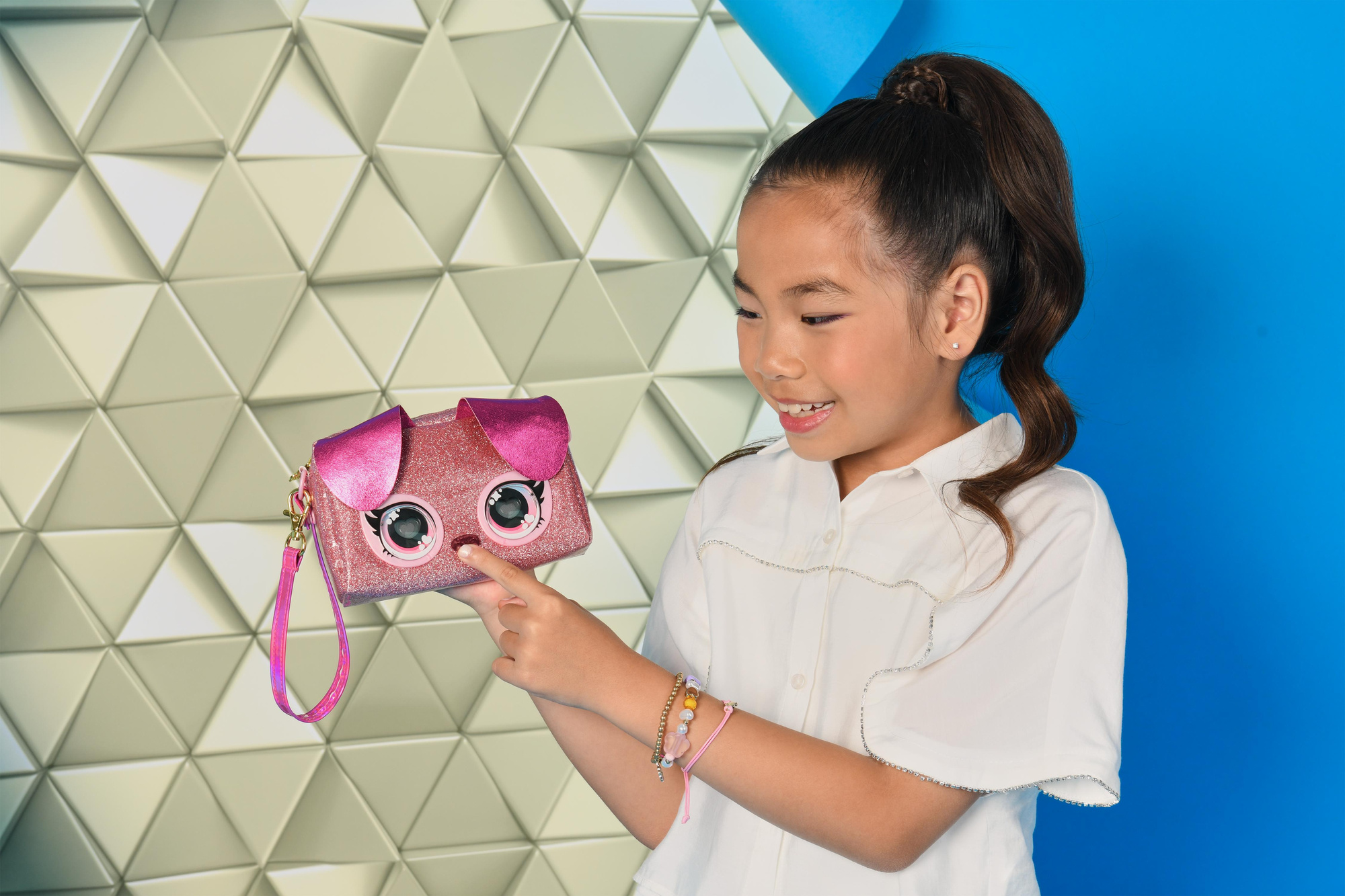 - Diese bezaubernde kleine Handtasche ist in einem rosa Farbschema gehalten. Sie hat ein Paar große Augen, die in verschiedenen Farben leuchten, wenn man auf den Todd drückt, und sie hat auch schimmernde rosa Ohren.