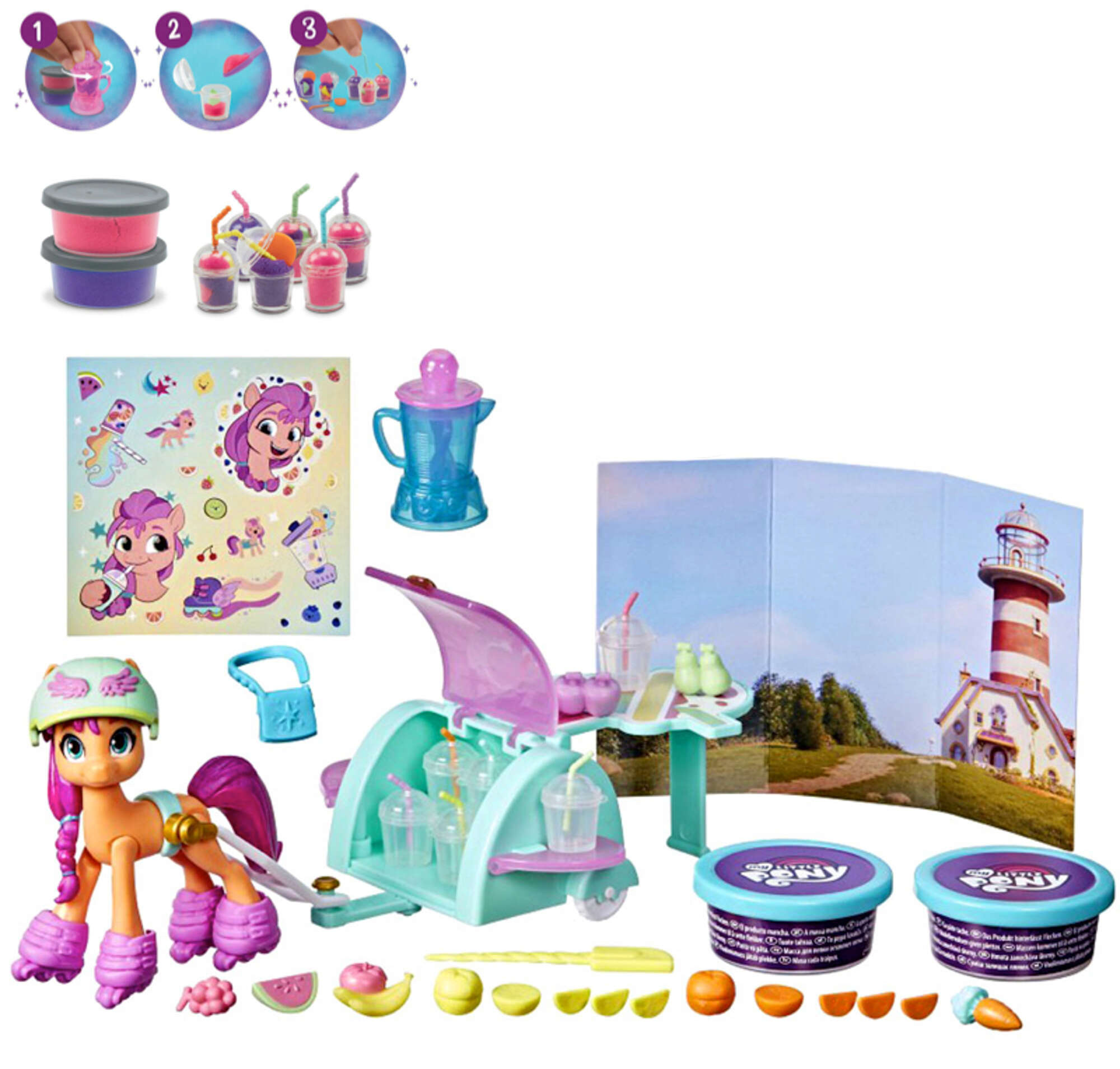 - Inhalt des Sets: Pony Sunny Starscout, Pastryoline in zwei Farben zu je 28 g, Zubehör, Getränkewagen.