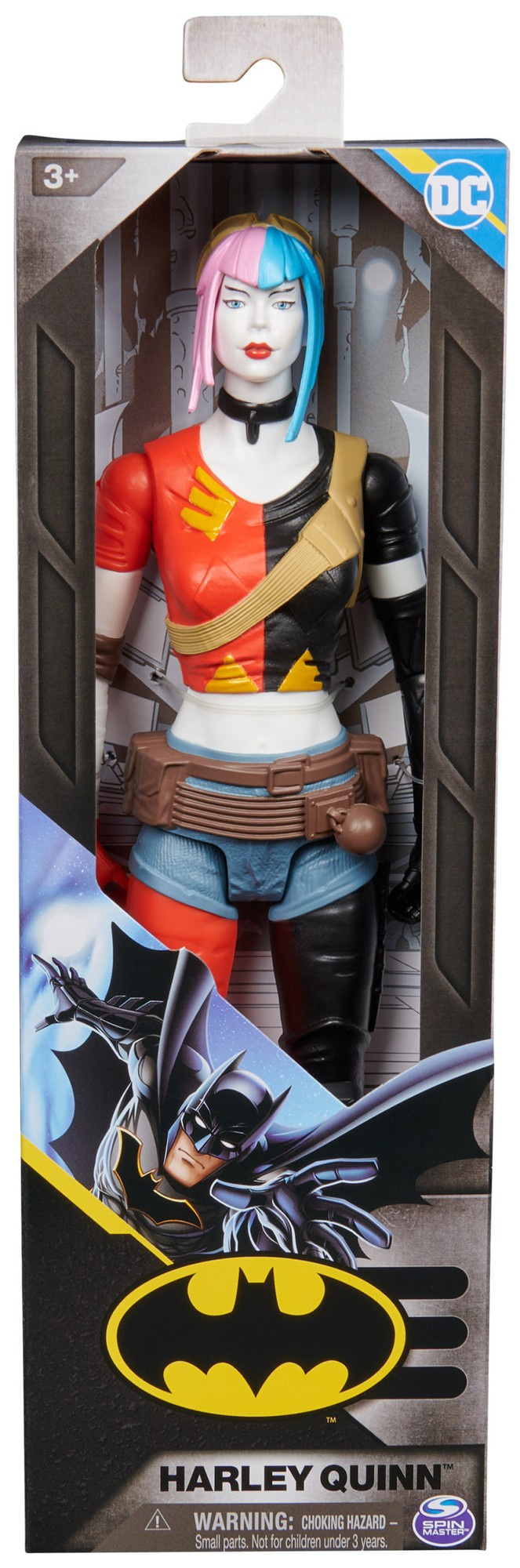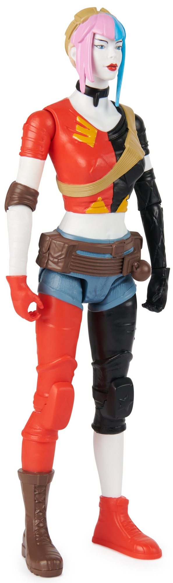 - Die Harley Quinn Figur ist ca. 30 cm groß und trägt ein kurzes schwarz-rotes Oberteil, eine schwarz-rote Hose und kurze hellblaue Shorts.