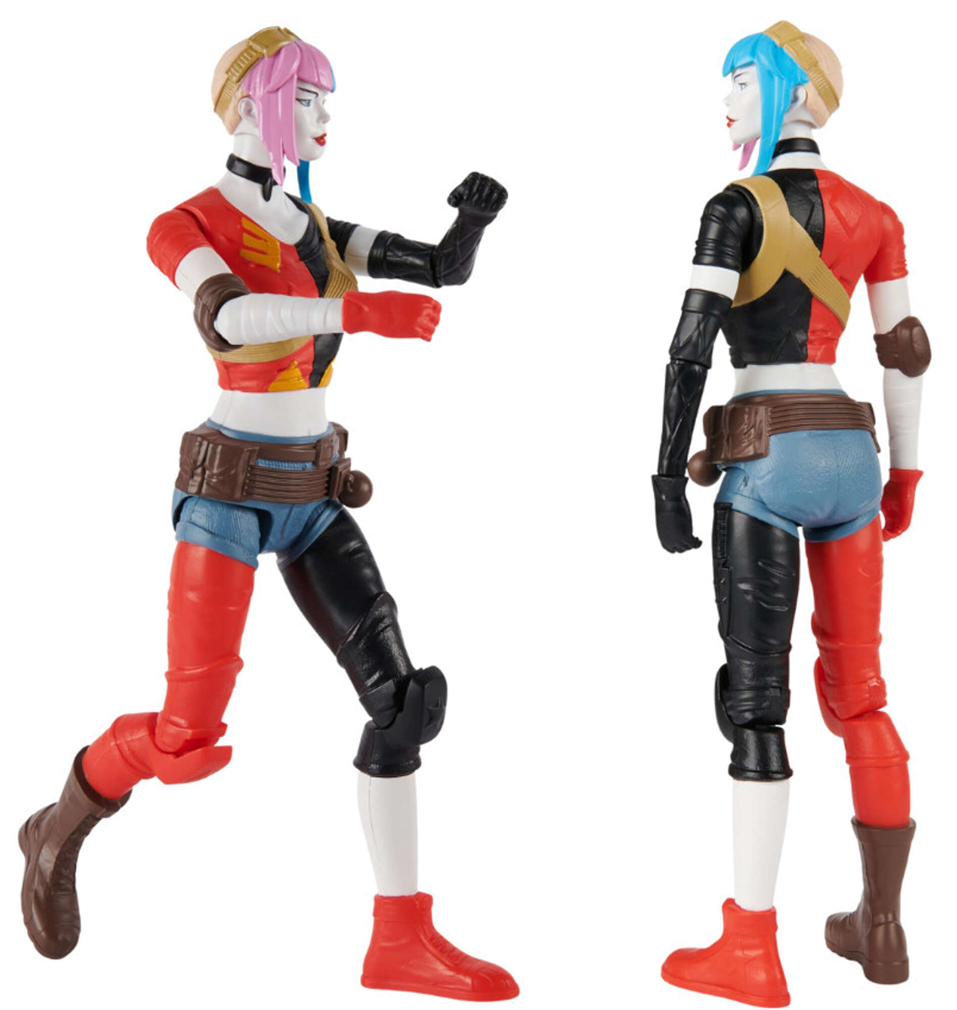 Die Harley Quinn Figur ist ca. 30 cm groß und trägtein kurzes schwarz-rotes Oberteil, eine schwarz-rote Hose und kurze hellblaue Shorts.