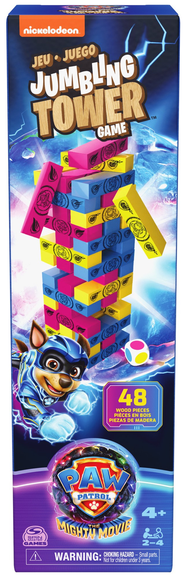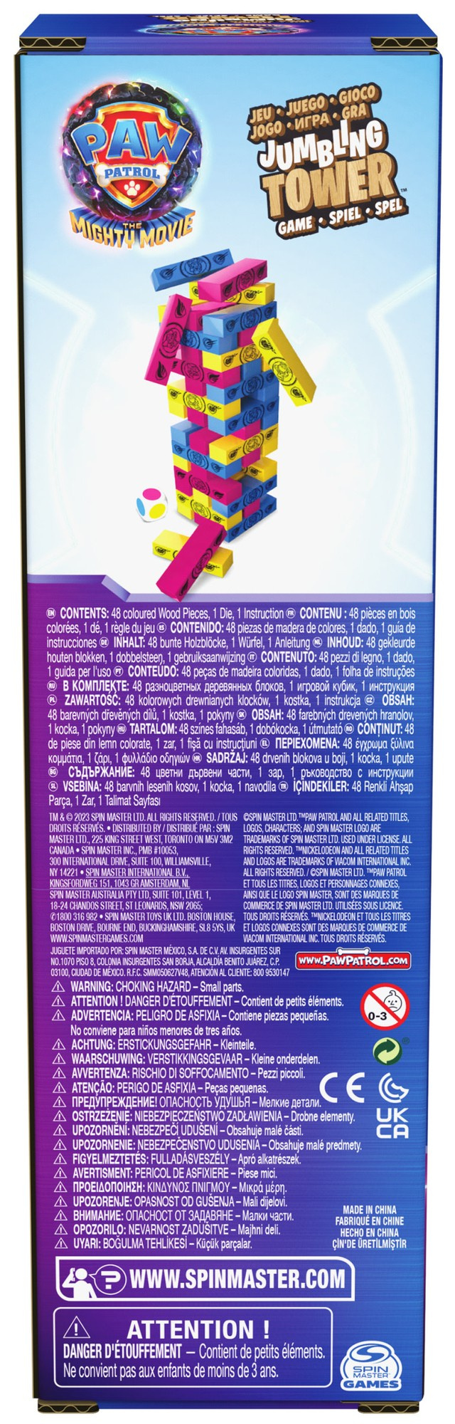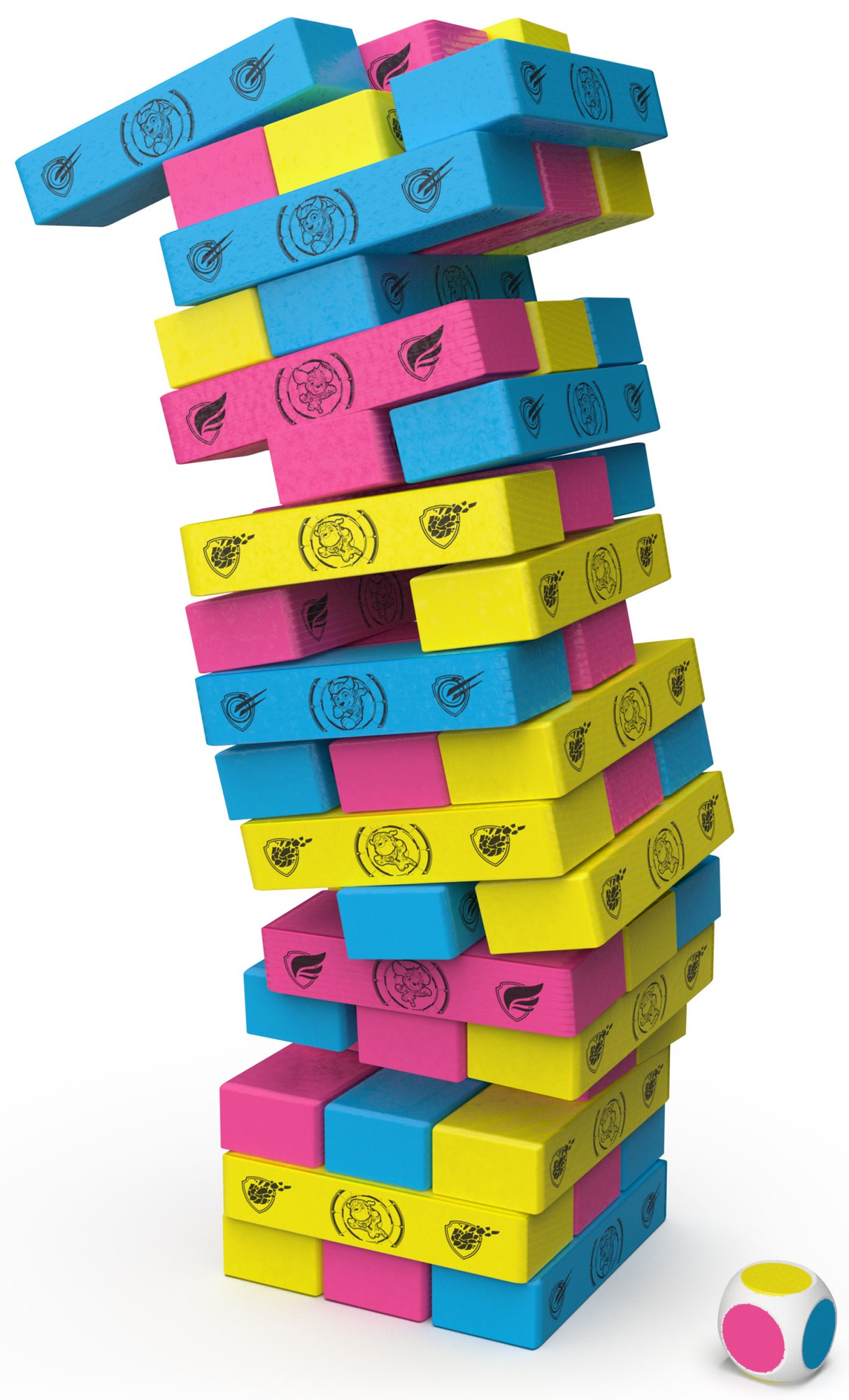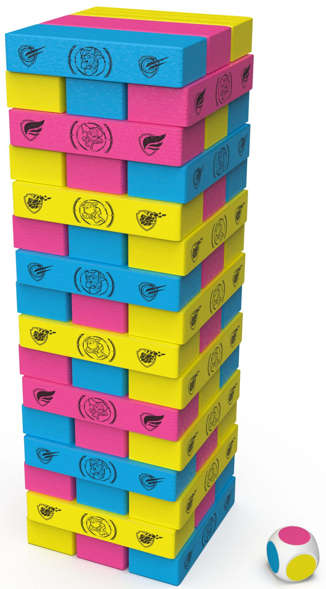 Daswackelige Turmspiel ist dem beliebten Zeichentrickfilm PawPatrol The Movienachempfunden. Das Spiel besteht darin, einen Holzklotz nach dem anderen aus dem unteren oder mittleren Teil des Turms herauszuziehen - einen Klotz nach dem anderen. Dann versucht der Spieler, den herausgezogenen Holzklotz auf die Spitze des Turms zu setzen, damit der Turm nicht umkippt. Das Spiel geht weiter, bis der Turm umkippt.