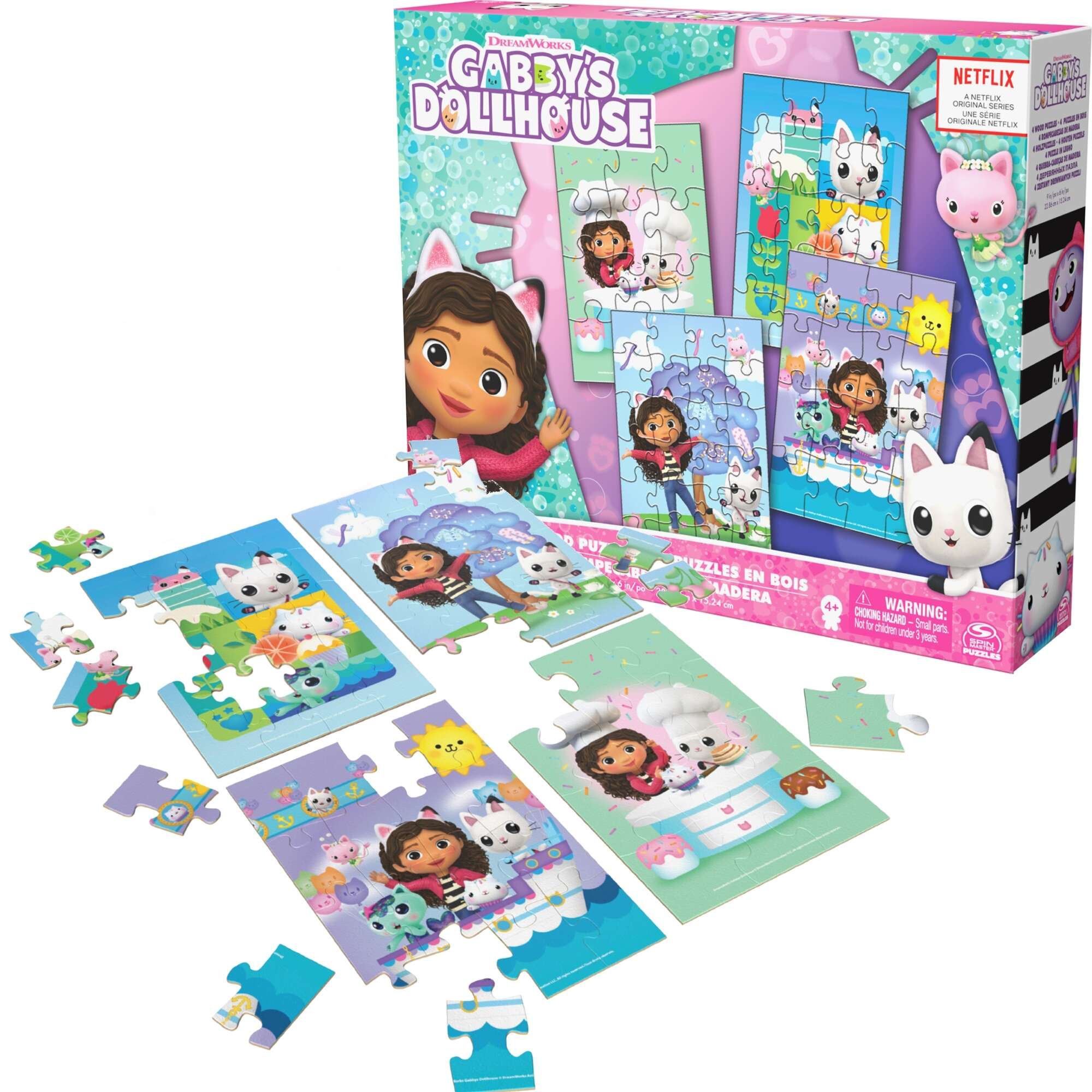 Gabi's Cat House Puzzles besteht aus 4 Puzzles mit unterschiedlicher Anzahl von Teilen, die jeweils 22,86 x 15,24 cm groß sind.