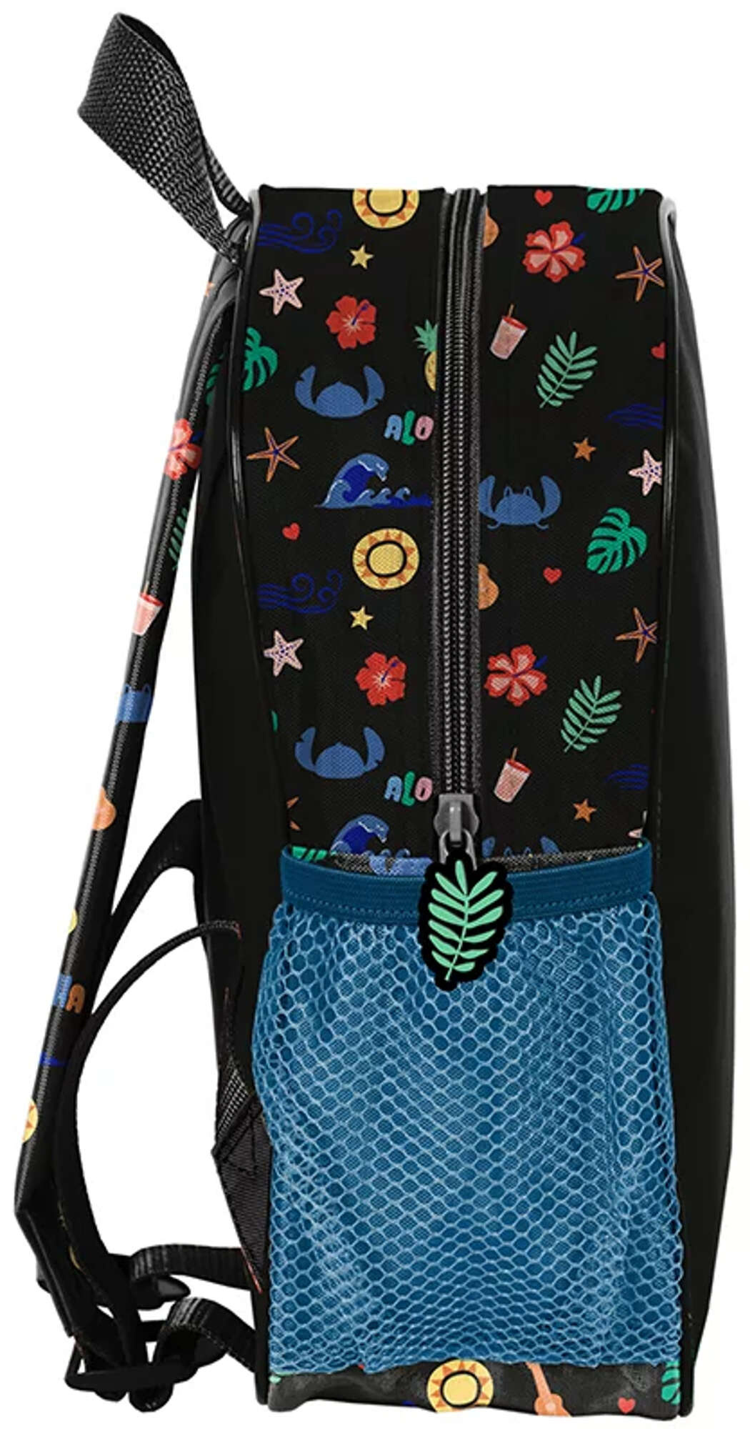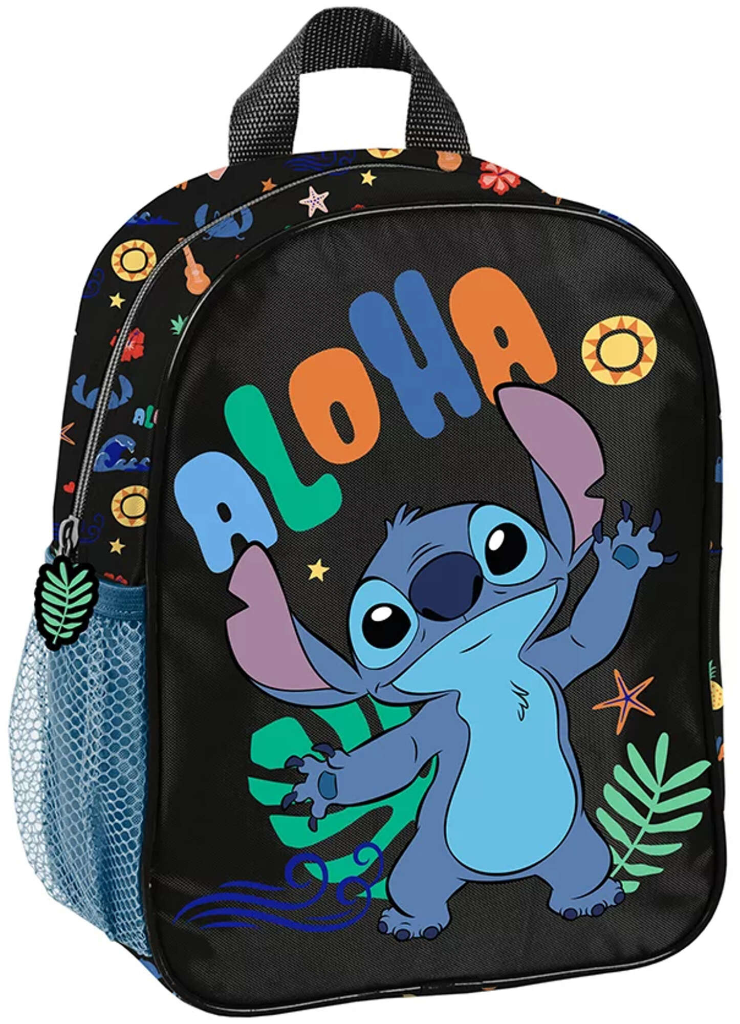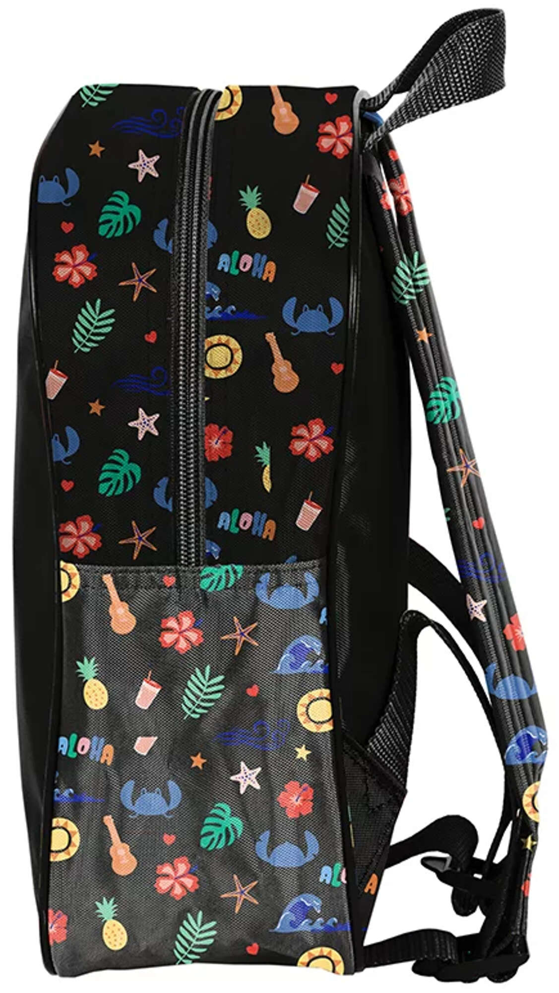 - Der Rucksack ist in den Farben Schwarz und Rosa gehalten und zeigt einen lächelnden Stitch und den Schriftzug "Aloha".