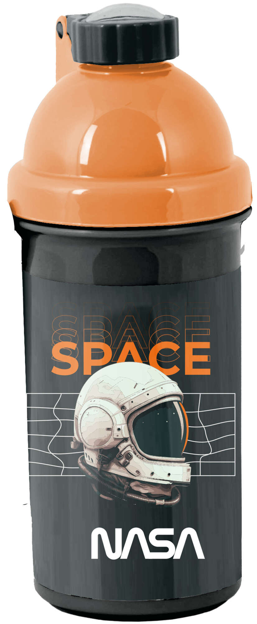 Der Bidon ist in einem schwarz-orangen Farbschema gehalten und zeigt eine Grafik mit einem Astronautenhelm und einem NASA-Schriftzug.