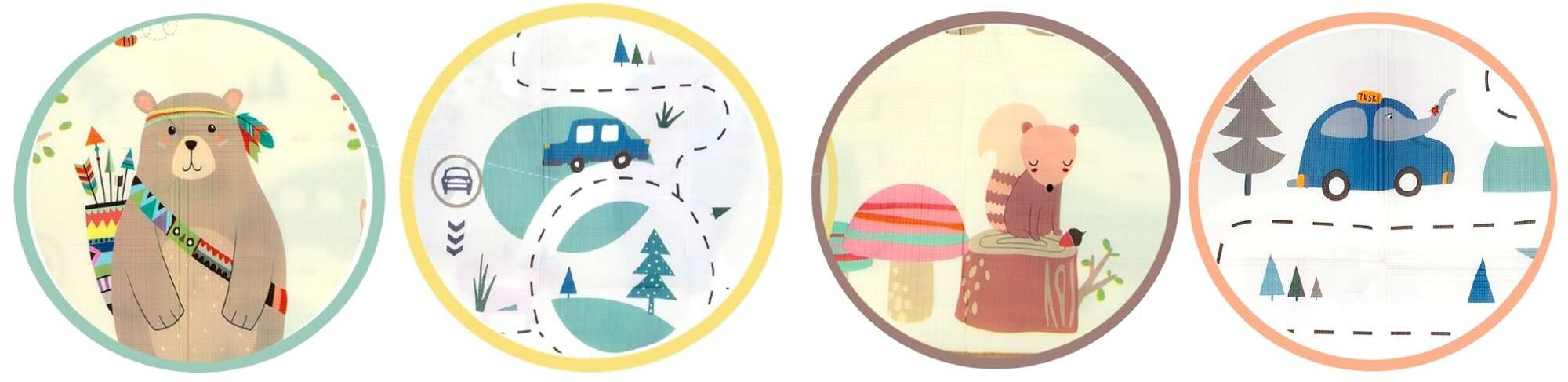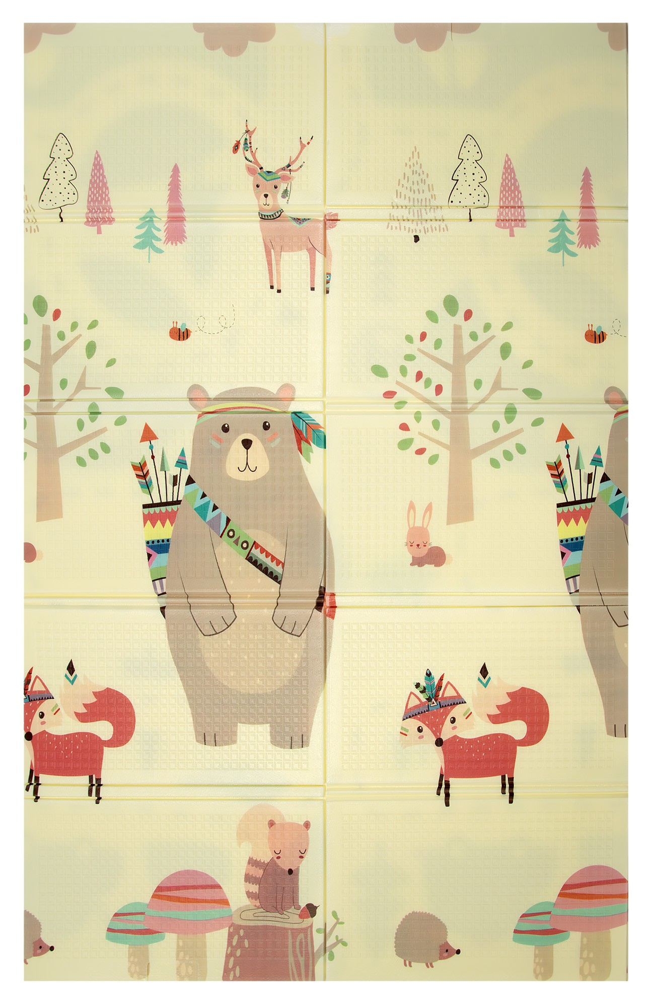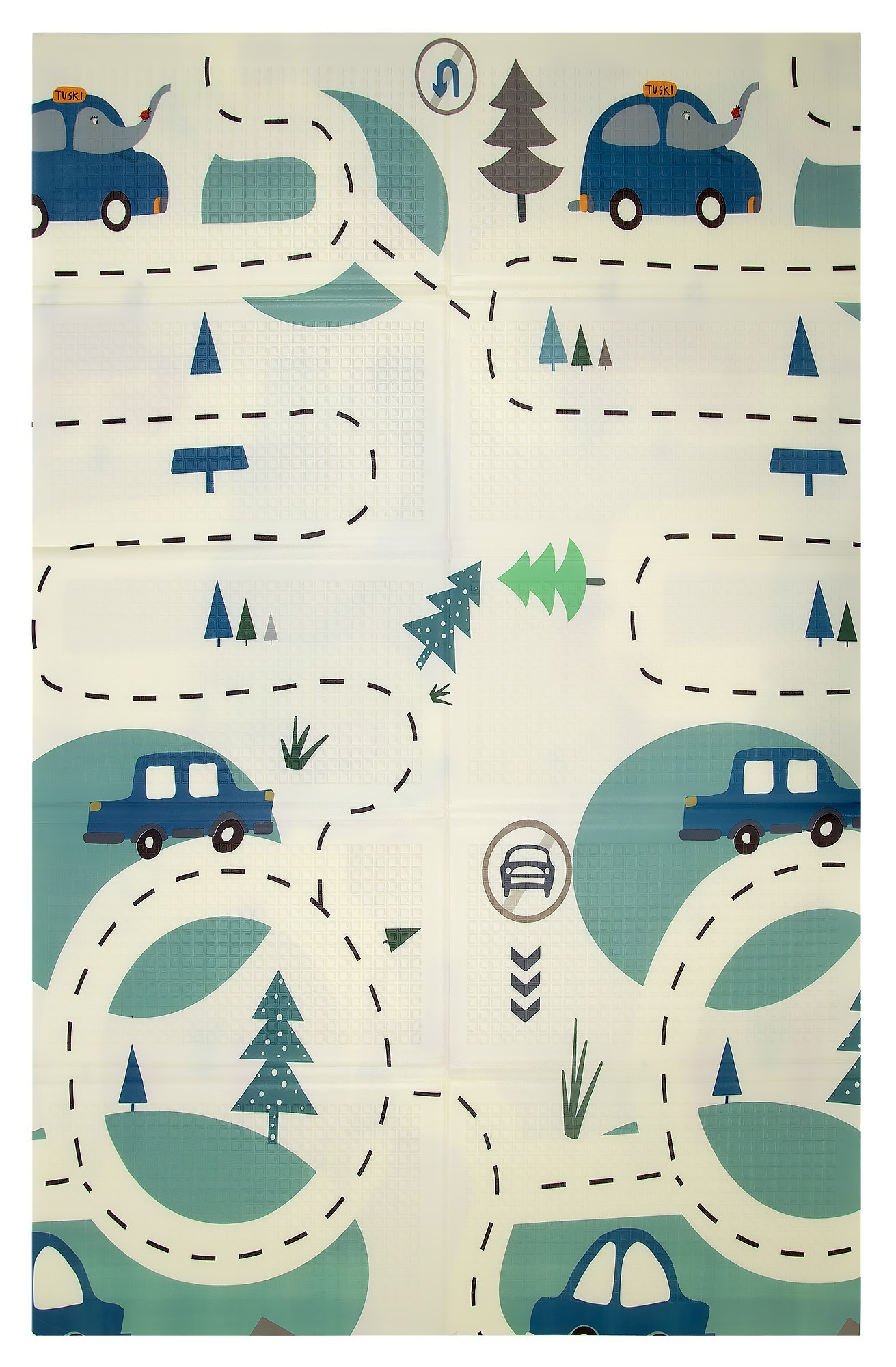 - Auf der einen Seite sind Teddybären, Füchse und Rehe in einem Wald abgebildet, auf der anderen Seite der Matte eine Straße mit Autos.