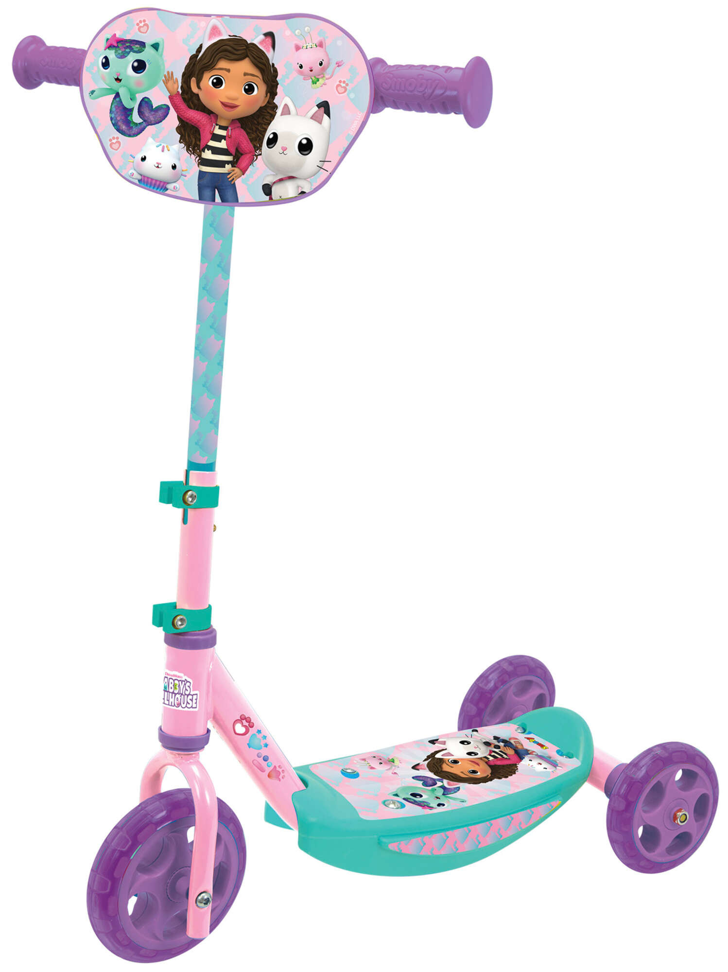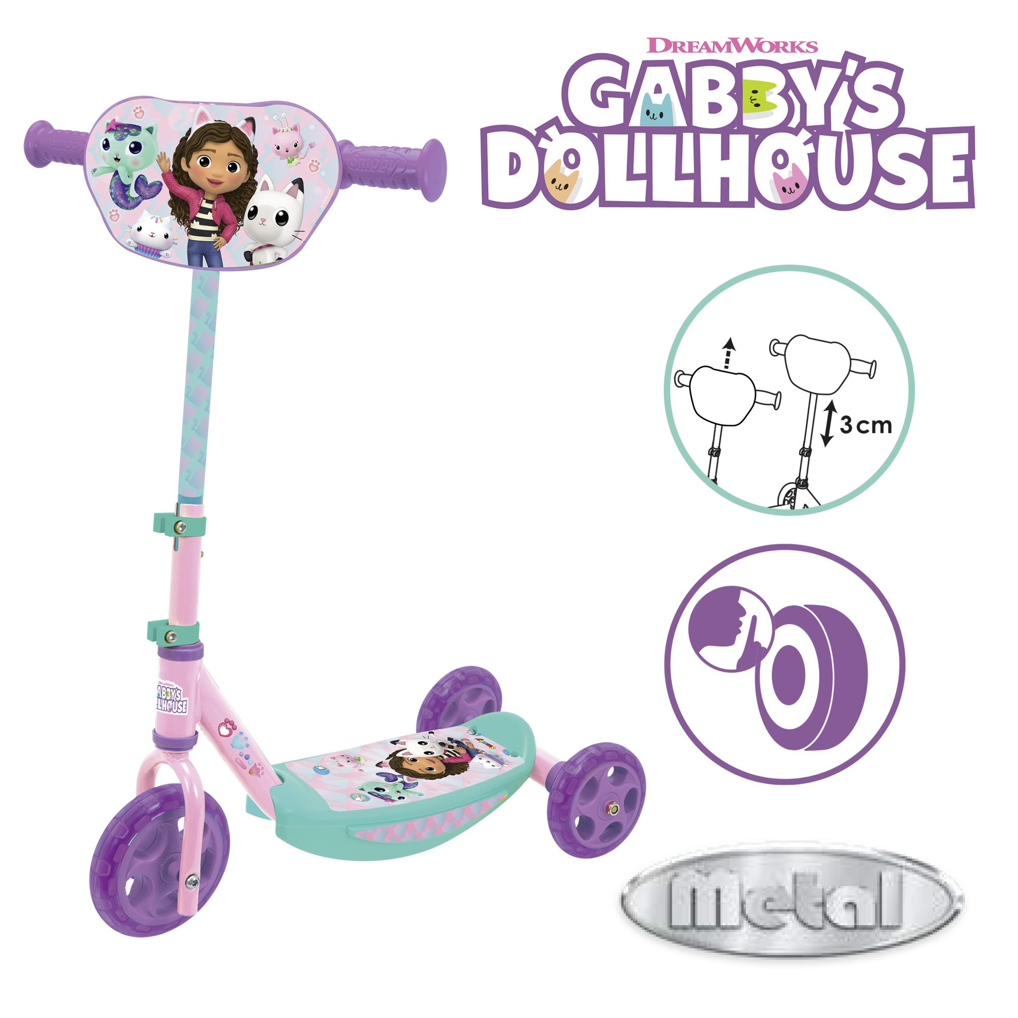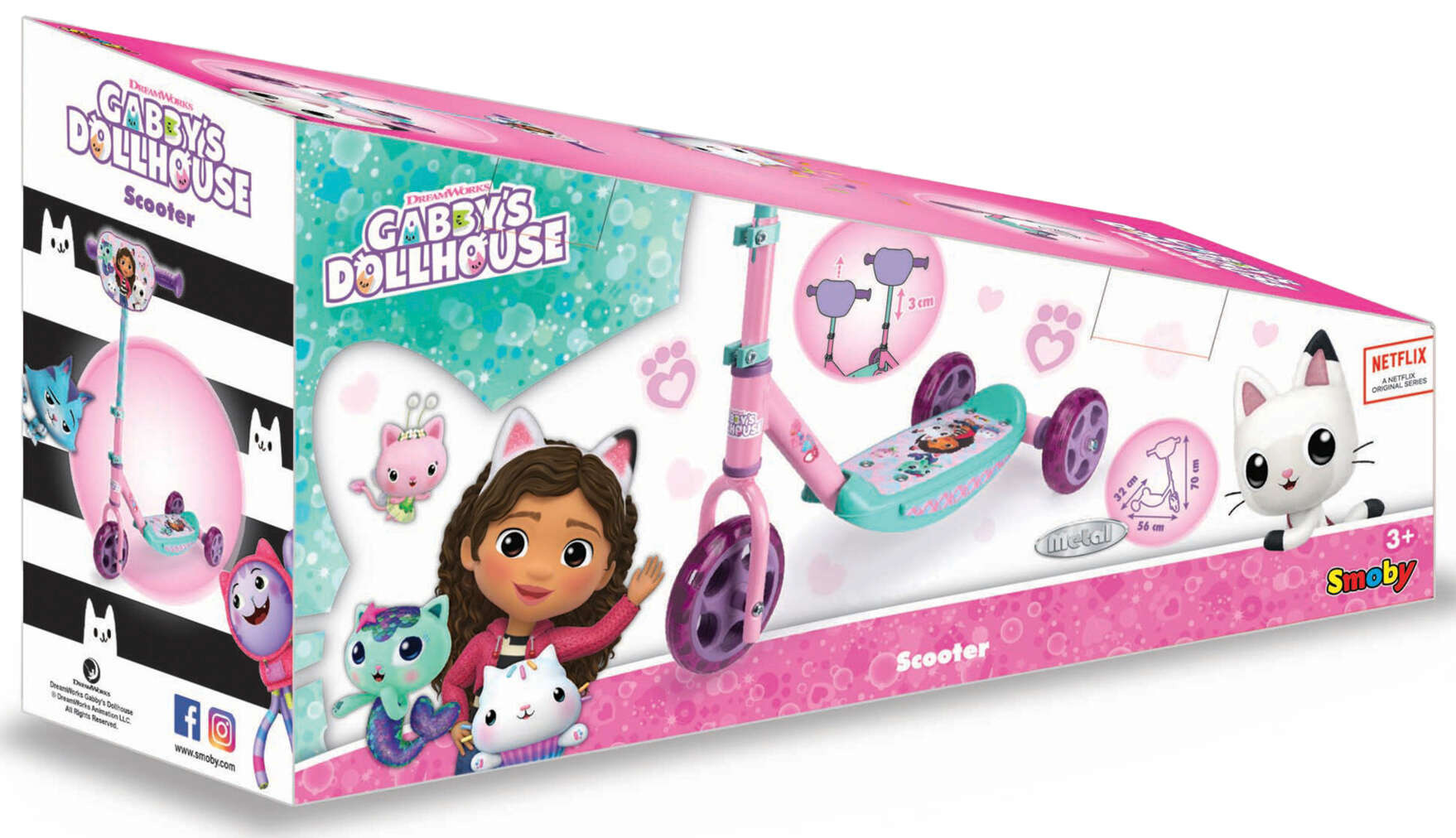 Der Roller ist in den Farben Blau, Rosa und Lila gehalten und verfügt über grafische Elemente, die die Hauptfiguren aus dem Zeichentrickfilm Gabby's Dollhouse darstellen.