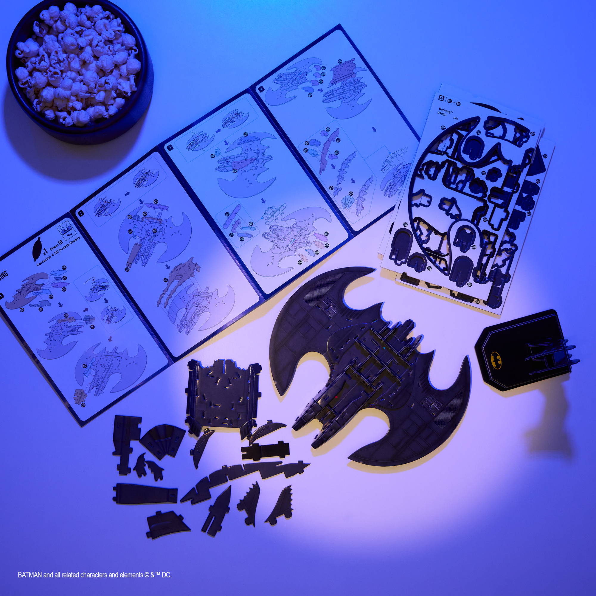 - Das zusammengebaute Set stellt ein Modell von Batmans himmelhohem Fahrzeug, dem Batwing, dar und besteht aus 71 Teilen, die in 4 Platinen untergebracht sind.