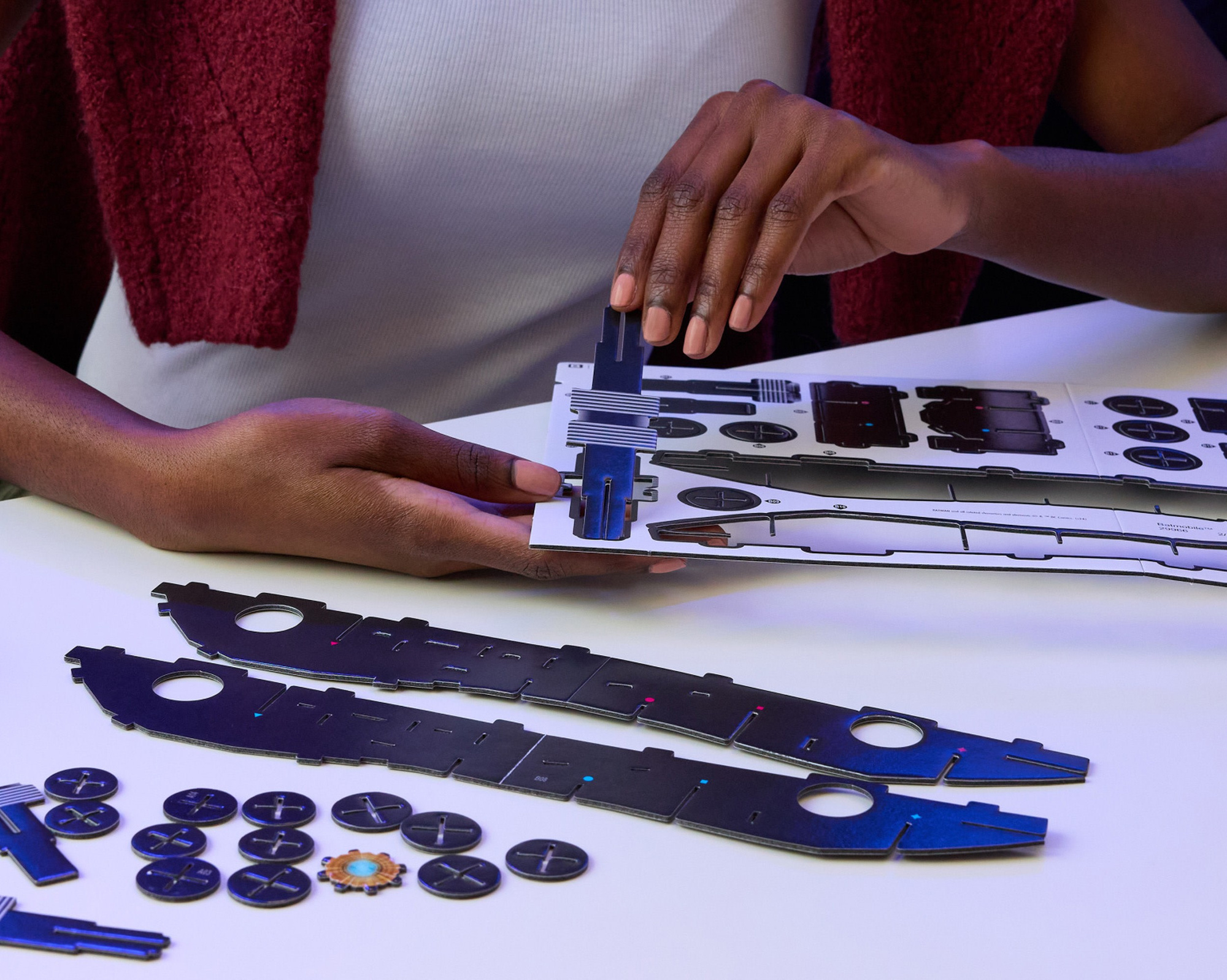 - Das gestapelte Set stellt ein Modell von Batmans Fahrzeug, dem Batmobile, dar und besteht aus 202 Teilen, die in 8 Tafeln angeordnet sind.