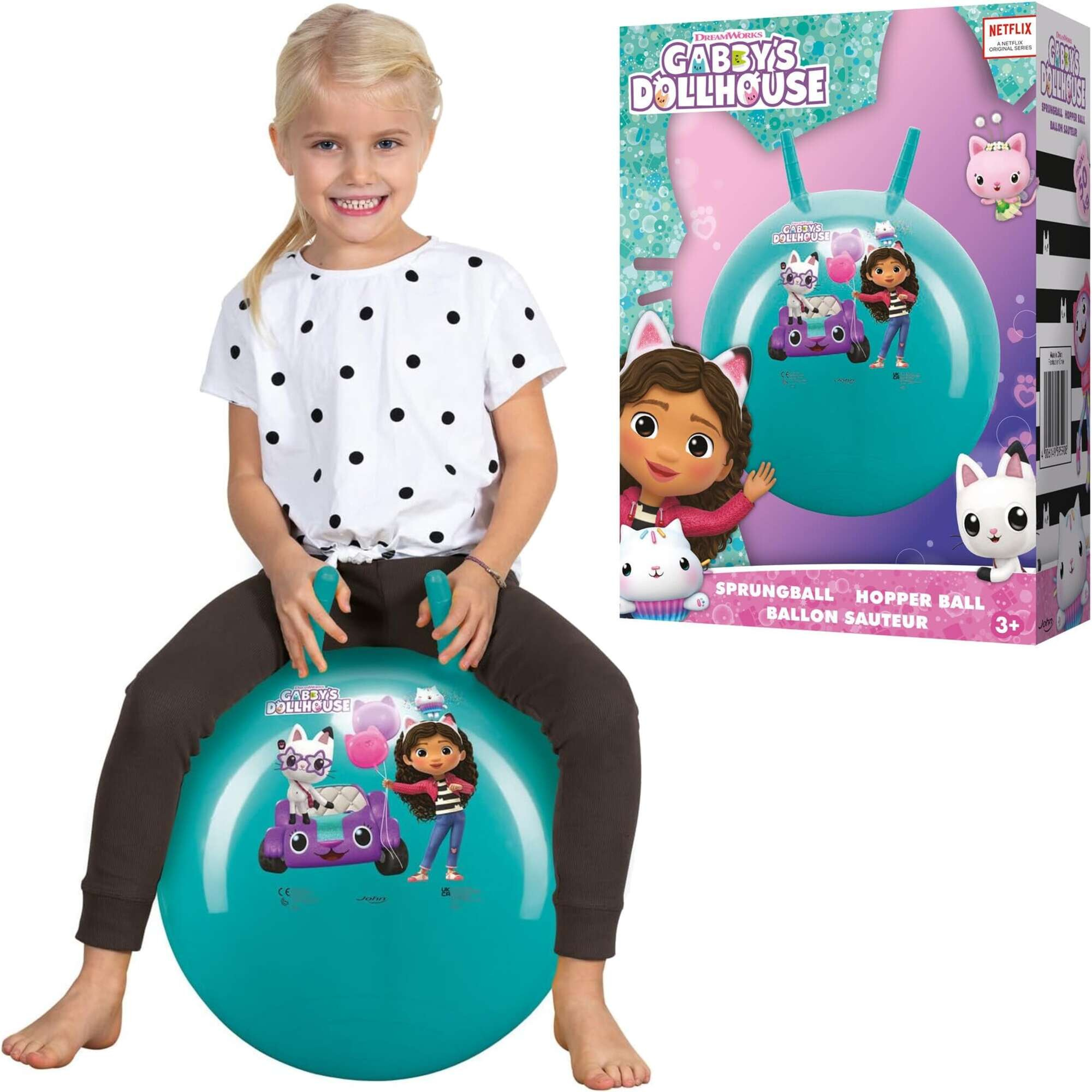 Der Hüpfball ist in türkis und hat zwei Ecken zum Greifen. Er ist mit den Figuren aus der Serie bedruckt und wird sicher jedem Kind gefallen, das gerne hüpft.