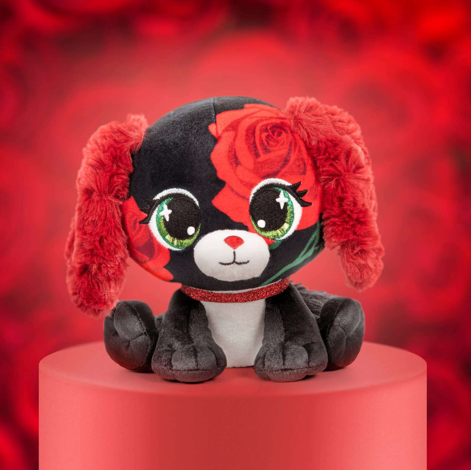 Anna Dolce ist ein Hund, der Rosen liebt und in Gesellschaft funkelt. Dieser Hund hat schwarzes und rotes Fell mit Rosen, einen schwarzen Schwanz, rote Ohren und Todd und grüne Augen.