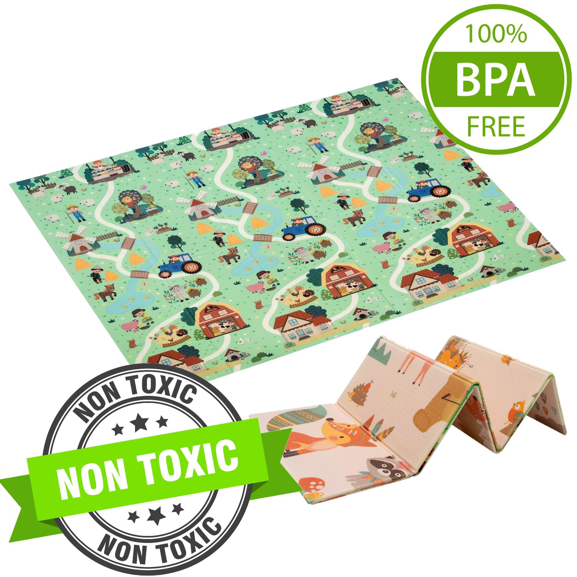 HUMBI Spielmatte Baby, Krabbelmatte, XPE Schaumstoff, Doppelseitig, Flatbar, Wasserdicht, Extra Größe, Teppich Babymatte, Rutschfest, 180x200 cm, Dorf und Wald