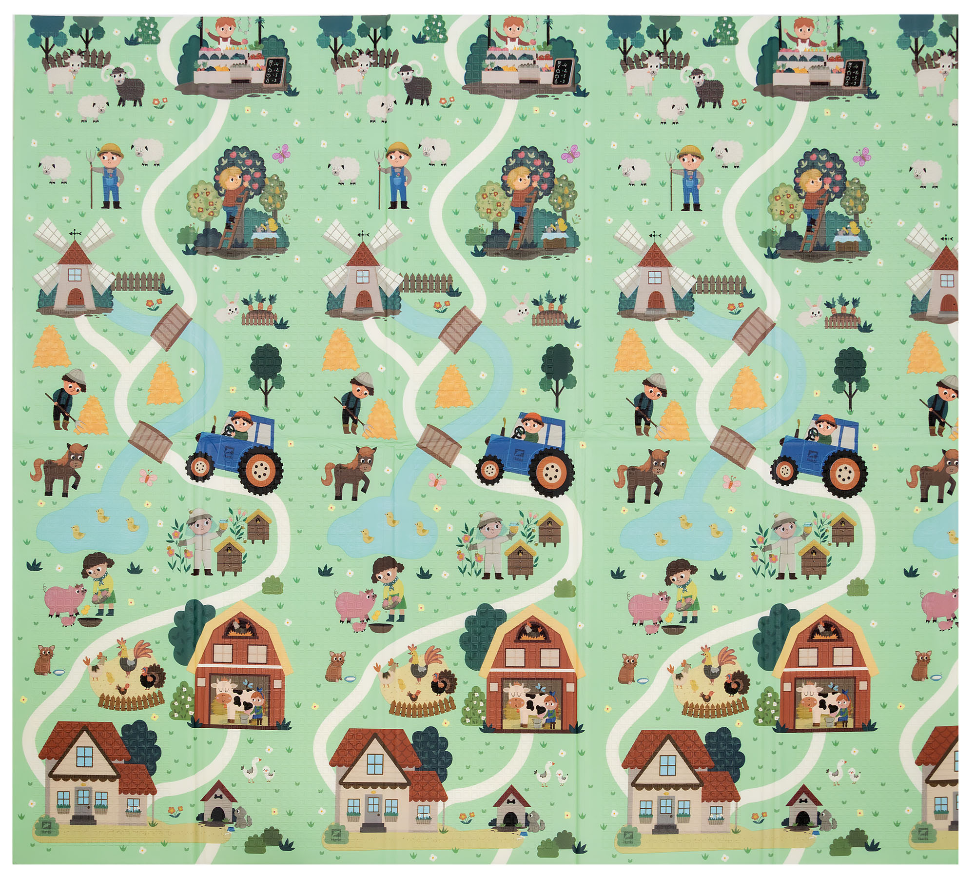 Auf dereinen Seite der Matte ist eine Grafik mit Tieren im Wald abgebildet,aufder anderen Seiteeine Grafik mit dem Leben auf dem Lande, mit Tierställen und einer ländlichen Landschaft.