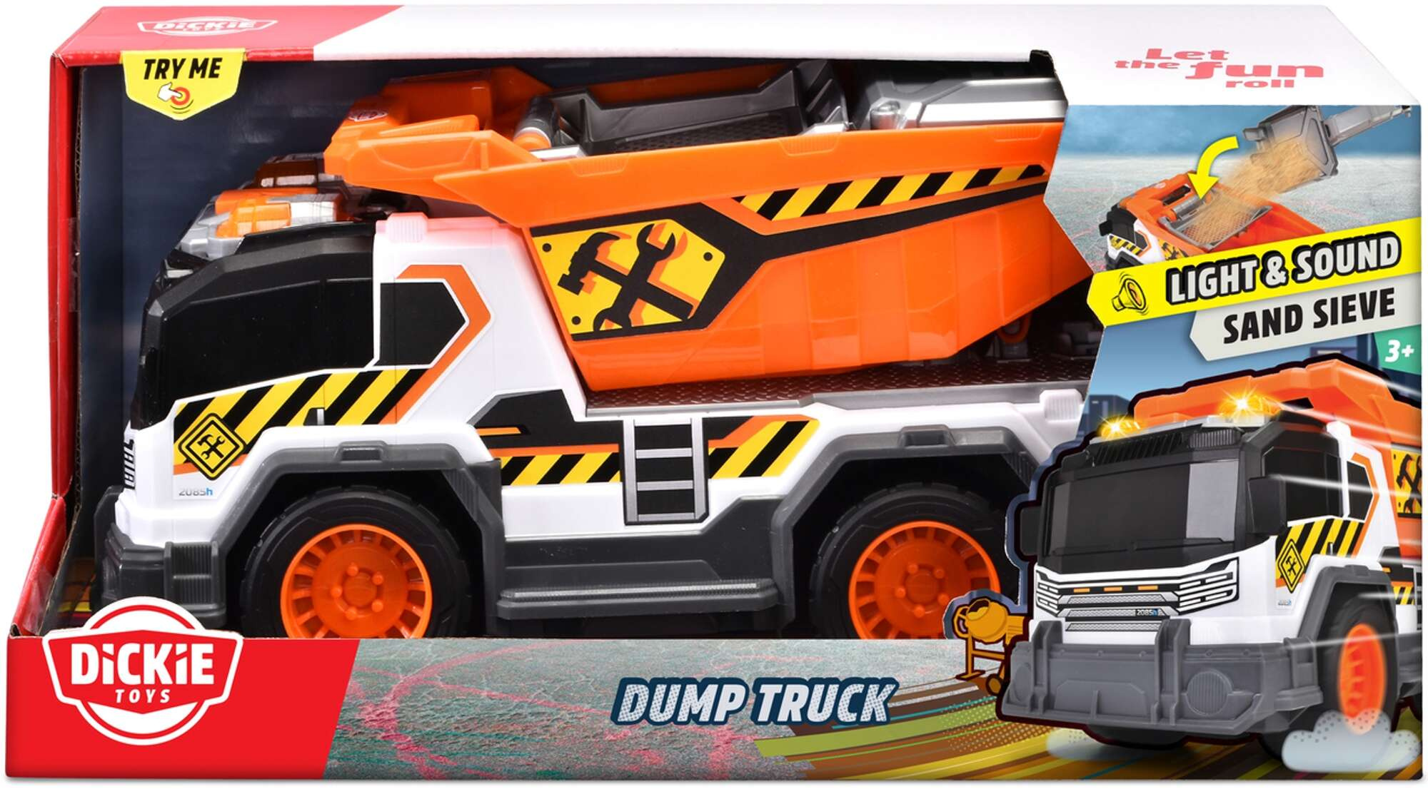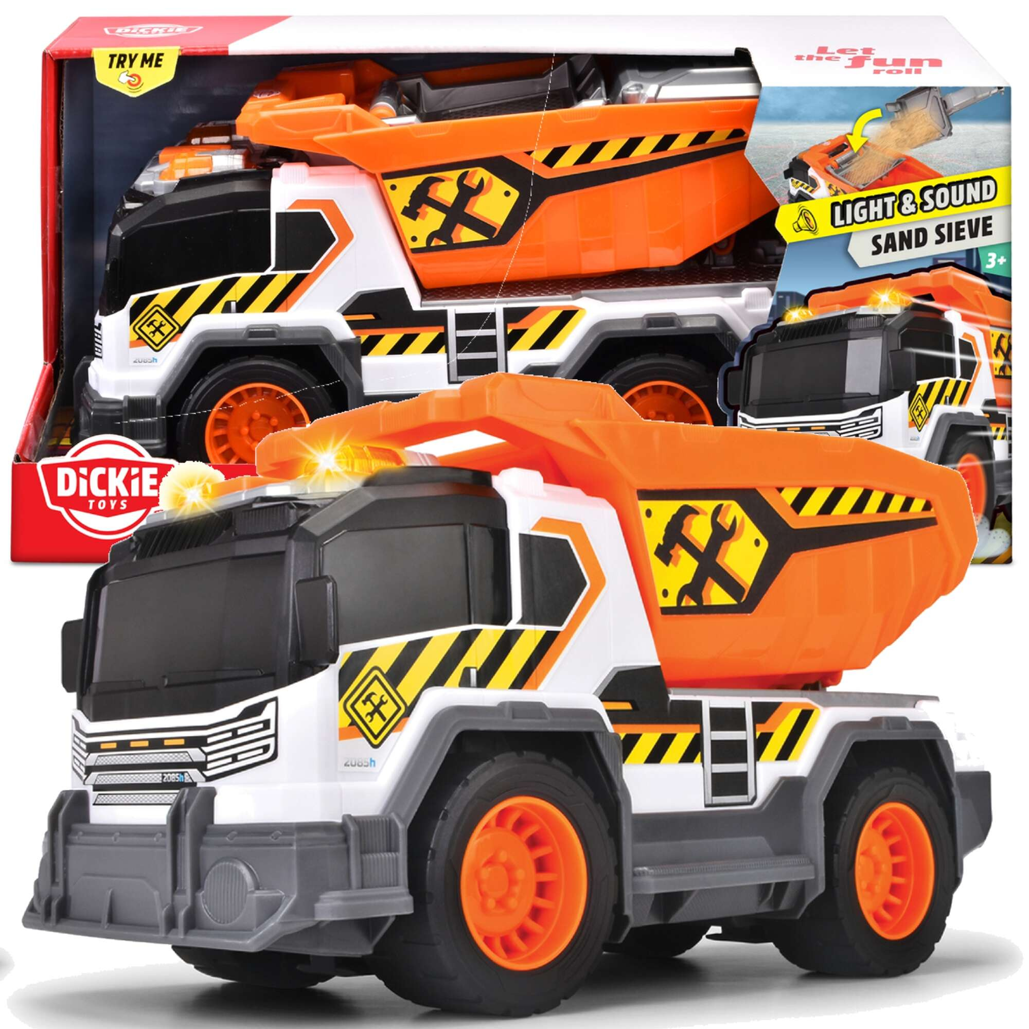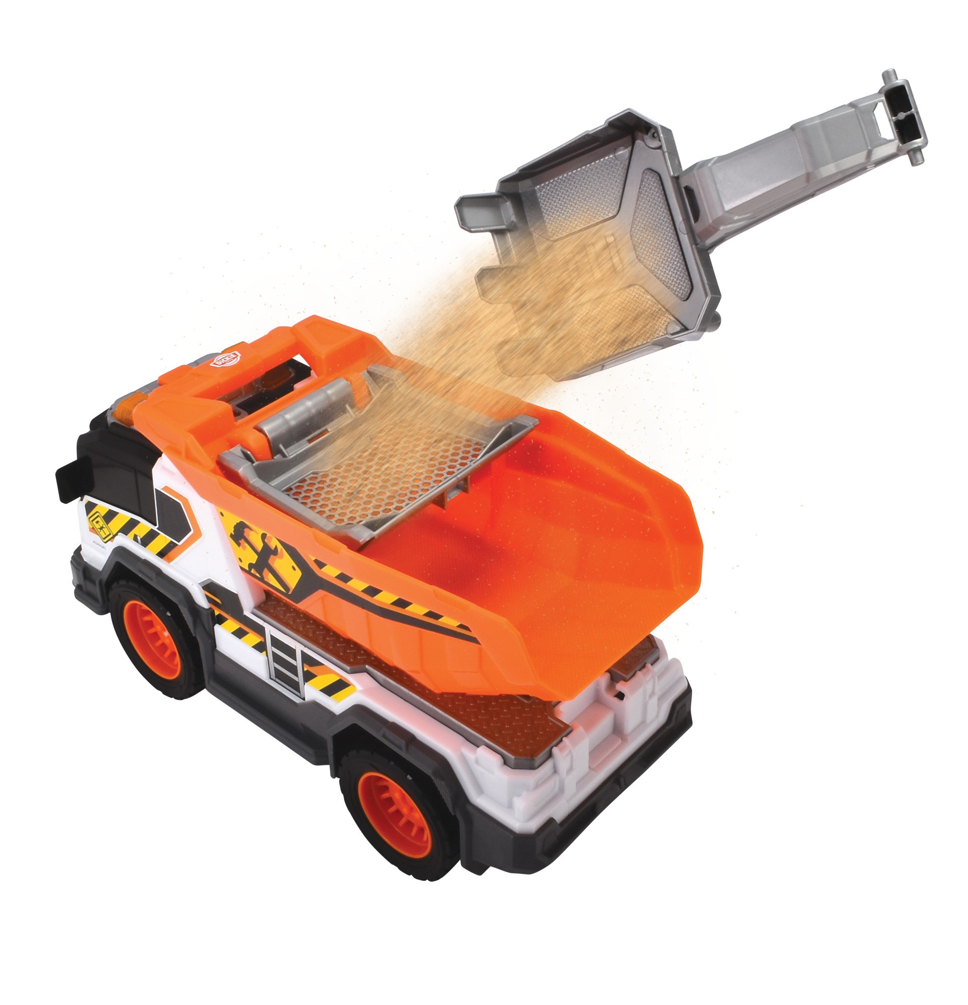 Die Arbeiter müssen alle Arten von Aufträgen des Unternehmens erfüllen und verschiedene Materialien mit speziellen Maschinen transportieren. Dieser funktionsreiche Kipplaster von Dickie Toys wurde für Kinder ab 3 Jahren entwickelt und istdas beste Spielzeug für angehende junge Baumeister. Drücken Sie einfach den kleinen orangefarbenen Knopf auf dem Dach, um die echten Geräusche und Lichter des Baufahrzeugs zu hören.