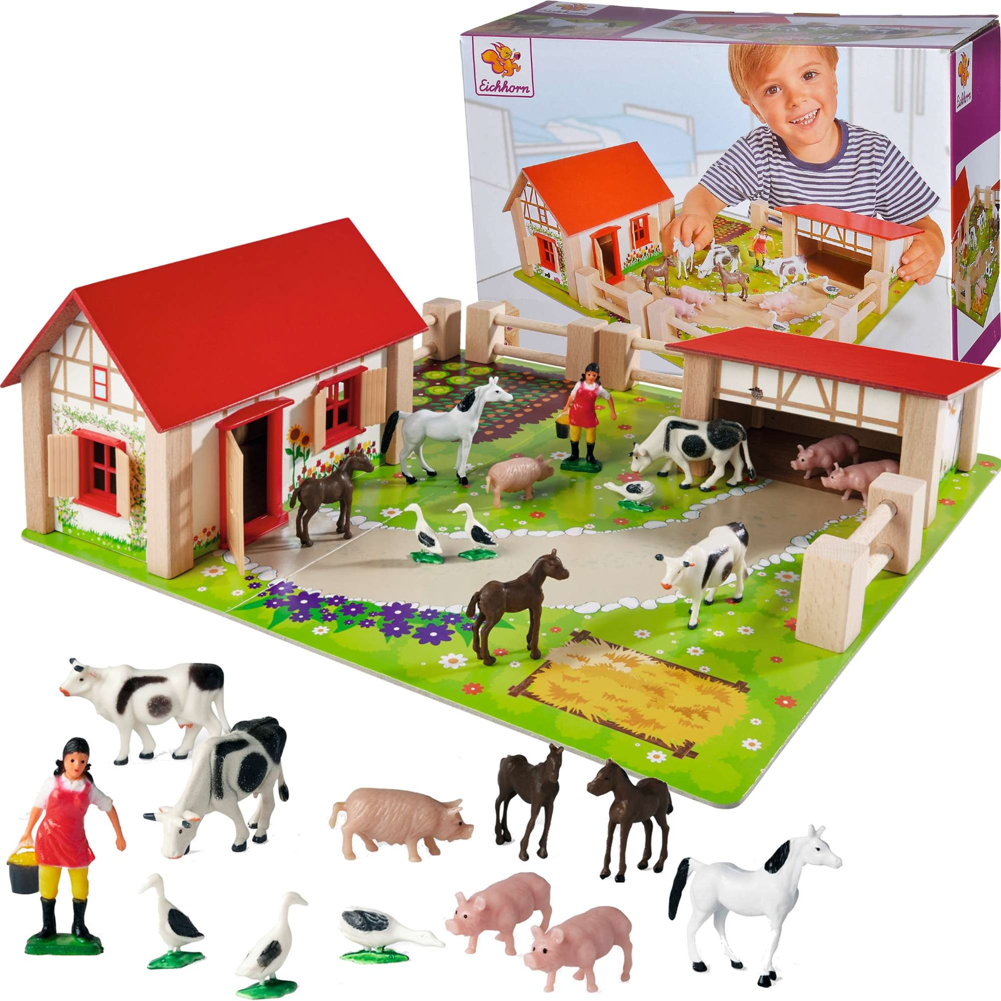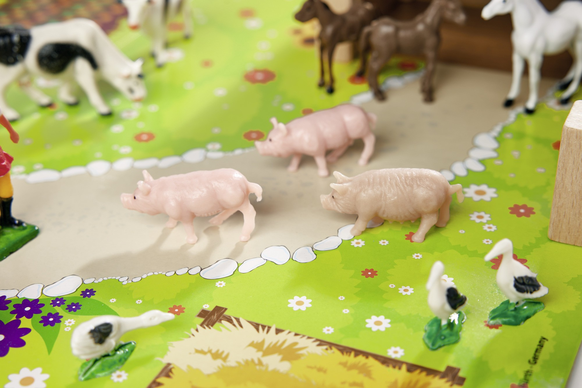 - 23 Teile enthalten: Bauernhaus, Ställe, farbiger Boden, Zäune, Aufkleber und 12 Figuren