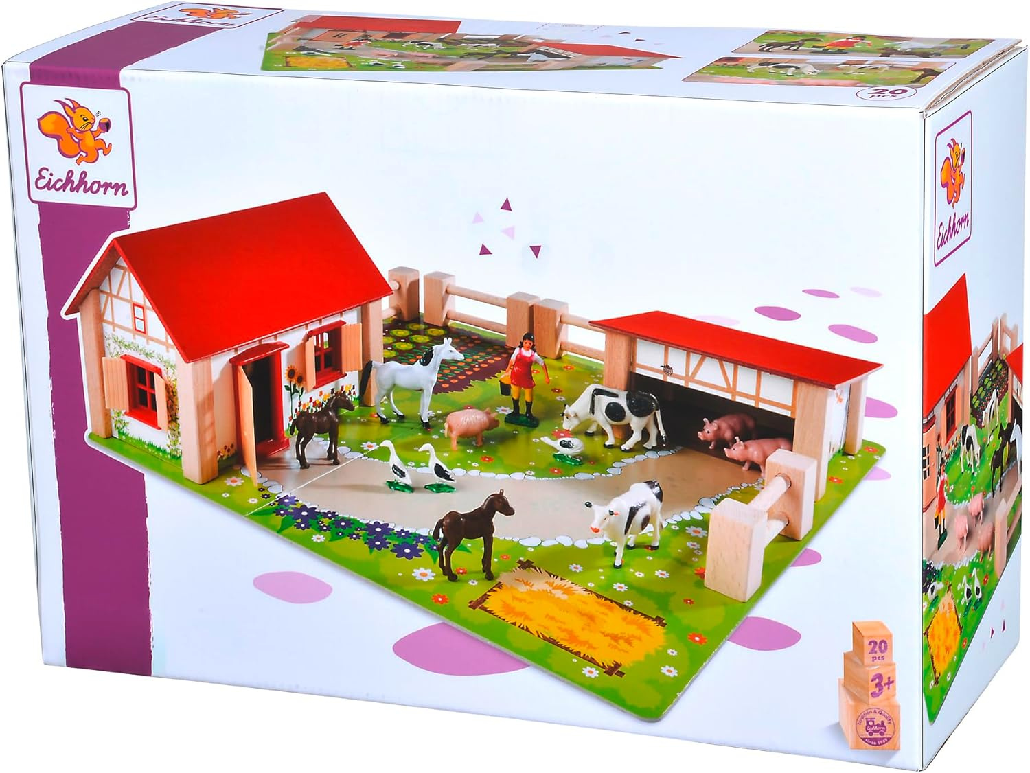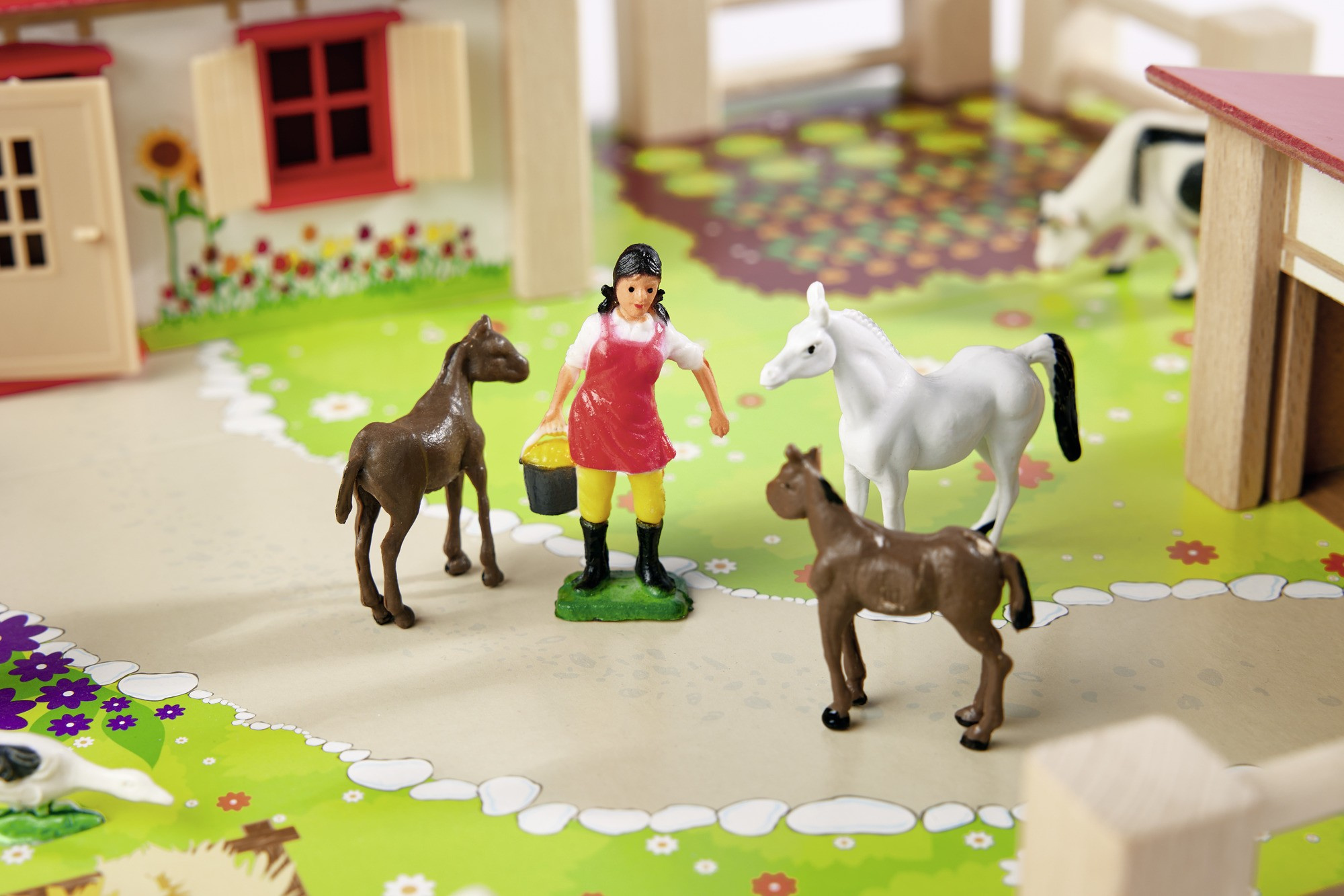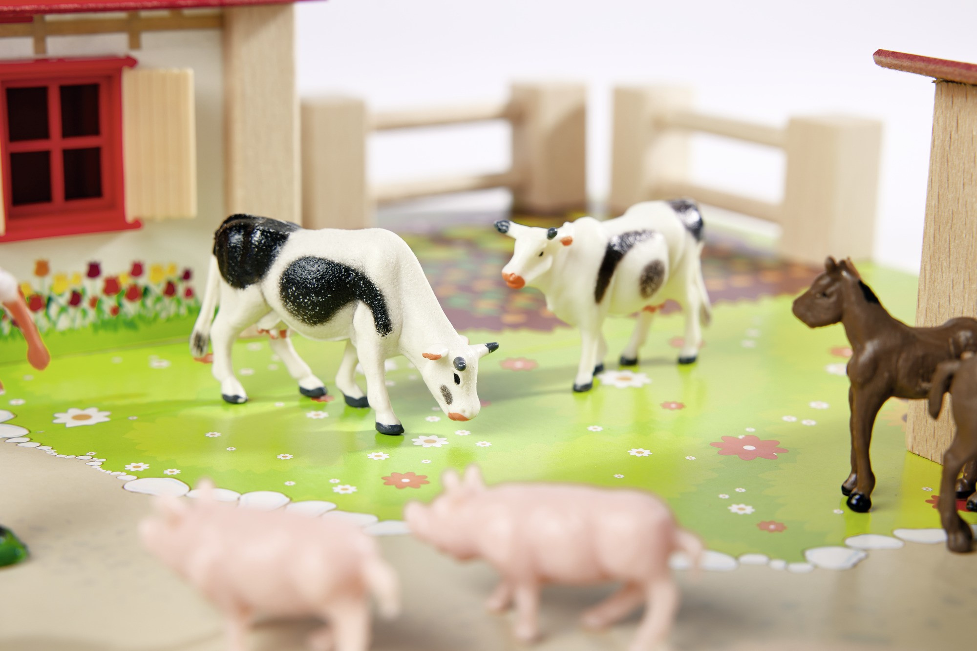 - Das Set enthält 23 Elemente: Bauernhaus, Stall, farbiger Boden, Zäune, Aufkleber und 12 Figuren