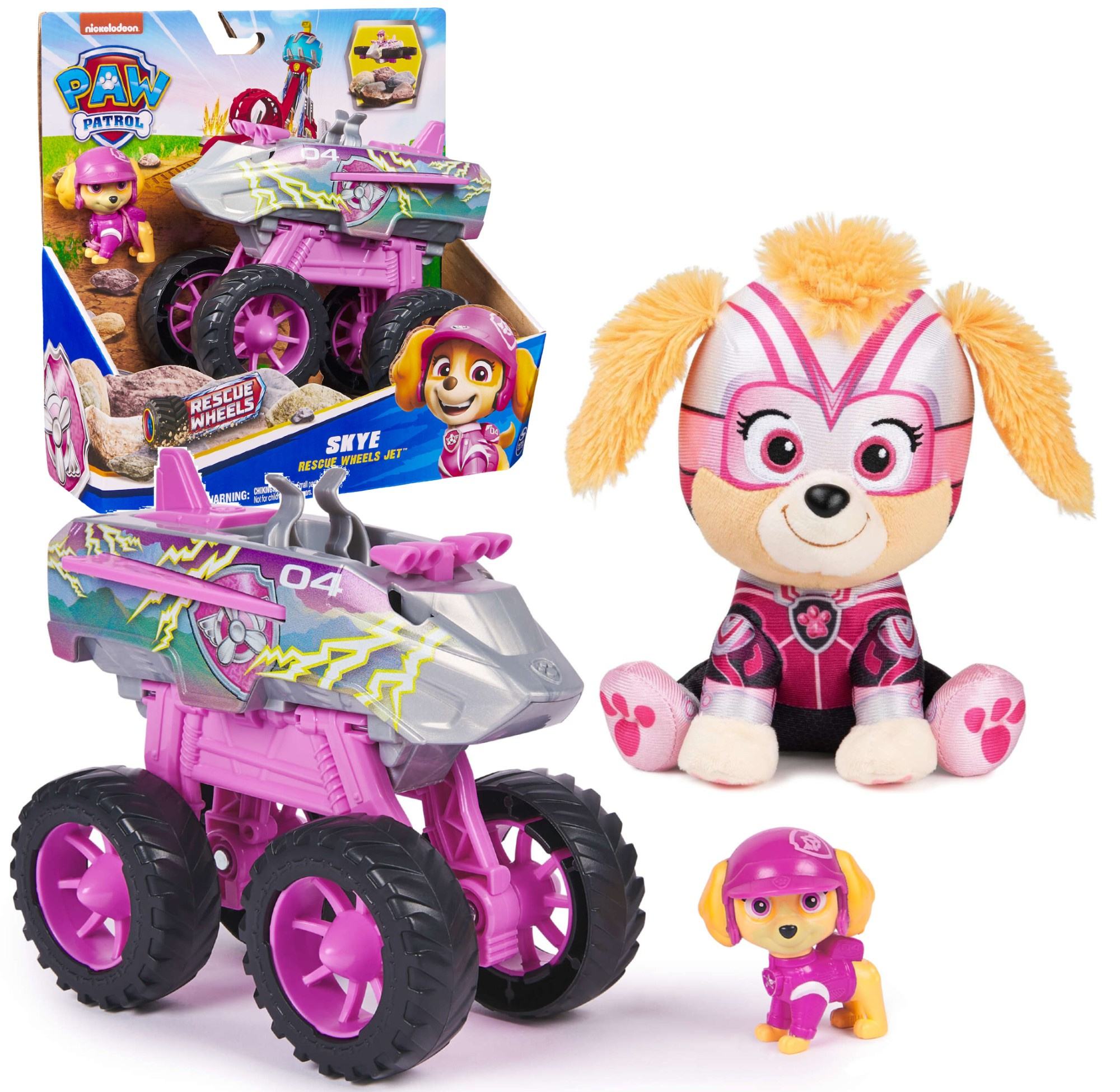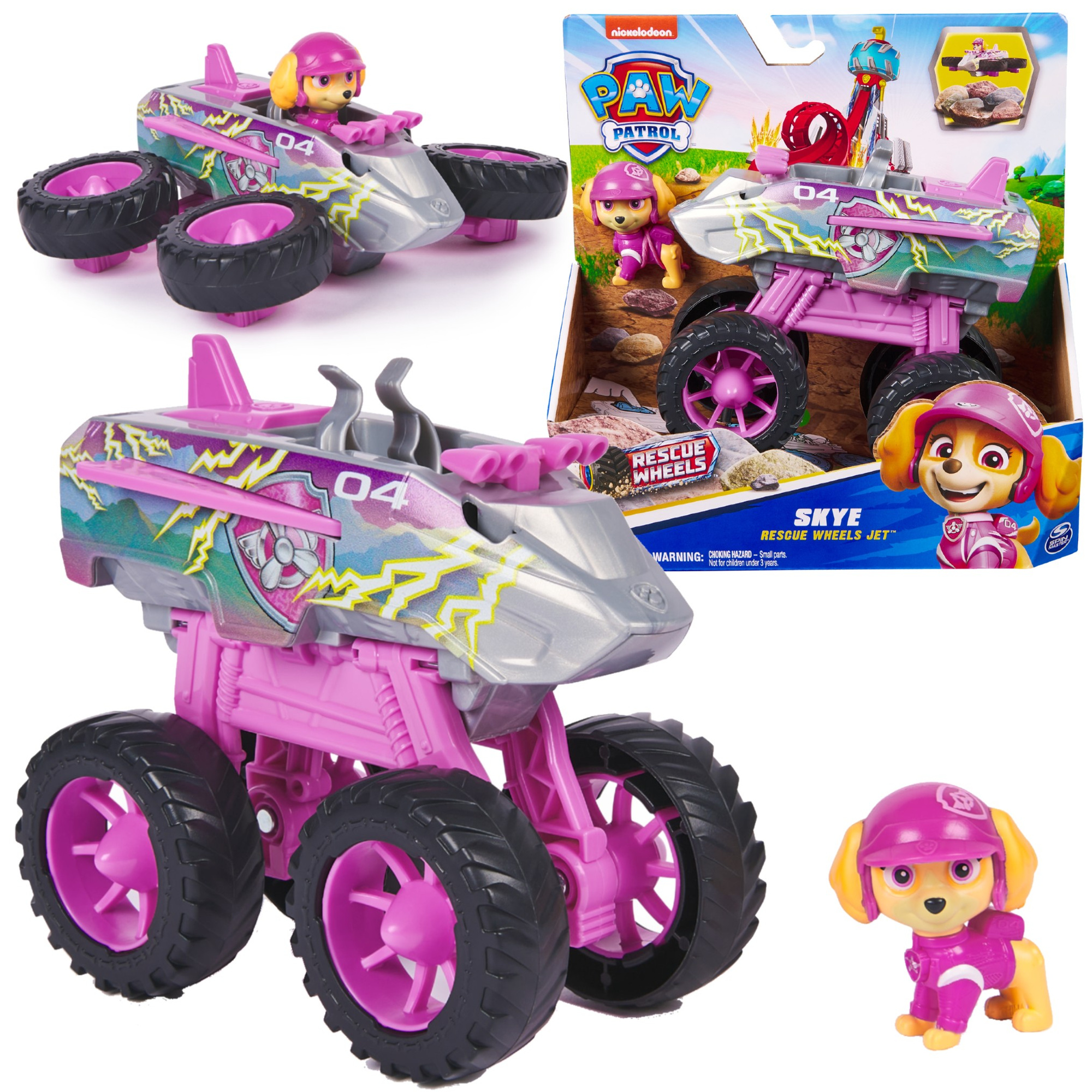 - Skye ist ein Hund der Rasse Cockapoo. Die Figur, die den Welpen darstellt, spiegelt die Serienfigur getreu wieder. Sie trägt ein rosafarbenes Outfit mit weißen Elementen und einen rosafarbenen Hut. Der Welpe kann im Fahrzeug platziert werden, wodurch er z