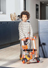 Das Herzstück des humbi_p lzet ist ein schwarz-weißer Wagen mit roten Rädern, mit denen er sich auf ebenen Flächen leicht bewegen lässt, und einem bequemen roten Griff zum Schieben des Wagens. Dieser Kinderwagen ist mit allerlei Zubehör ausgestattet, damit das Kind beim täglichen Putzen mitmachen oder die Eltern bei dieser Tätigkeit imitieren kann. Hier finden Sie einen rot-grauen Kehrer mit roter Kehrschaufel, einen rot-grauen Besen, einen Wischmopp mit abnehmbarem weißem Tuch, eine nachgemachte Reinigungsflüssigkeit und einen weißen Müllsack. Das Set ist einfach zu benutzen und mit viel Liebe zum Detail hergestellt. Alle enthaltenen Zubehörteile sind Miniversionen von echtem Reinigungszubehör, so dass das Kind wirklich das tun kann, was die Eltern tun.