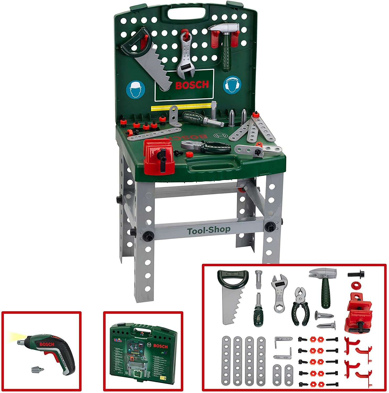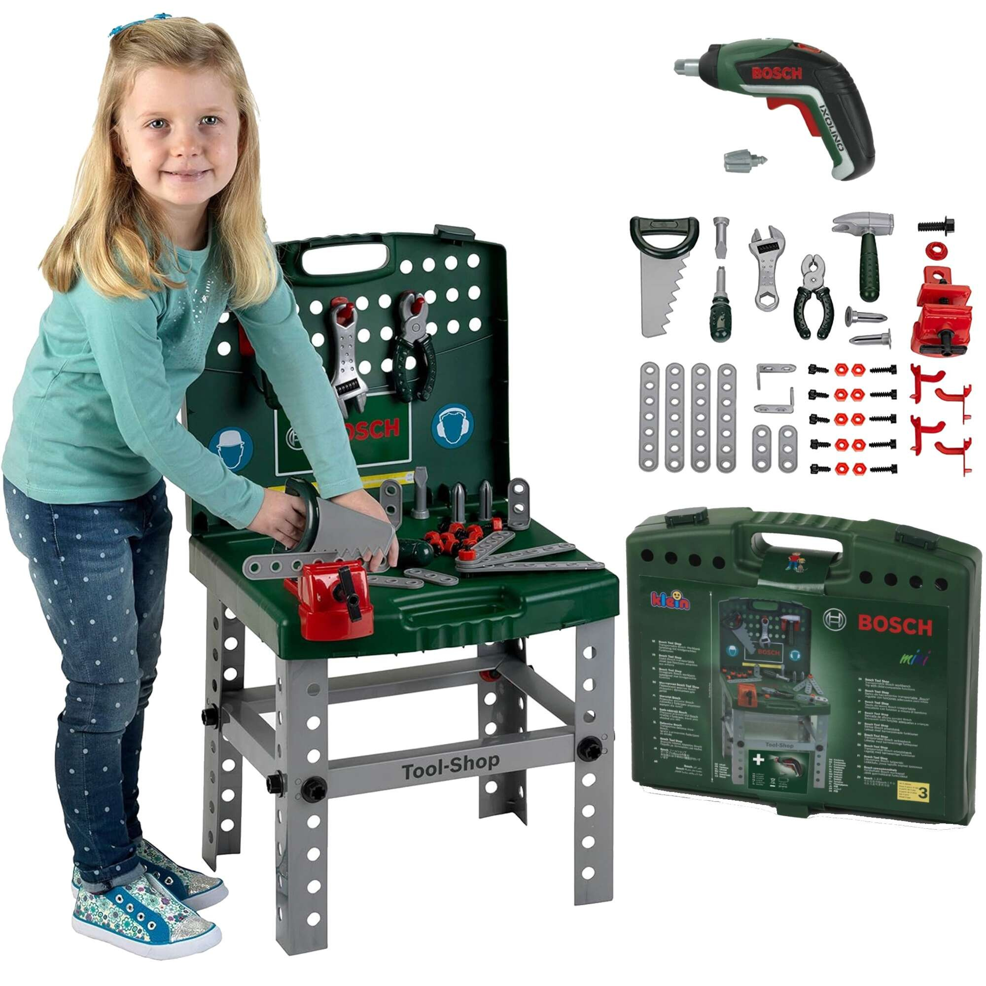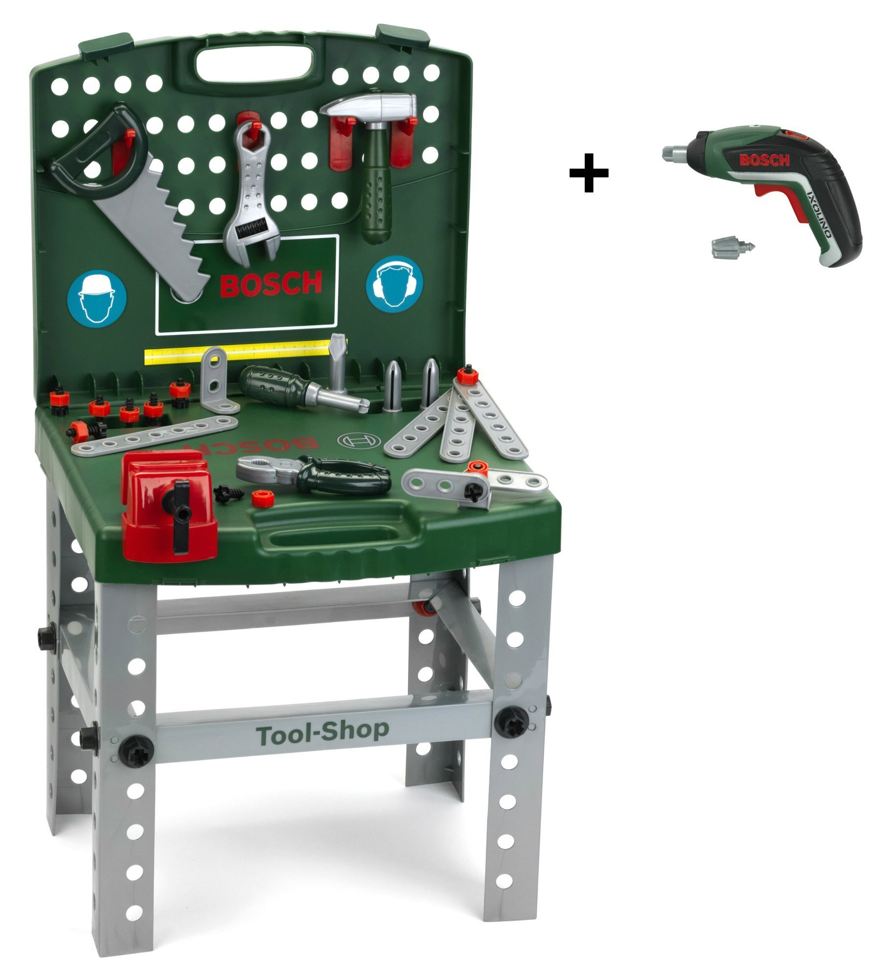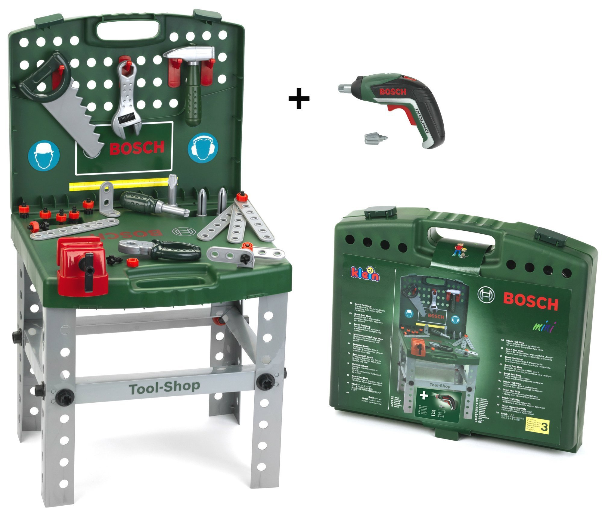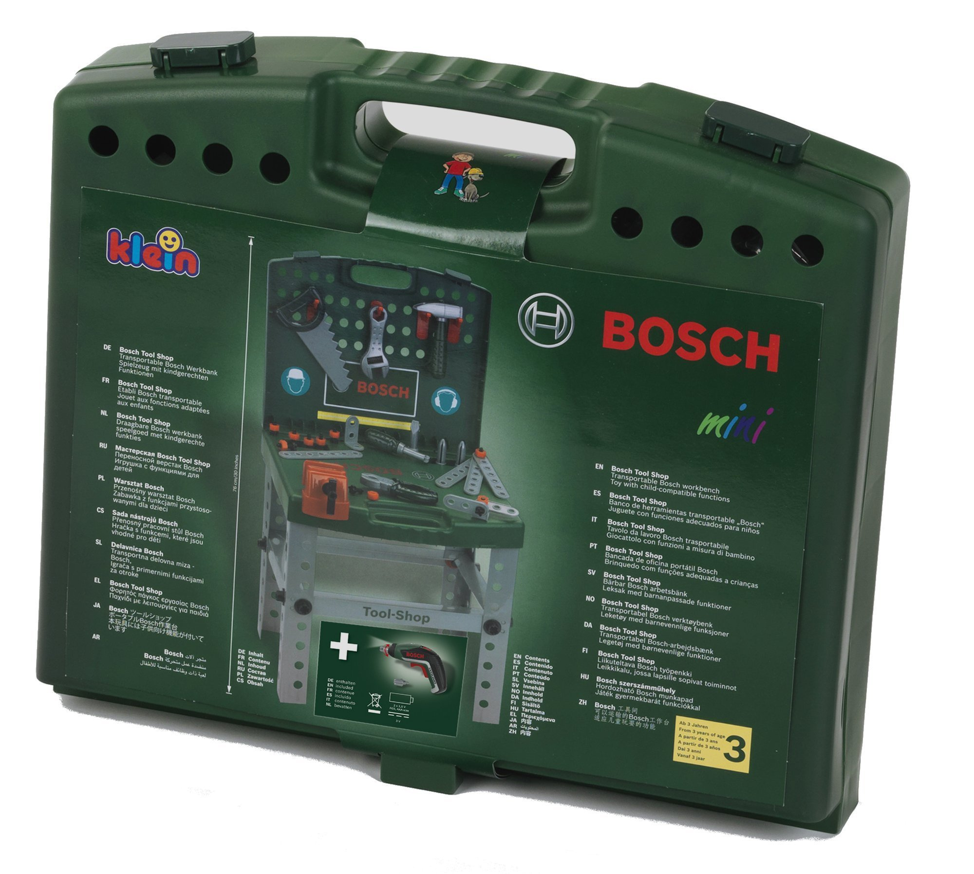 - Aufgeklappt, im dunkelgrünen Koffer, Werkstatt mit Werkzeugen für Kinder (Schraubenzieher mit Lichteffekt, Hammer, Zange, Schraubenschlüssel, Säge, Schraubendreher, Schraubstock), von Theo Klein unter der Bosch Mini-Lizenz.