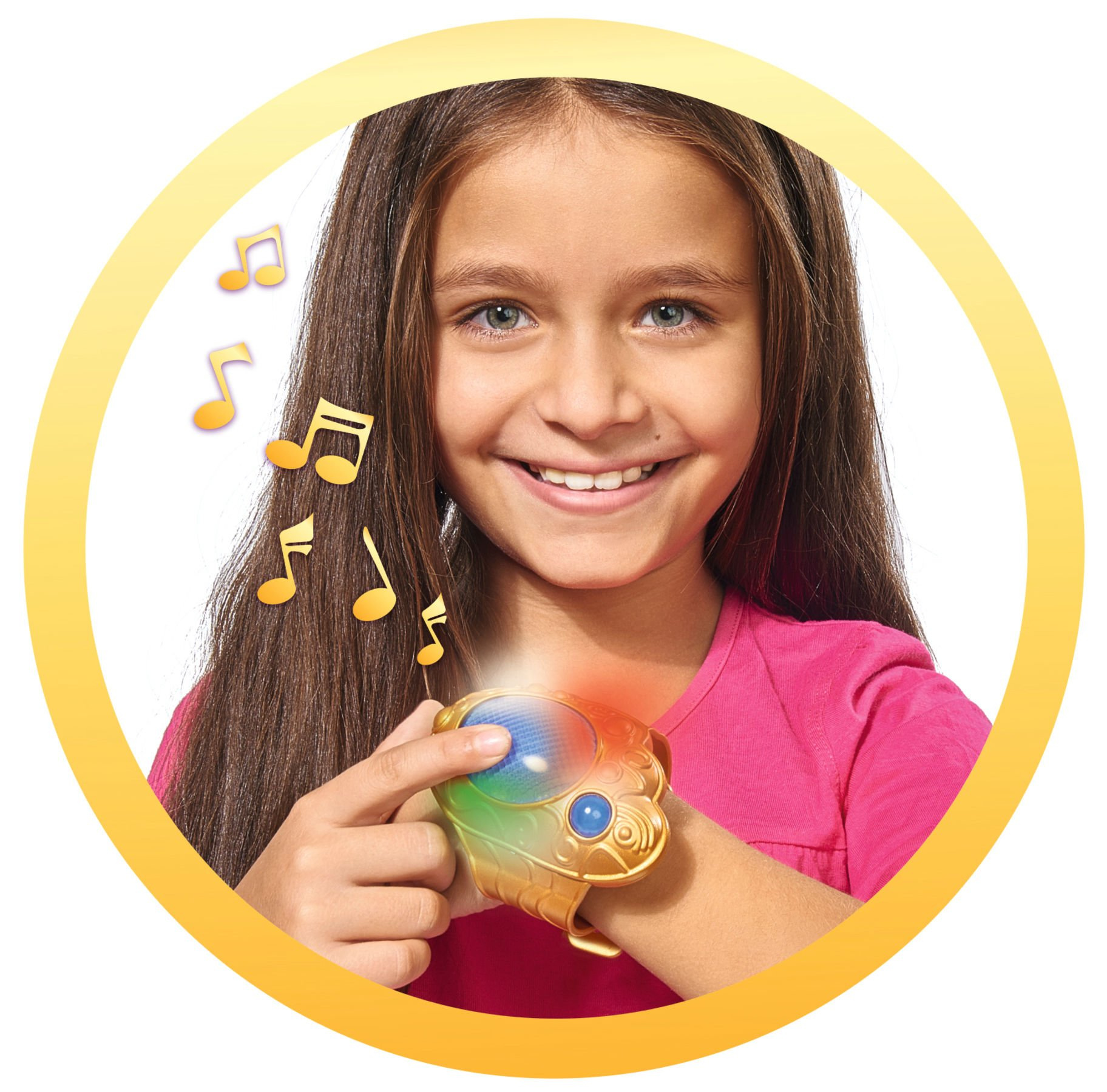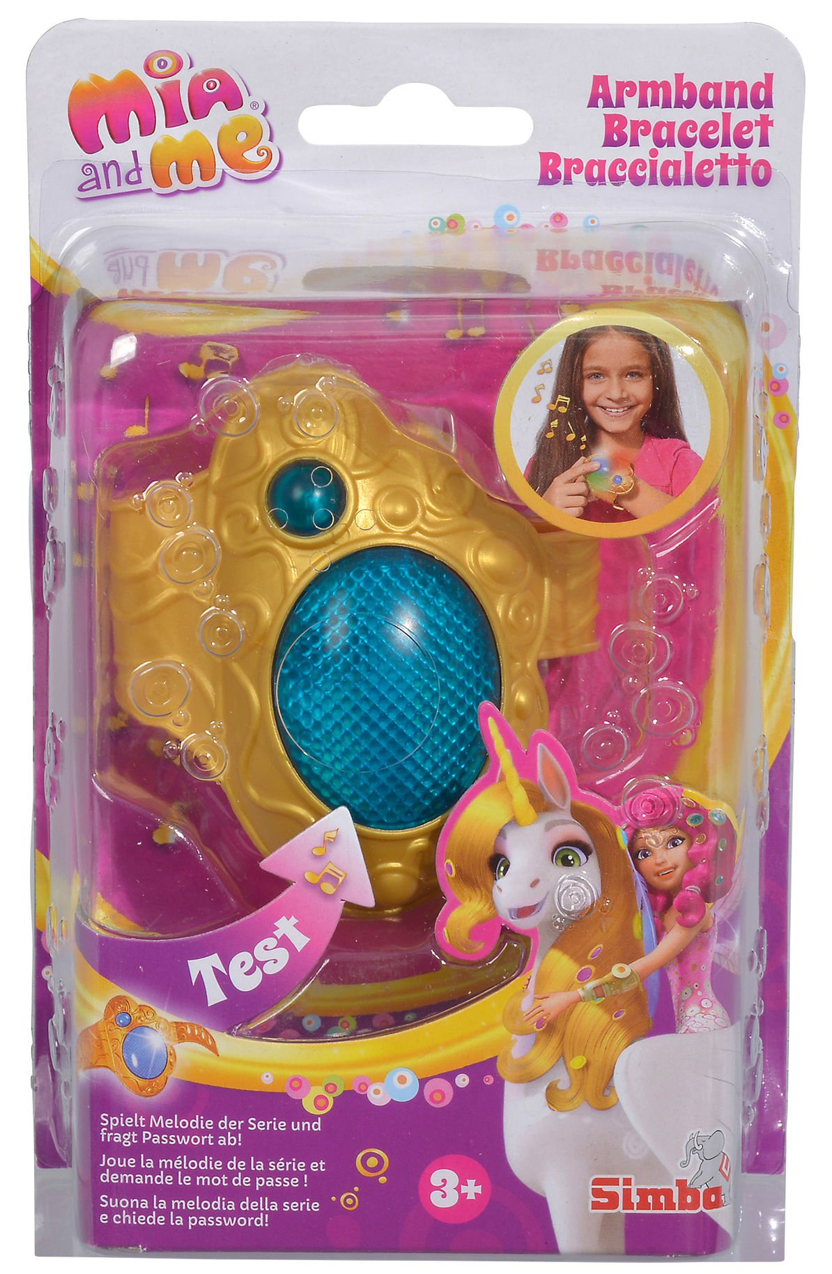 - Ein goldenes Armband mit einem blauen Licht, das, wenn es gedrückt wird, in verschiedenen Farben leuchtet und verschiedene Töne von sich gibt, darunter ein Märchenlied Mia and me.