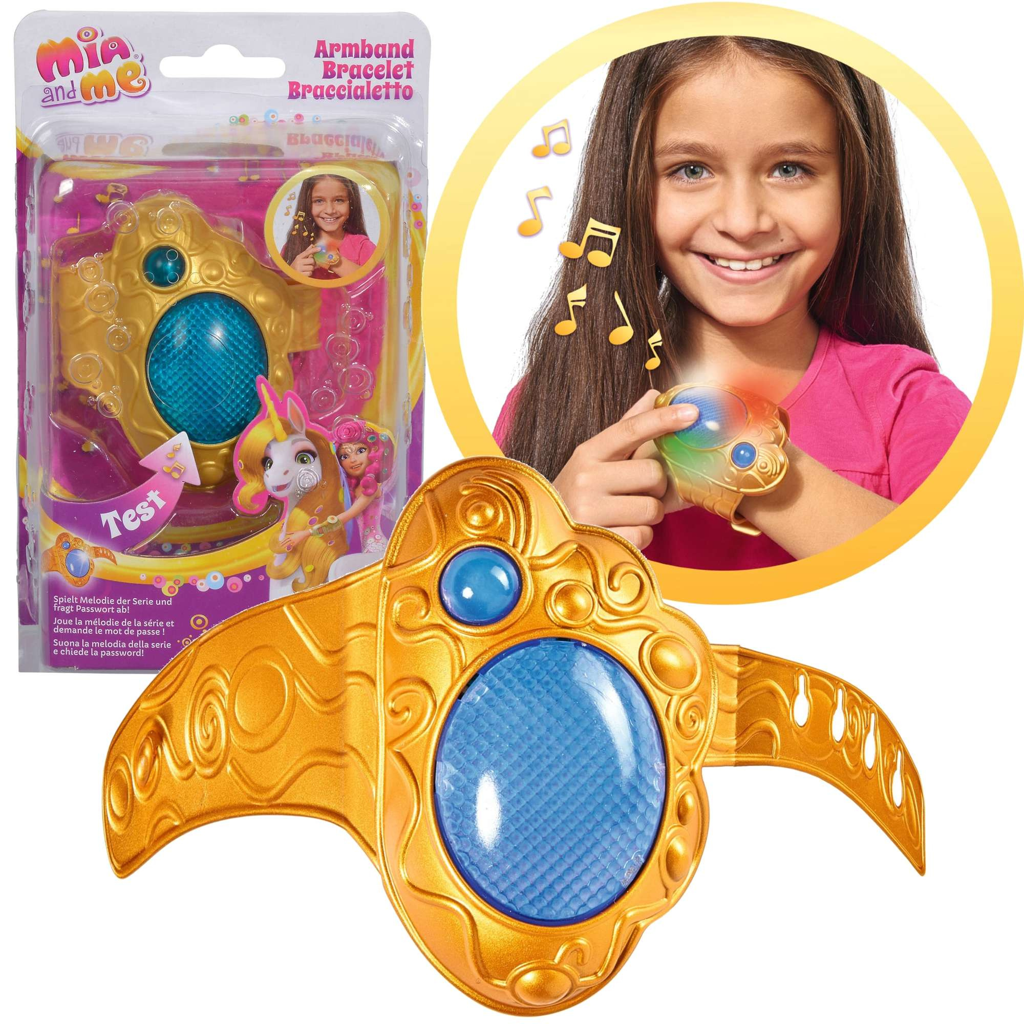 Goldfarbenes Armband mit einem blauen Licht, das beim Drücken in verschiedenen Farben leuchtet und verschiedene Geräusche macht einschließlich eines Liedes aus dem Märchen Mia and me.